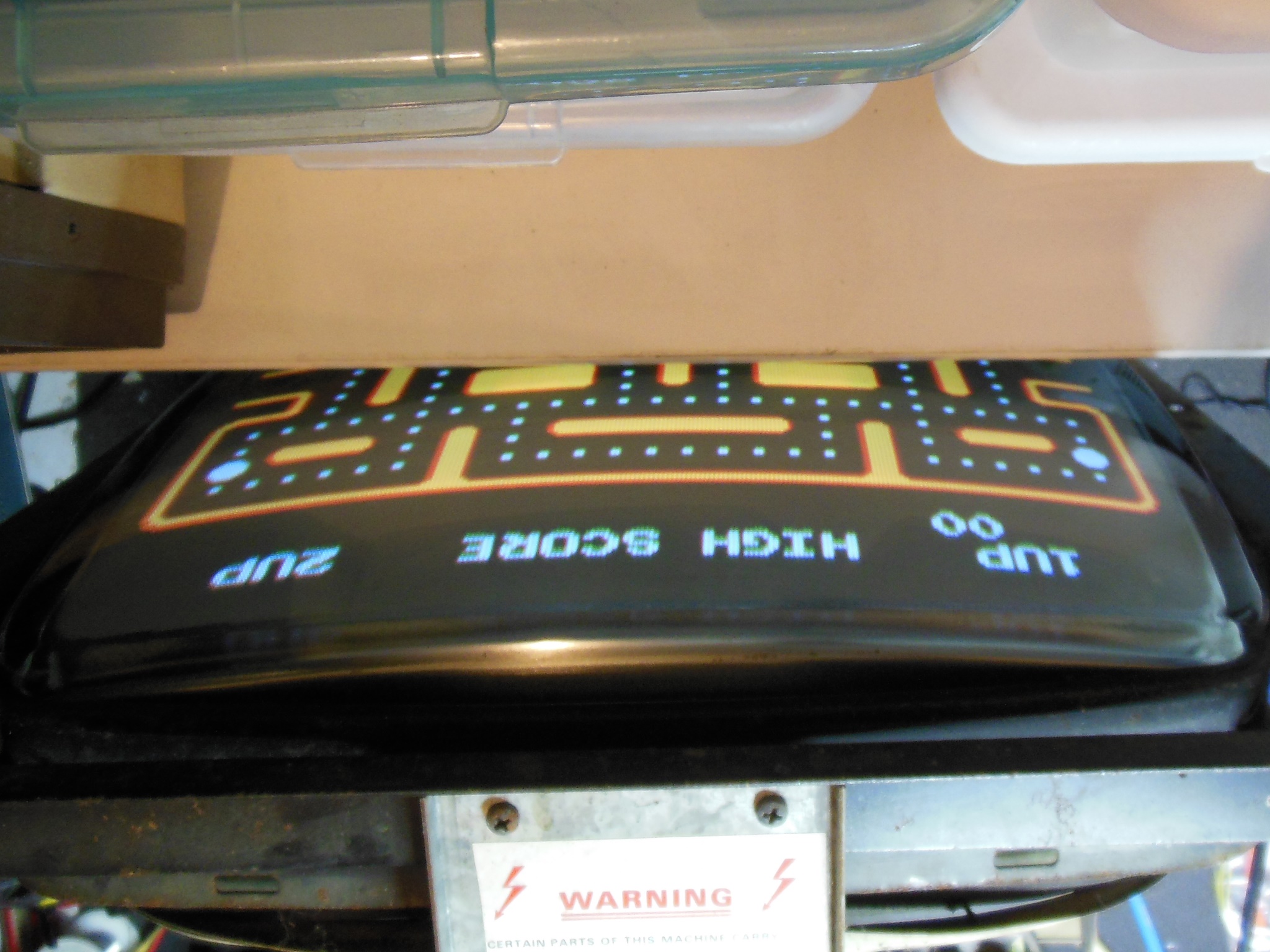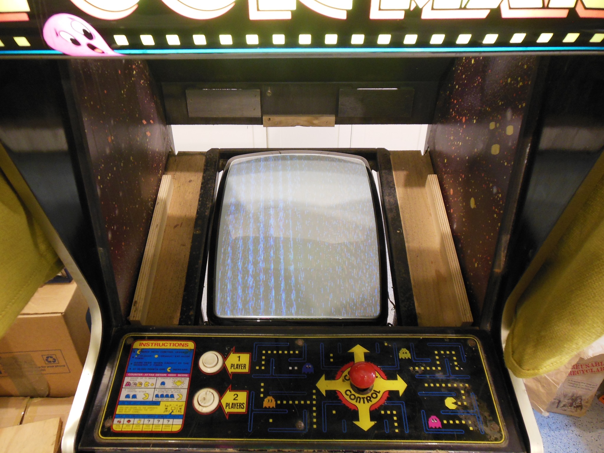 The replacement monitor came from a Quasar cabinet converted to Mr. Do! and thus the original inverting input PCB had been modified to convert it to non-inverting input. The original monitor in Puck Man had a factory non-inverting input PCB that I swapped into the replacement monitor for consistency prior to installing it into the cabinet.
