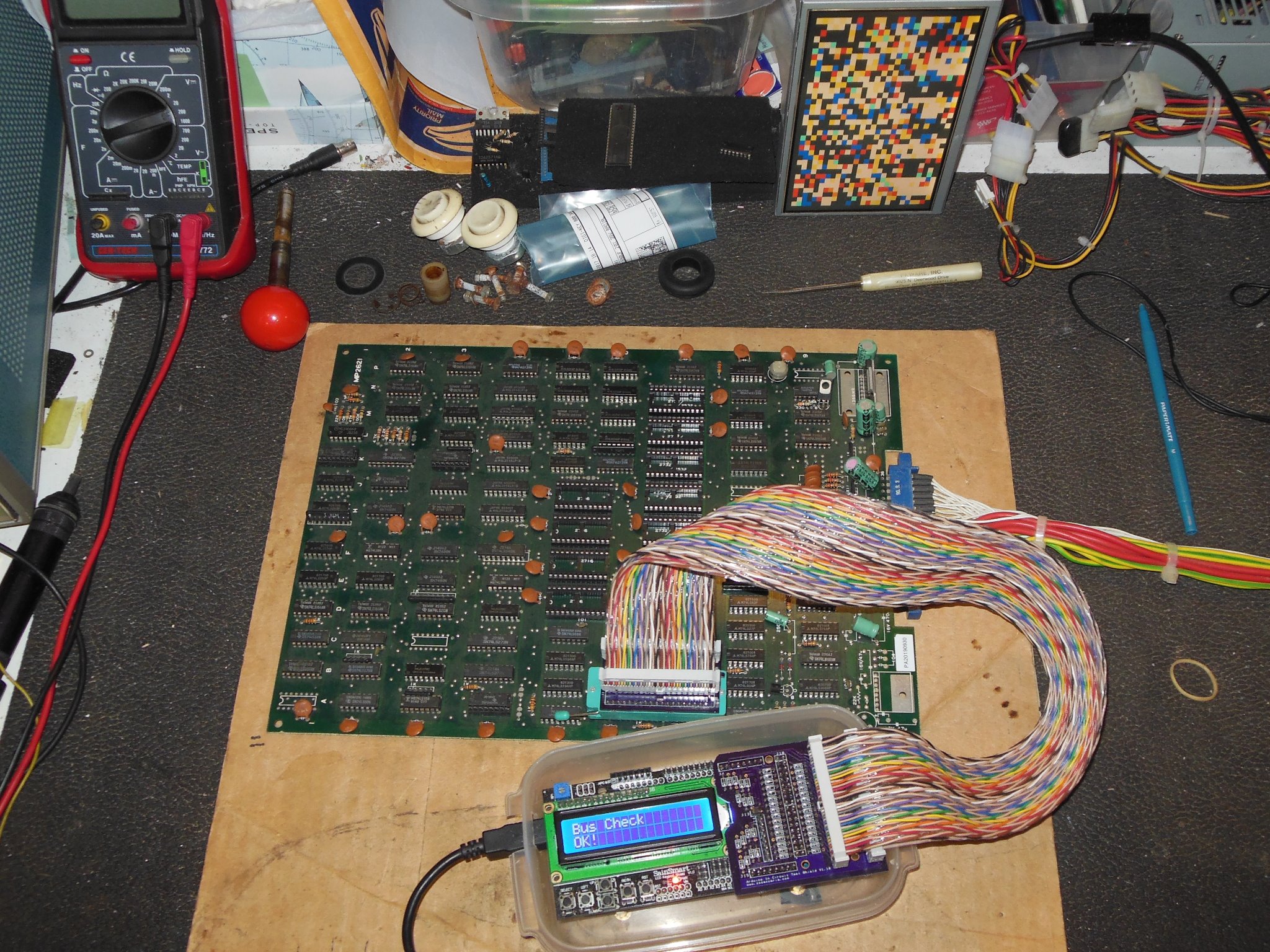 The behaviour on the bench was the same as in the cabinet, confirming a game PCB issue. This particular PCB didn't have its Z80 in a socket and thus first needed it de-soldered and a socket fitted to allow the Arduino ICT to plug in. With the ICT "ROM Check All" passed OK but "RAM Check All" flagged IC 4H (2114) as bad. Since the other nibble of the byte was passing OK (ruling out an access problem with the RAM in general) I suspected the RAM was bad. Replacing IC 4H fixed the game and it ran on the bench for several hours without issue.
