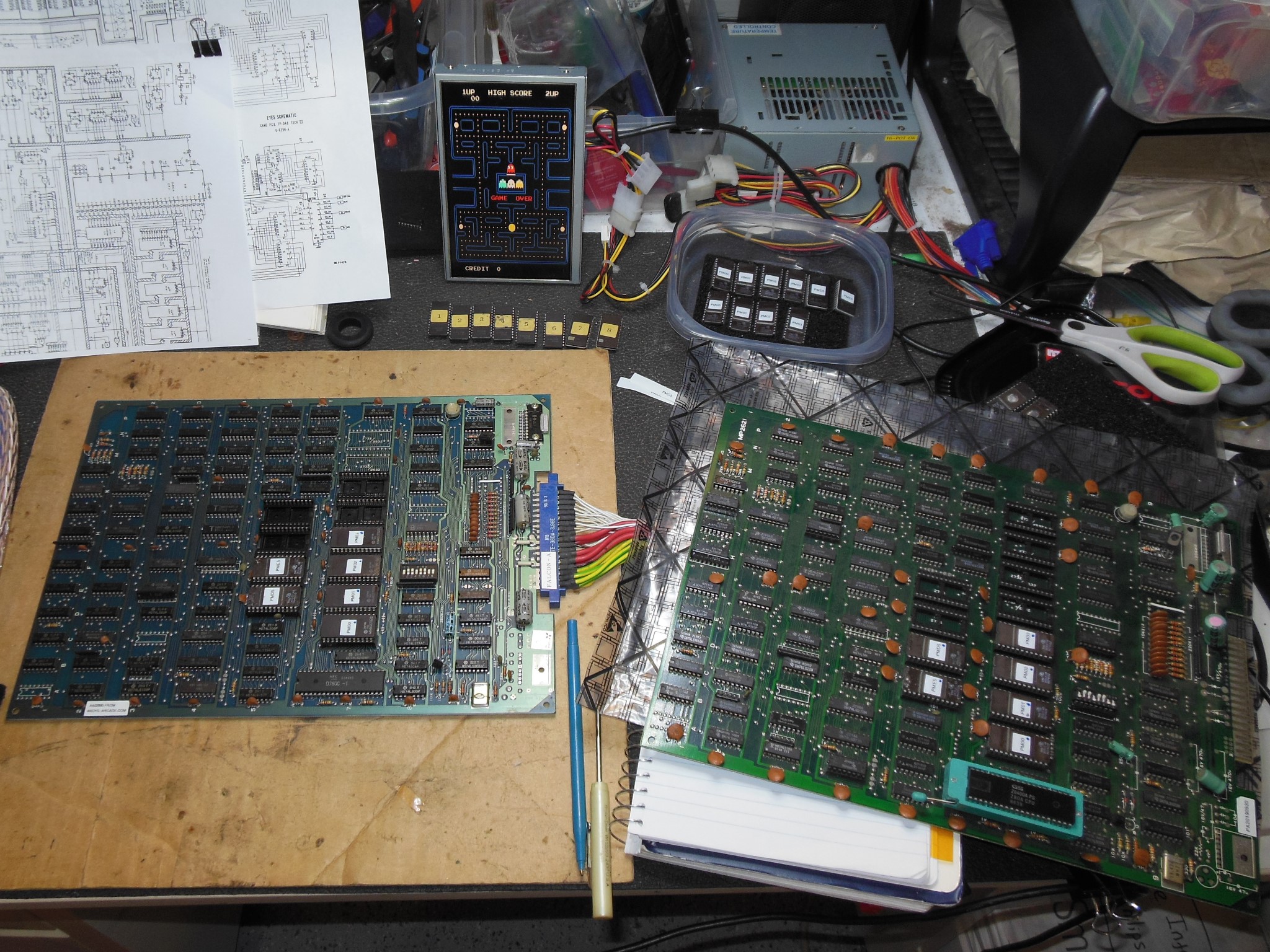 The second game PCB that was running Ms. Pacman I converted to Puck Man so that I had two working game PCBs - one to use and one spare for the show.