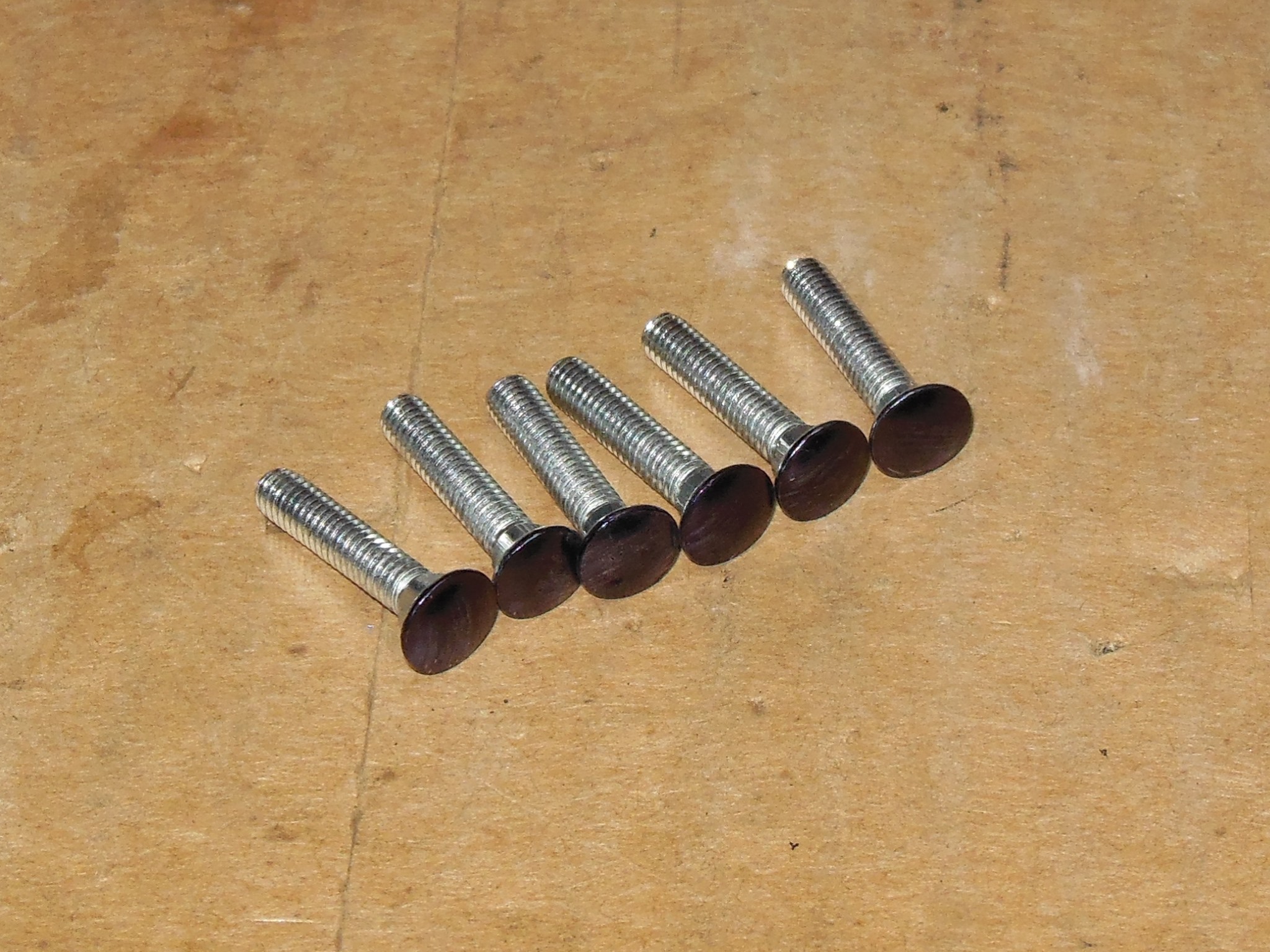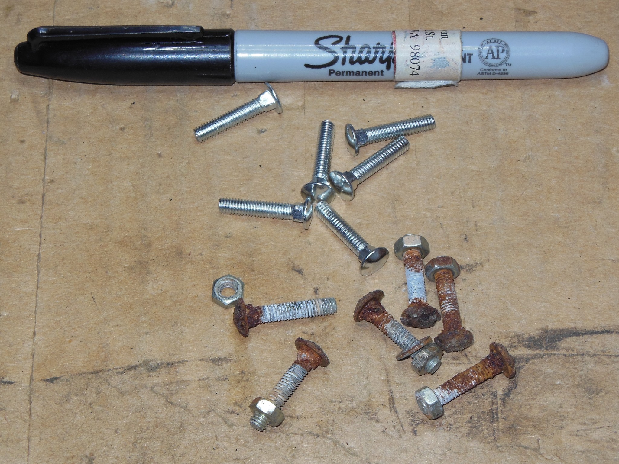 The original control panel bolts were heavily rusted on the top with little actual metal remaining to clean through. I thought they may be difficult to get but in fact were readily available from eBay, square neck head semi-circular carriage screws or shelf bolts (M4 x 20mm) for $13 for 20. The replacement bolts were bright zinc whereas the originals were some sort of dark anodized. I coloured the tops with a black Sharpie for something similar.