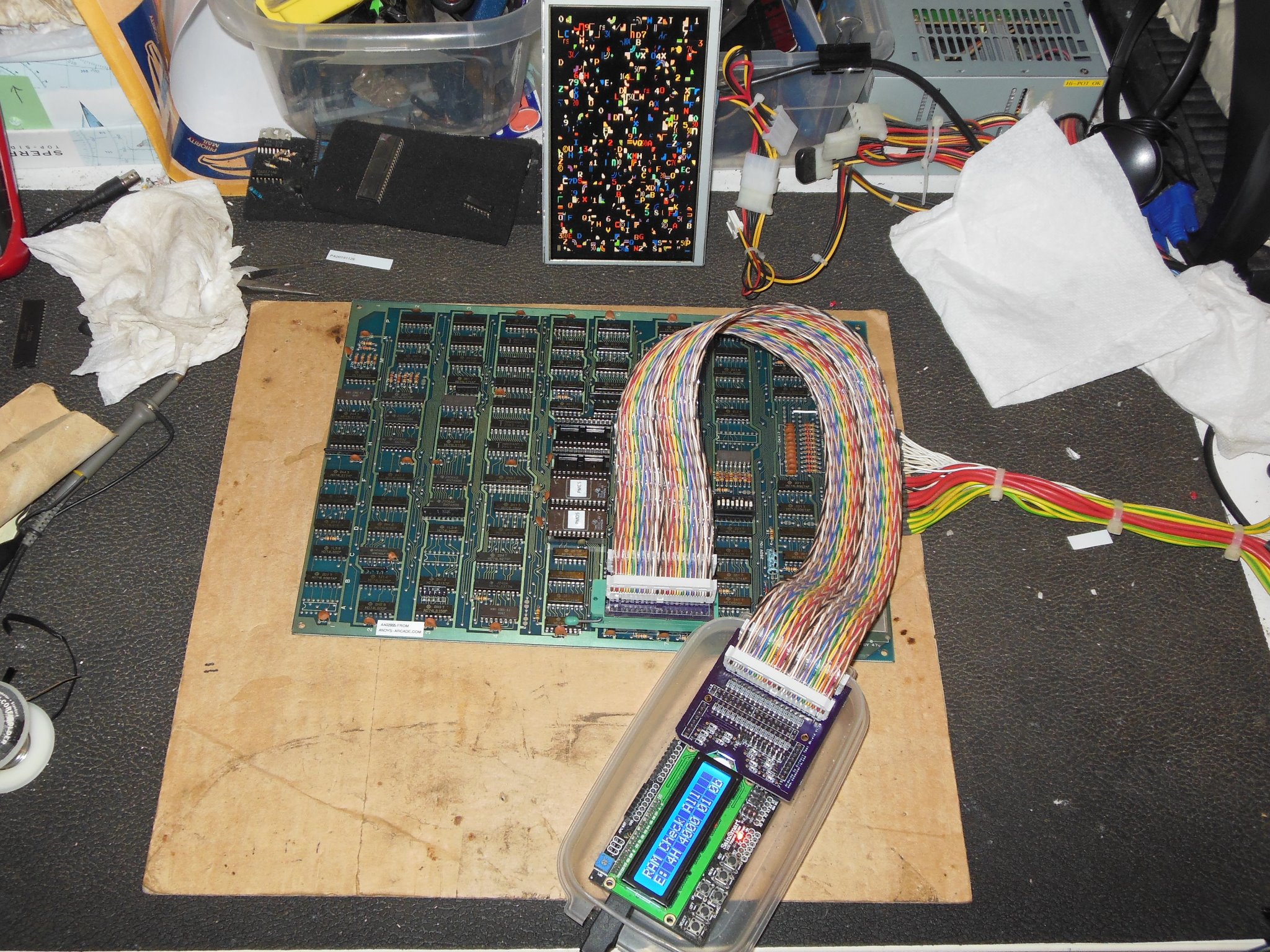 The "MP2621" Falcon Ms. Pacman PCB I had was missing all the EPROMs and the socketed Z80 so I took the opportunity to write support for Pacman on the Arduino ICT. Though the board was stripped the RAM tests all passed so I was hopeful a new set of Puck Man EPROMS may get it going.