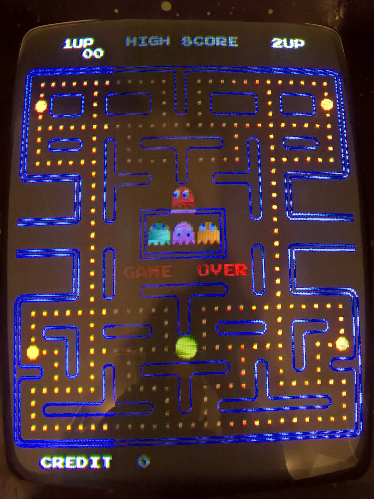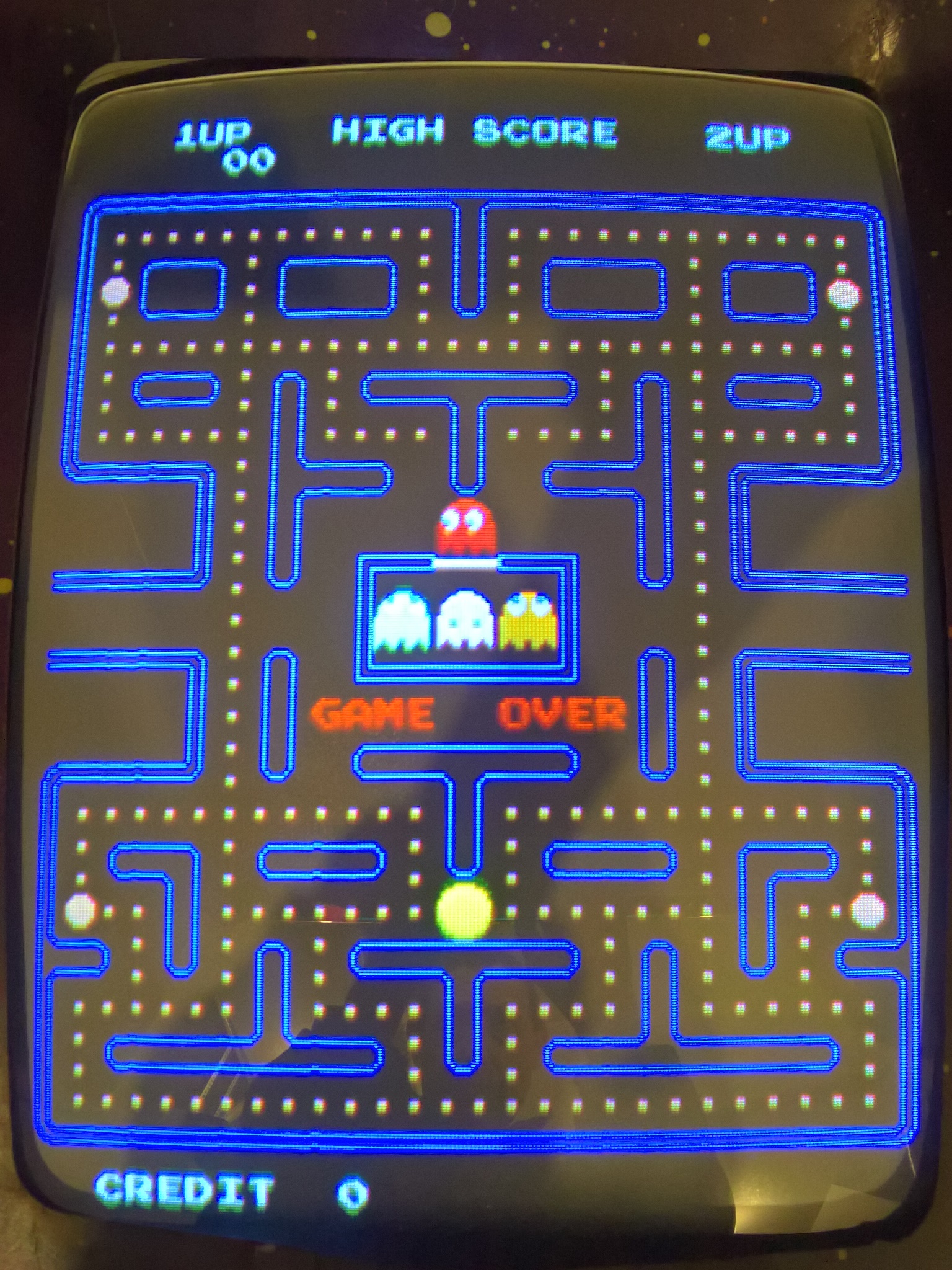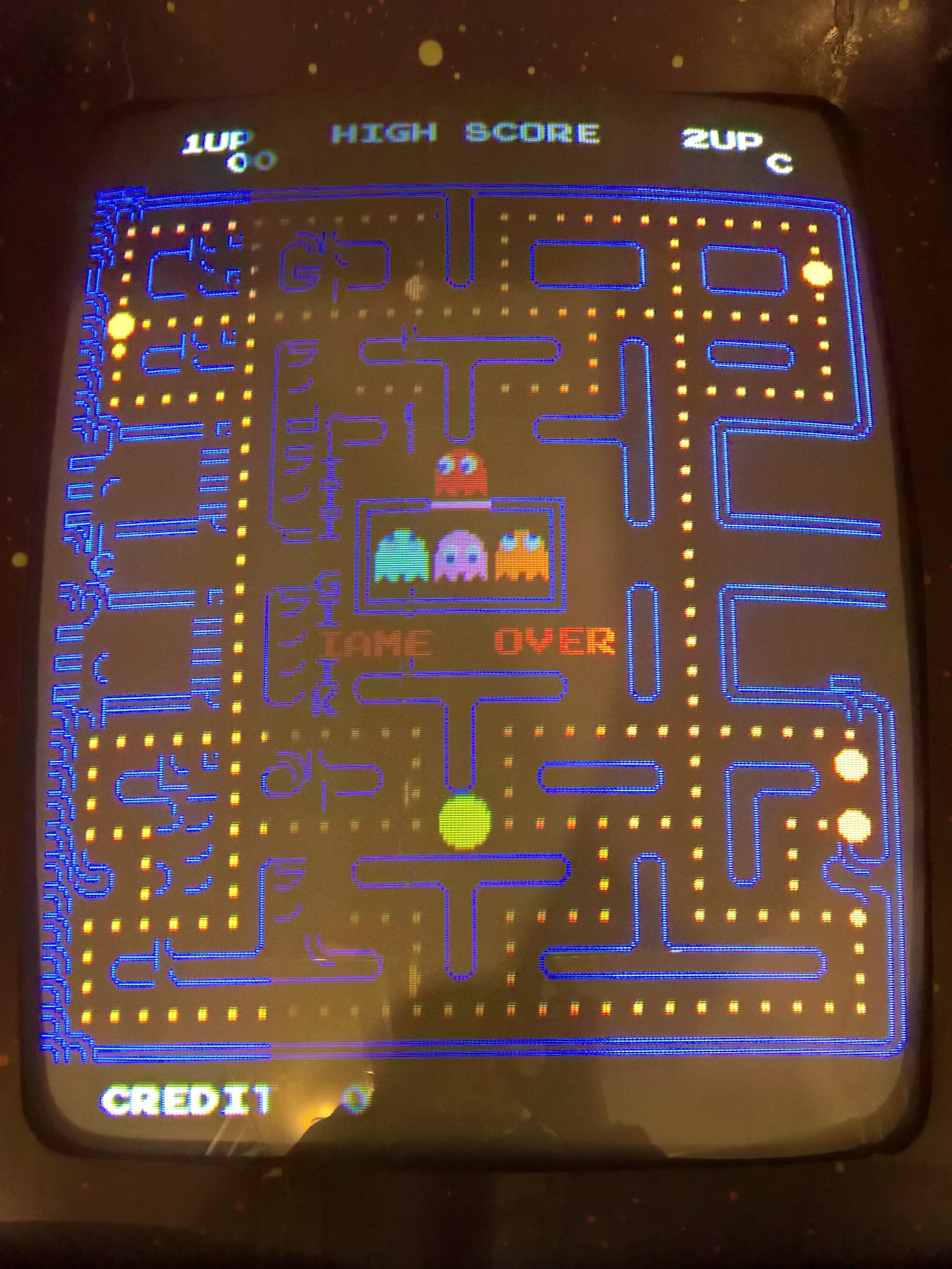 Putting everything back together in the cabinet with the Puck Man PCB installed initially yielded no video sync. This turned out to be simply a broken wire on the video connector. With that repaired the game came up working OK. The picture quality wasn't great, but stable.