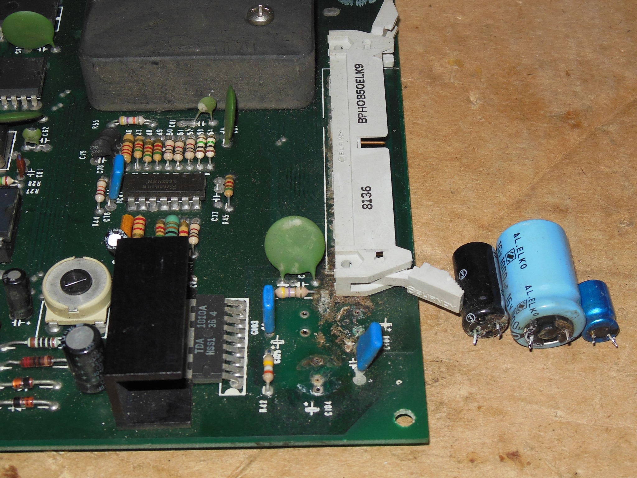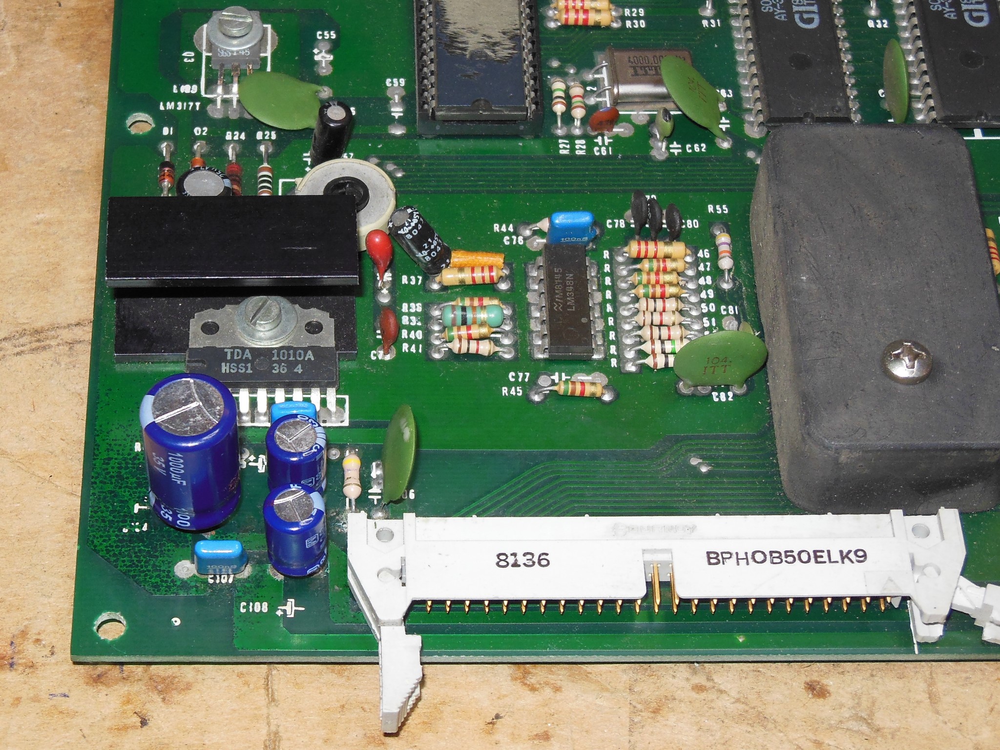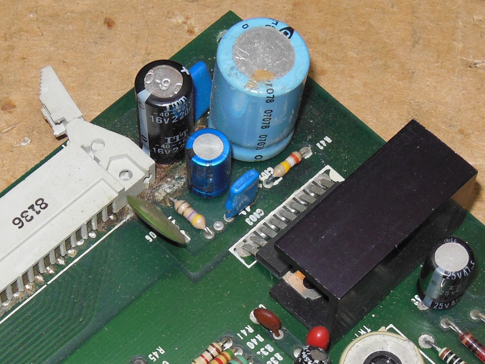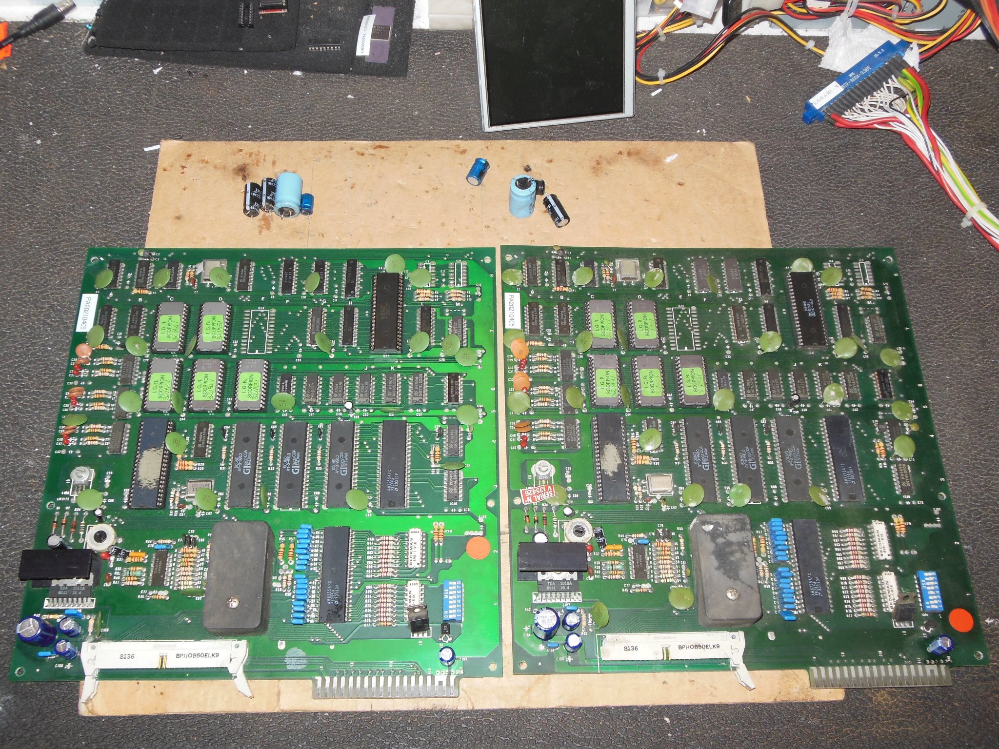 One of the game PCBs had leaking capacitor damage to remediate and I decided to replace all the capacitors in that section on both PCBs, making up a couple of ad-hoc cap kits. The PCB under the leaking capacitor was discoloured but the tracking was still intact.