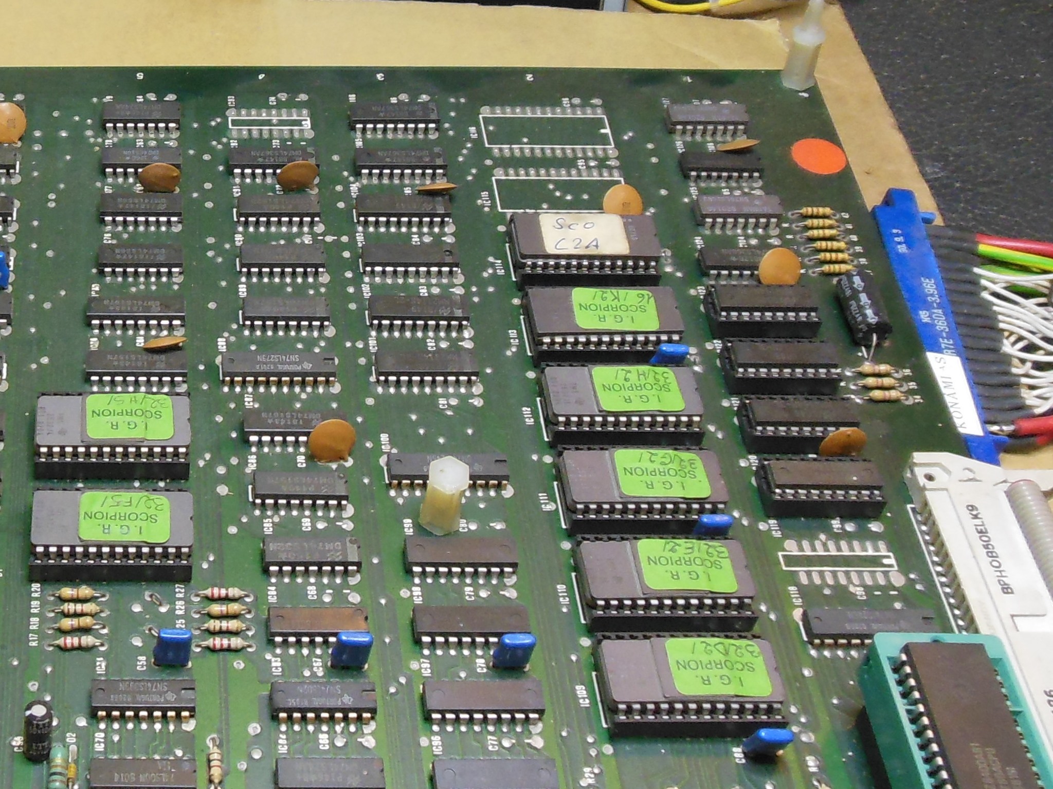 A quick "AY Check" with the Arduino ICT using the Scramble sound configuration failed with "AY3 0004 04 00". Scorpion has a different sound PCB than Scramble but appears to be a superset - Scramble sound + 3rd AY-3-8910 + speech. Support for Scorpion sound was added to the Arduino ICT and the mapping of the 3 x 8910 documented. This configuration confirmed that it was IC 37 (8910) reporting failure on the ICT. ICT sound tests were also revealing that IC 37 audio output was very low at ~200mV p-p versus 1V p-p for IC 36. I suspected IC 37 was bad with a stuck data bit D2 and replacing it fixed the ICT AY check and audio output. In the game all sounds appeared to be working again. The PCB set was reassembled and returned back to the cabinet.