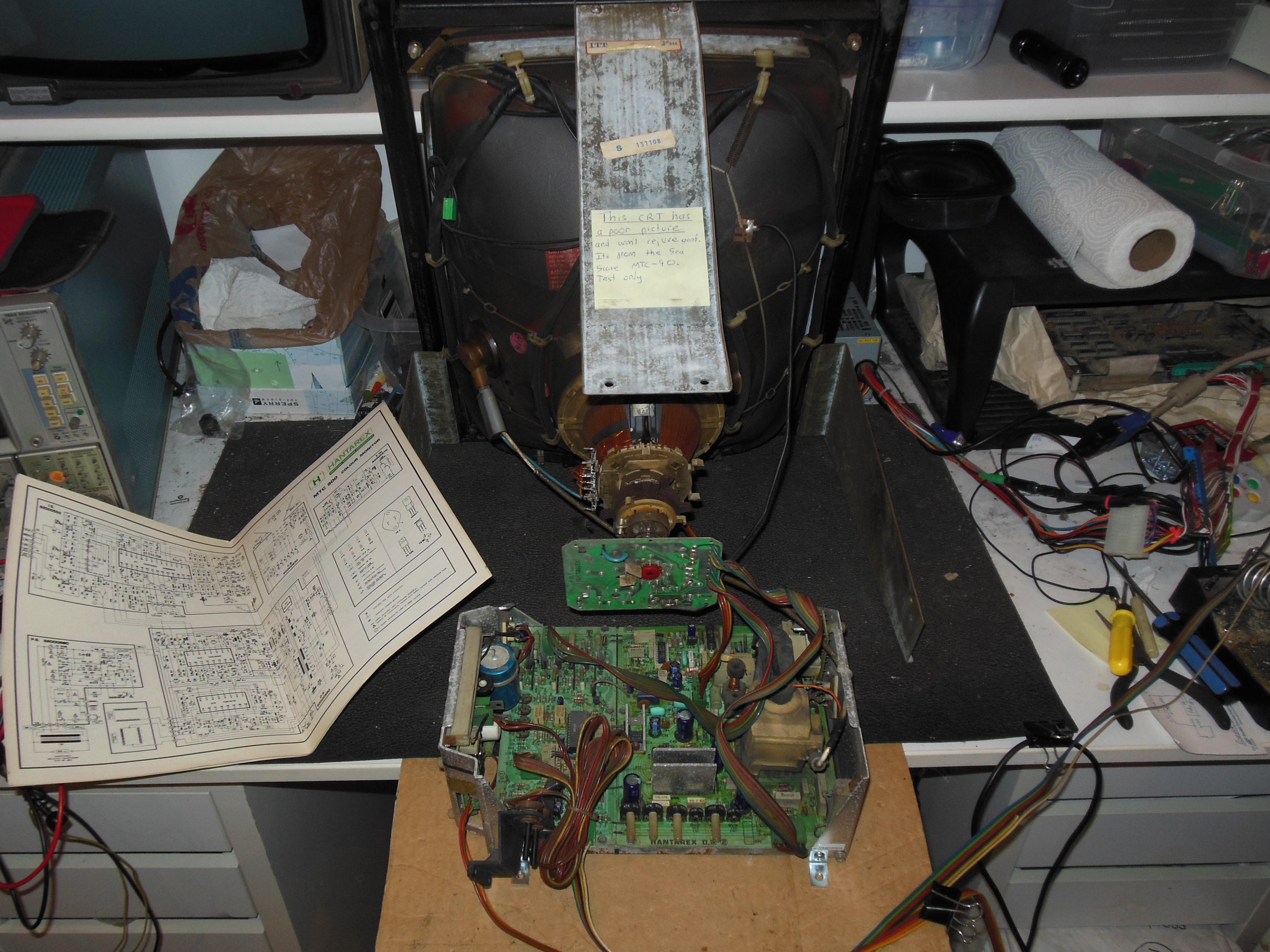 Whilst setting up on the bench I spotted diode D10 (1N4148) was shattered. Replacing it didn't make any difference. Checking IC 1 (TDA 3501) input pins 12,13,14 had signal but the output pins were all idle. The blanking input did appear to be running OK, consistent with the two blanking transistors that tested OK out of circuit. Replacing IC 1 didn't restore the picture. Looking at the pins of IC 1 found Vp pin 6 at 1V whereas it should have been +12V. Checking the +12V regulator IC 4 (7812) found +14.2V on the input but only 0.6V on the output. Replacing IC 4 (7812) brought back 10.7V at the output from 12.3V at the input, still not a solid +12V but enough to produce a poor, barely visible picture with squashed geometry.