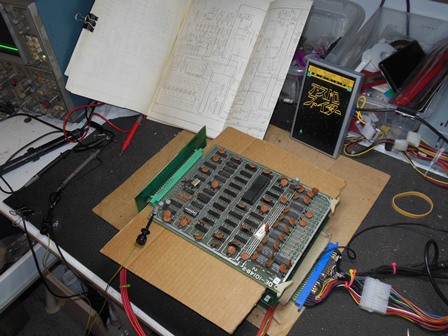 A reference working Astro Fighter PCB set was first setup to confirm a working base set of boards to more easily isolate which of the three boards (IO, CPU & ROM) weren't working. Tomahawk 777 CPU boards #001 & #002 and IO boards #002 & #006 all ran OK with the Astro Fighter ROM PCB, however the sole Tomahawk ROM PCB #002 resulted in either no boot or corrupted/crashing attract mode.