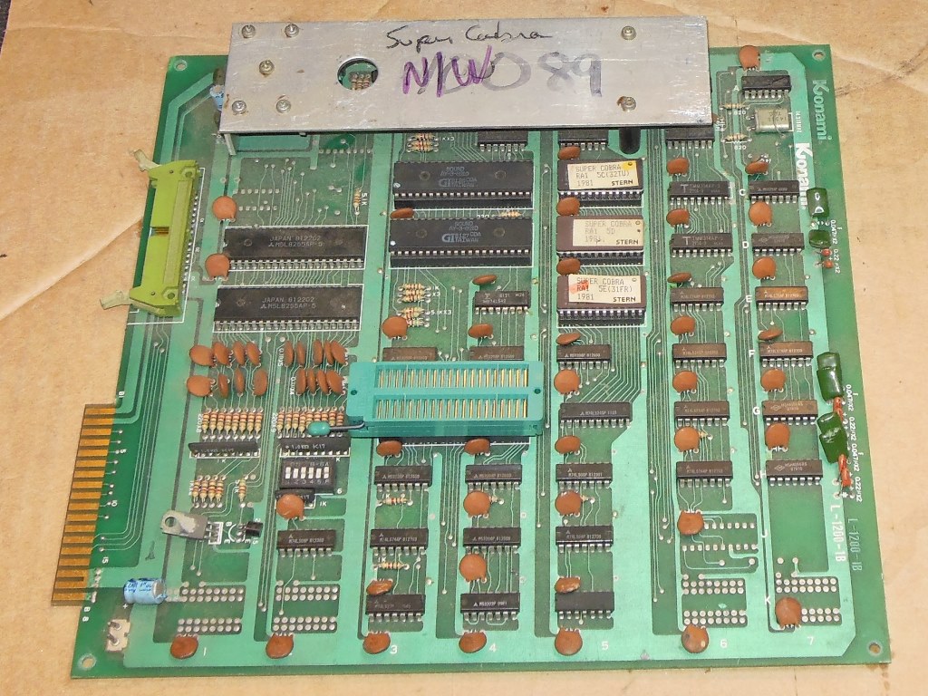 Inserting the Arduino ICT passed all the RAM and interrupt tests but the ROM CRC did not match anything I'd previously tested. A ROM read returned completely mismatched data and the ROM CRC check was stable. IC 2C CRC was 0xba9d4152 and IC 2E 0xf9b77b27. According to MAME these CRCs matched the Super Cobra RA1 ROM set that uses the "Konatec" encrypted CPU that I didn't have. I programmed a complete unencrypted replacement ROM set and with those fitted the game booted up and appeared to be working OK except the sound wasn't working properly.