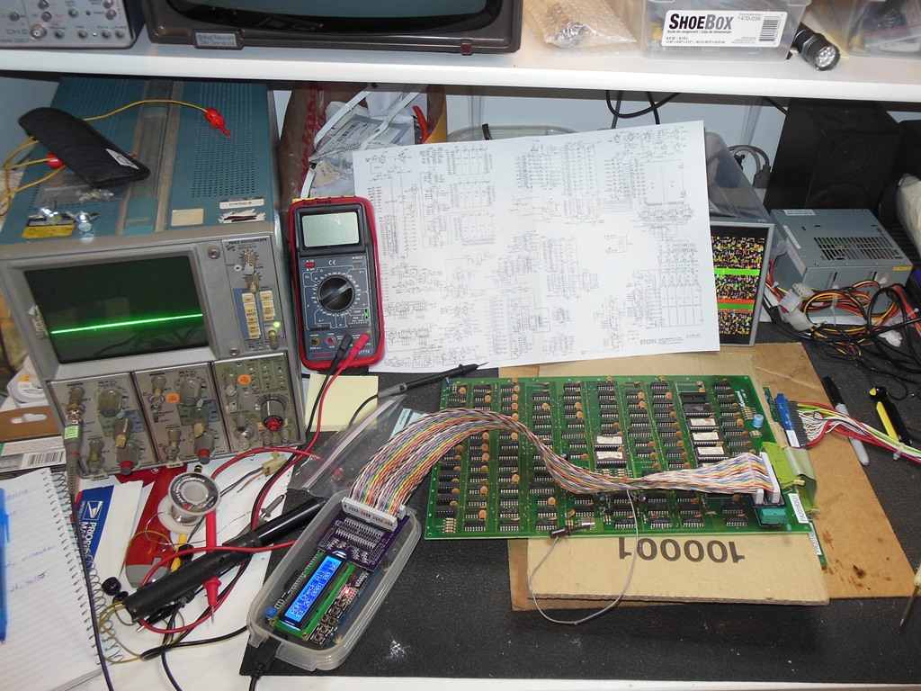 Pre-show testing found that the game had no sound. The +12V, +5V & -5V power supplies all measured OK in the cabinet so I pulled out the game PCB for bench testing. Testing with the Arduino ICT flagged a failure in IC 6C (2114) with all other tests passing, including all 6 channels of the two AY-3-8910. Replacing IC 6C fixed the sound.