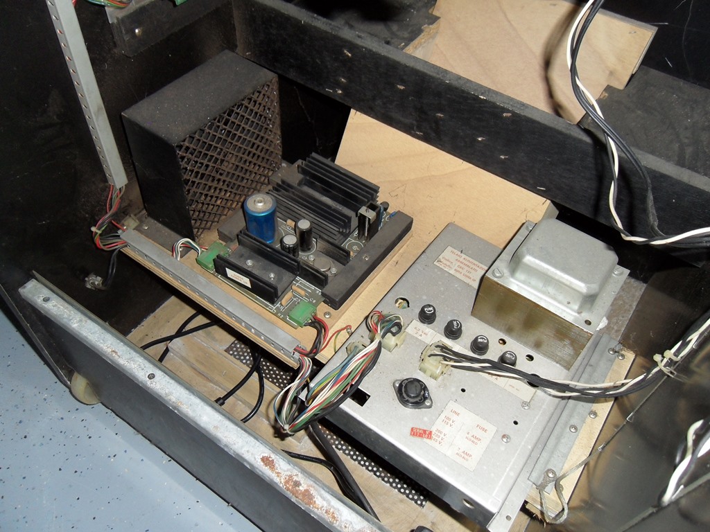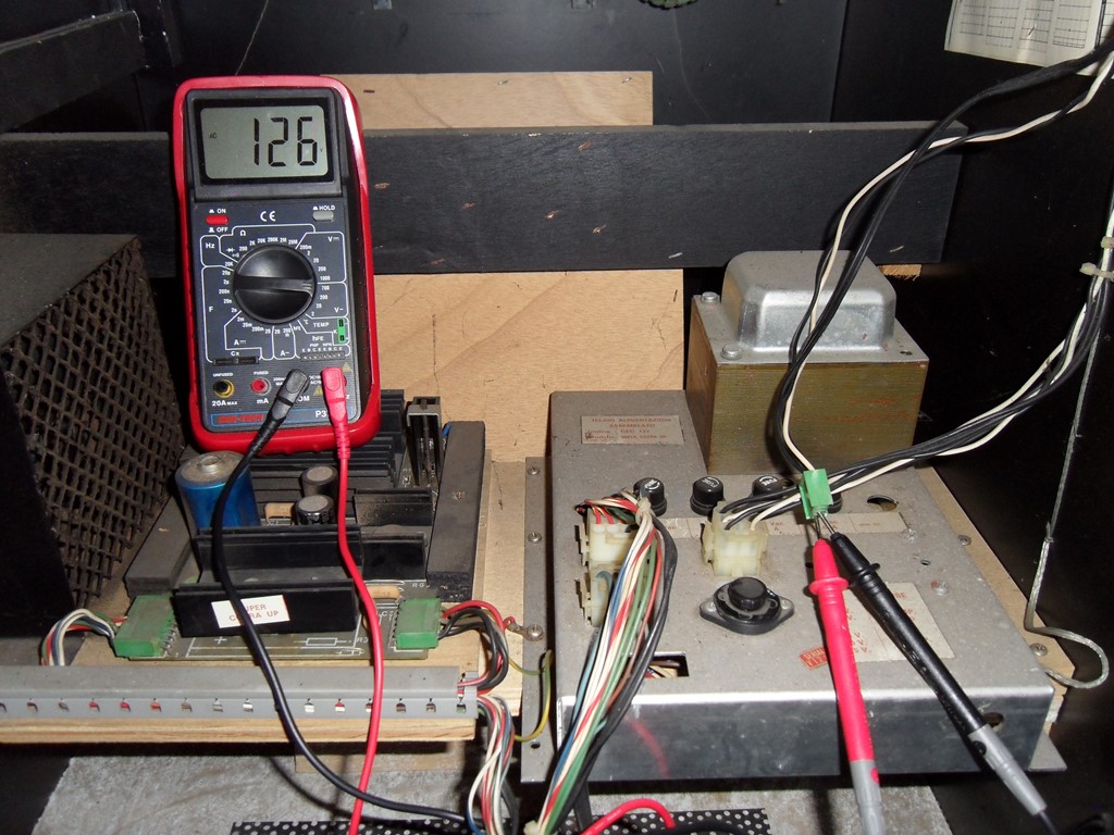 With the new power cord the game side 220/128V looked OK. On the regulated side the +5V, -5V and +12V all looked reasonable. The next step was to reconnect the monitor and marque light.