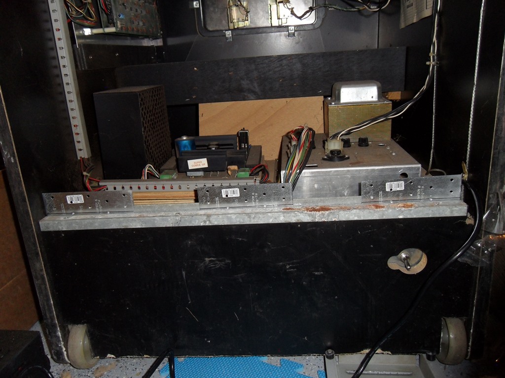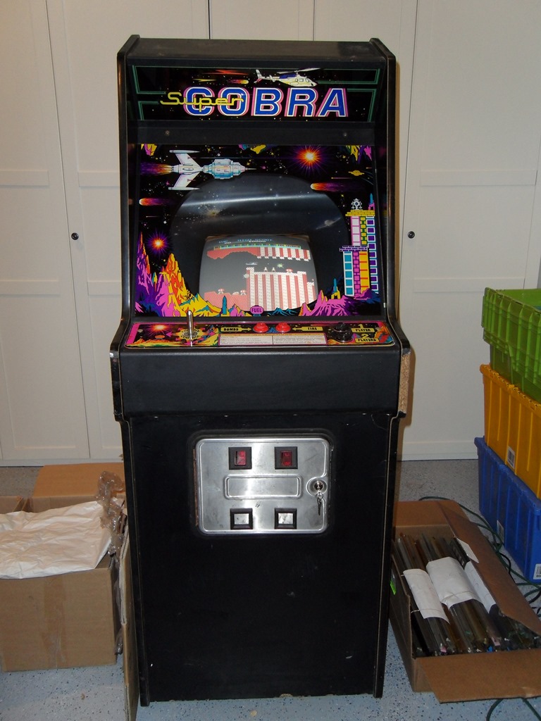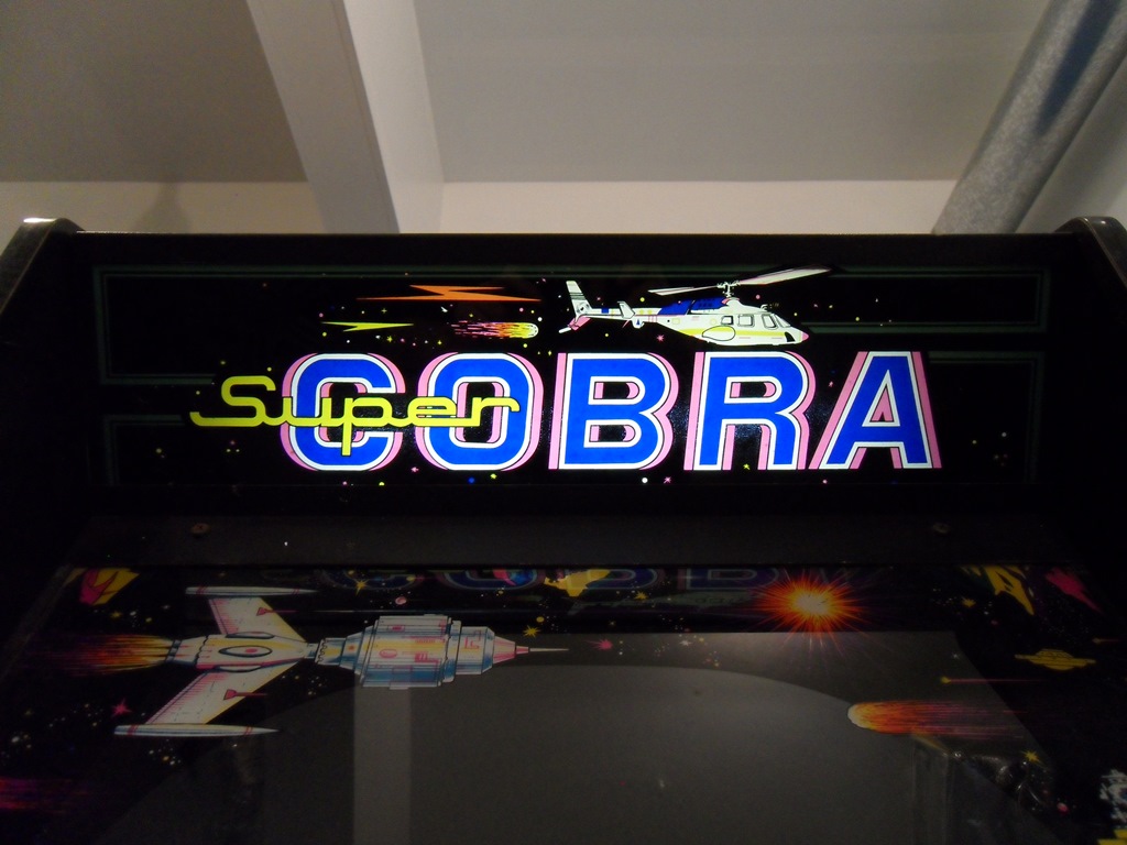 The cabinet looked complete except for the missing back door and game PCB, and in good condition (very dirty of course). All the artwork was present and looked original though slightly different to the Super Cobra artwork used on the usual Zaccaria style cabinet.