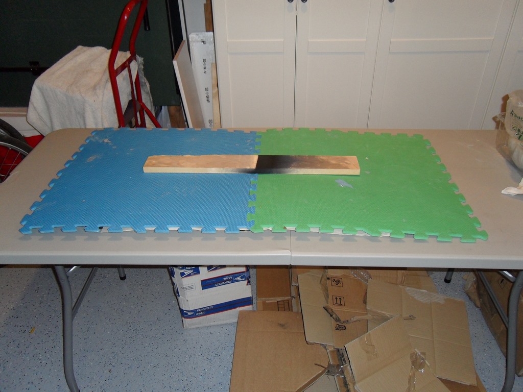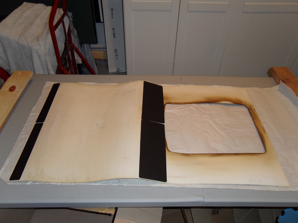 Since the cardboard was laminated on both sides I had to be careful to not crease the laminate as part of flattening it. It had developed a sharp curve over time that would need to be slowly teased out (the top side staple row along the wood line had already been creased and cracked so that would need repairing once flattened). The plan was to gradually add weight over a few days to flatten it out and hopefully not crease the laminate.