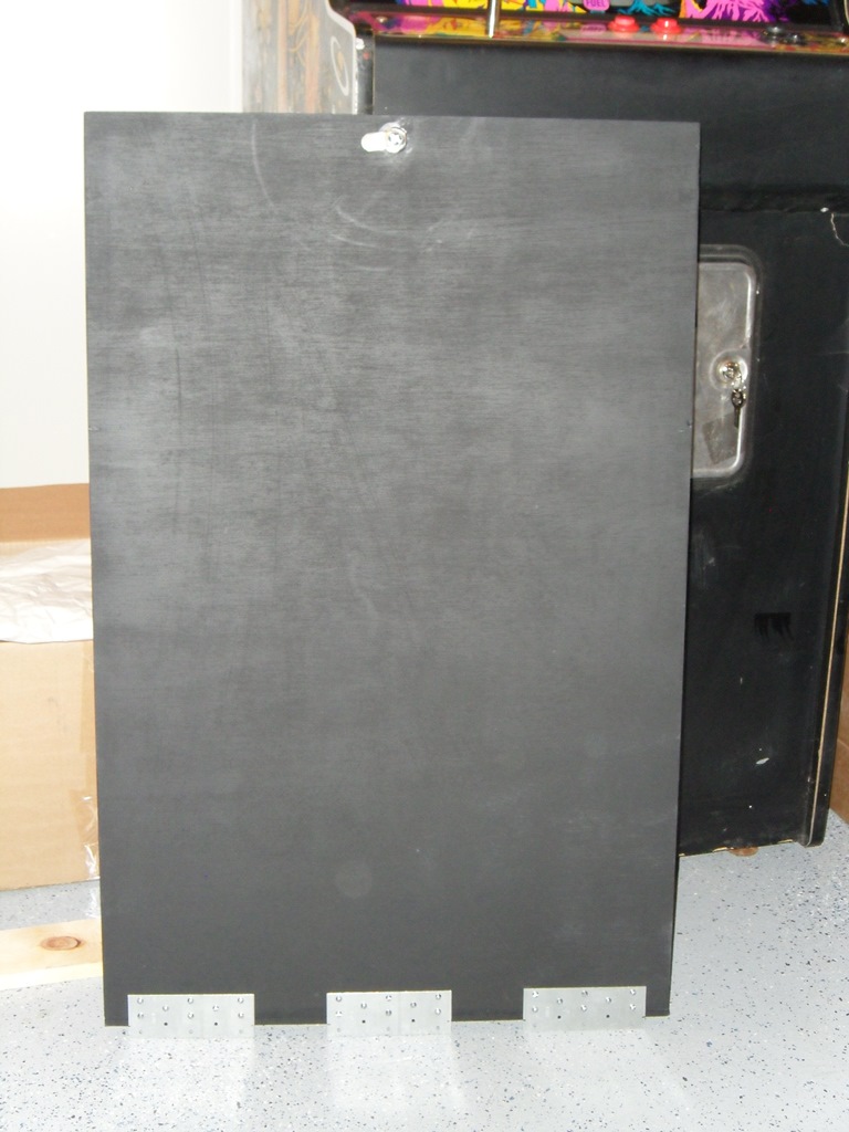 The plan was to use three metal joist join plates to form the interlock with the door lip. The original door had a similar mating edge trim piece (an arrangement not used on the native Zaccaria cabs and thus I didn't have spares). The nice folks at Home Depot cut a back door from the large piece of wood left over from The Invaders back door but made a mistake and cut it exactly a quarter inch too short :(