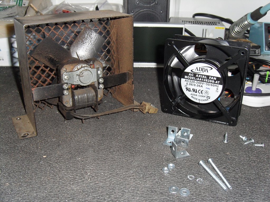 The fan wasn't too bad physically but caused a little bit of waving on the monitor. The replacement was an ADDA AA1282DB-AT 220V-240V 50Hz/60Hz low noise, low power, ball fan that had no problems as a replacement.