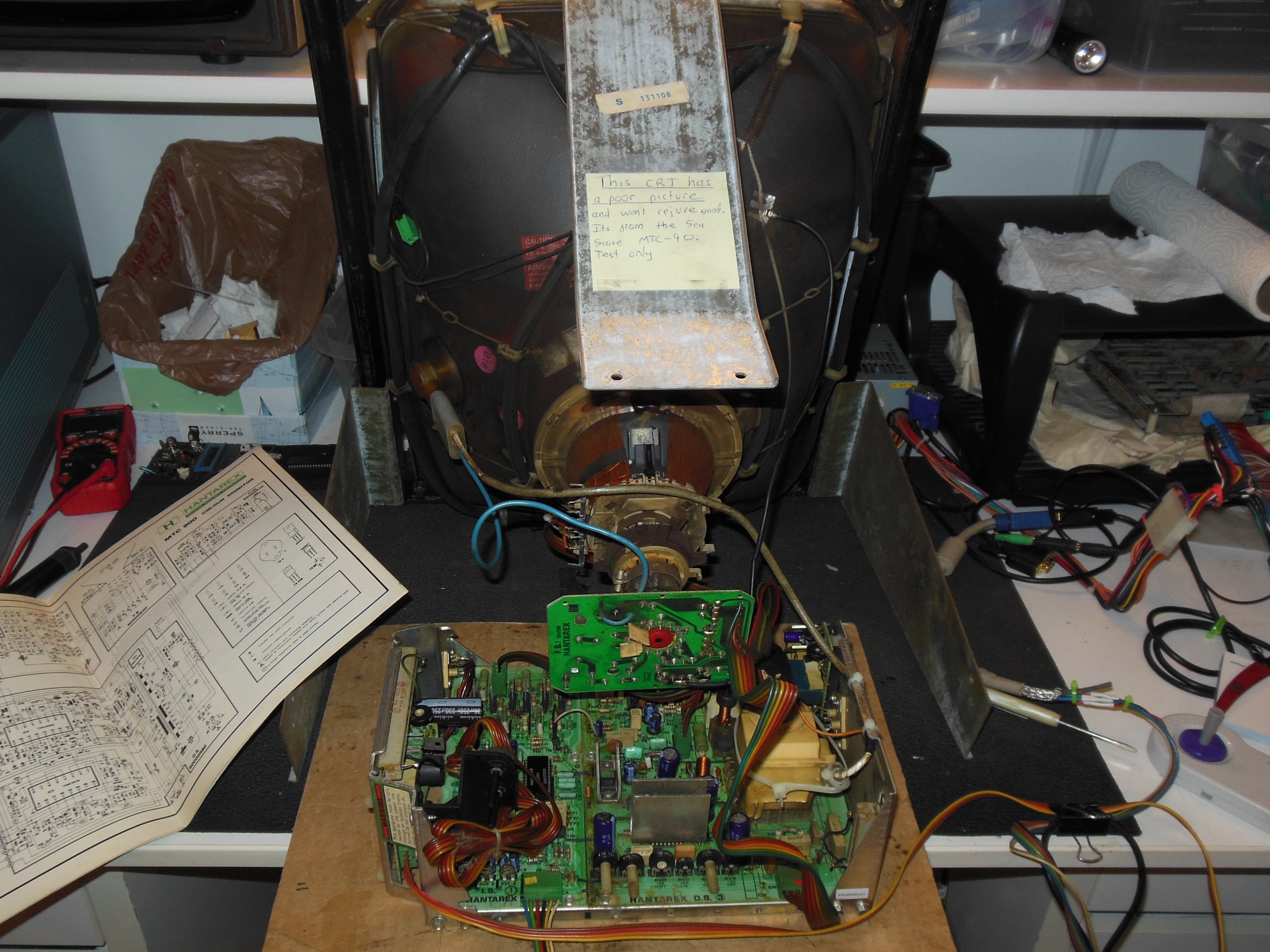On the bench the chassis colour balance looked close to spot on. Measuring the CRT drive on the neck connector didn't reveal any significant difference in the colour balance and I suspected the Vanguard CRT itself was either poor or unbalanced. The chassis was reinstalled into the cabinet and run for several hours to reach operating temperature. The blue colour input adjustment pot was then used to reduce the blue input signal that allowed a higher overall brightness adjustment to increase red & green to balance.