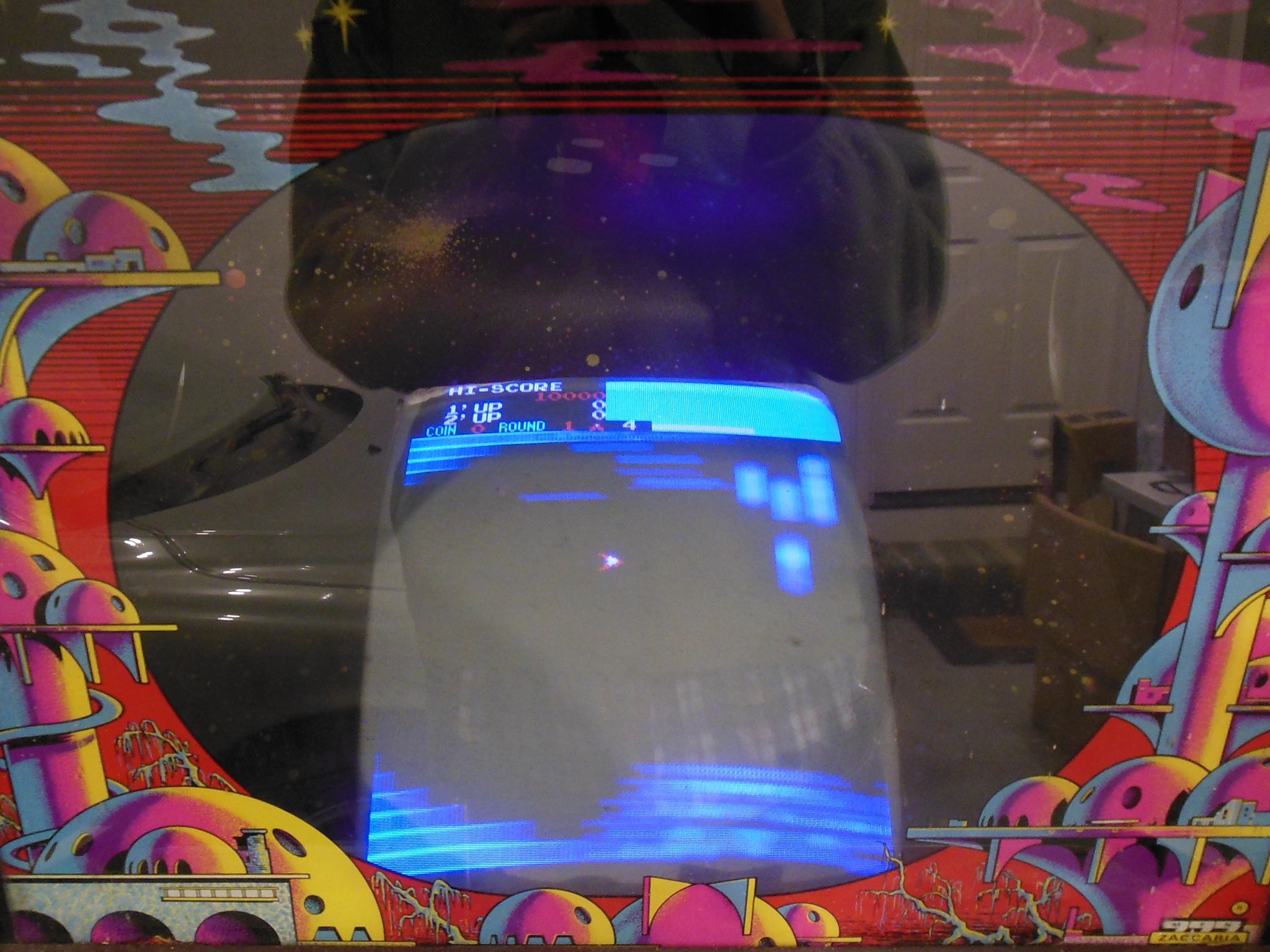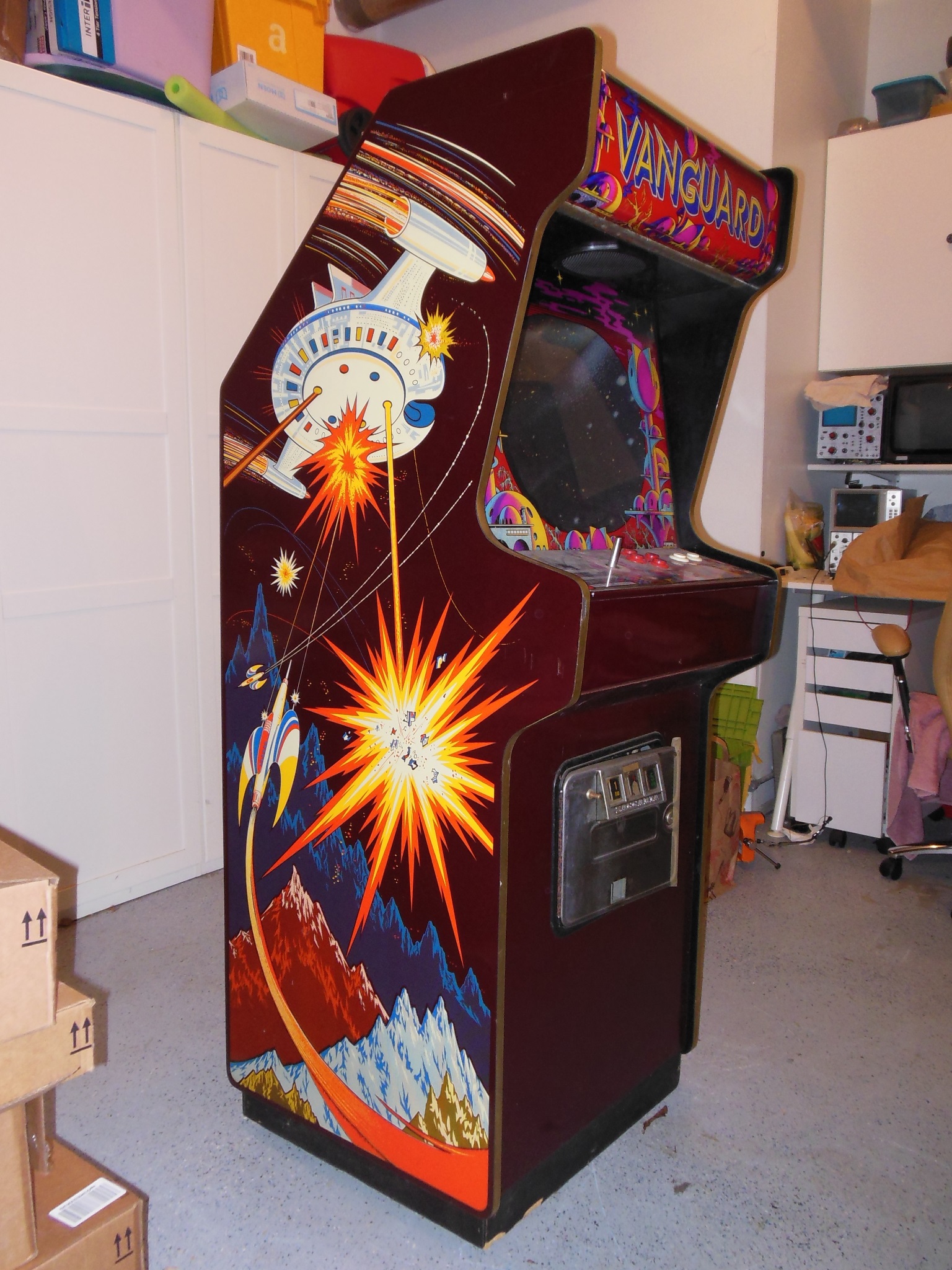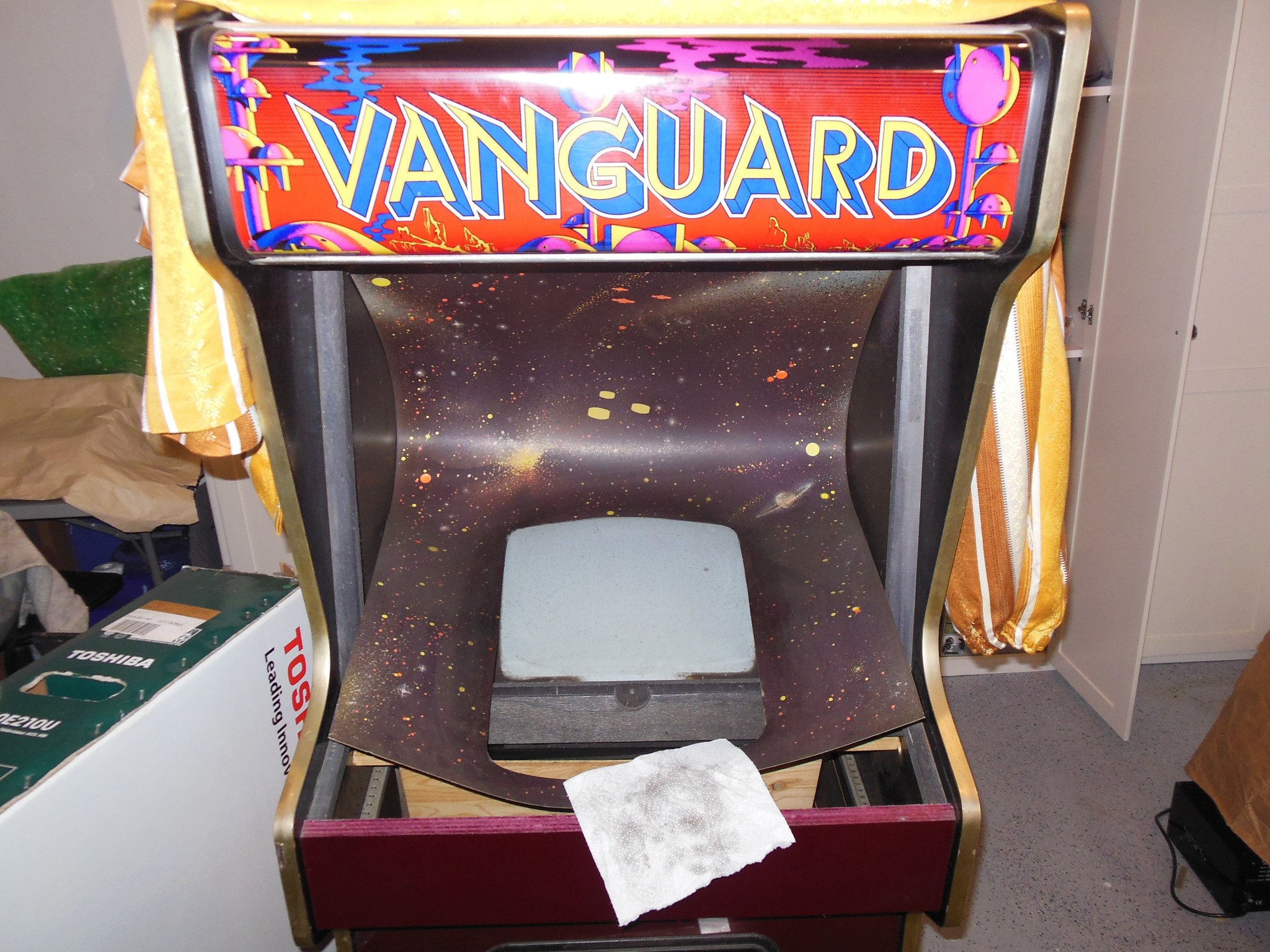 I had a few spare Vanguard game PCB sets in various incomplete states from which I selected the best of the bunch to repair as a spare set for the cabinet. On the bench the spare PCB booted up and played but with graphics problems - the background was corrupt and the colours off. Aside from that, the game played without issue and all the sounds were working.