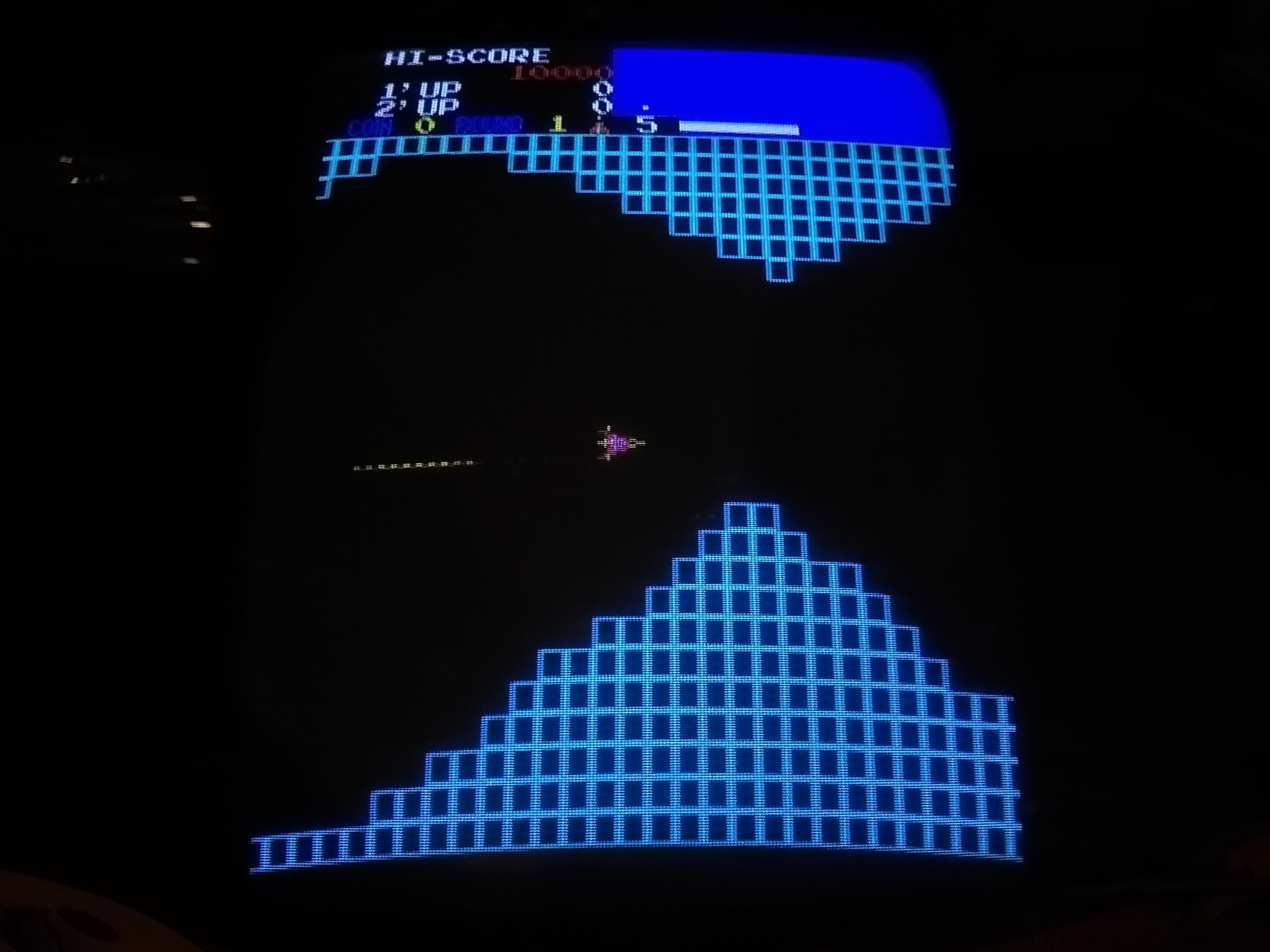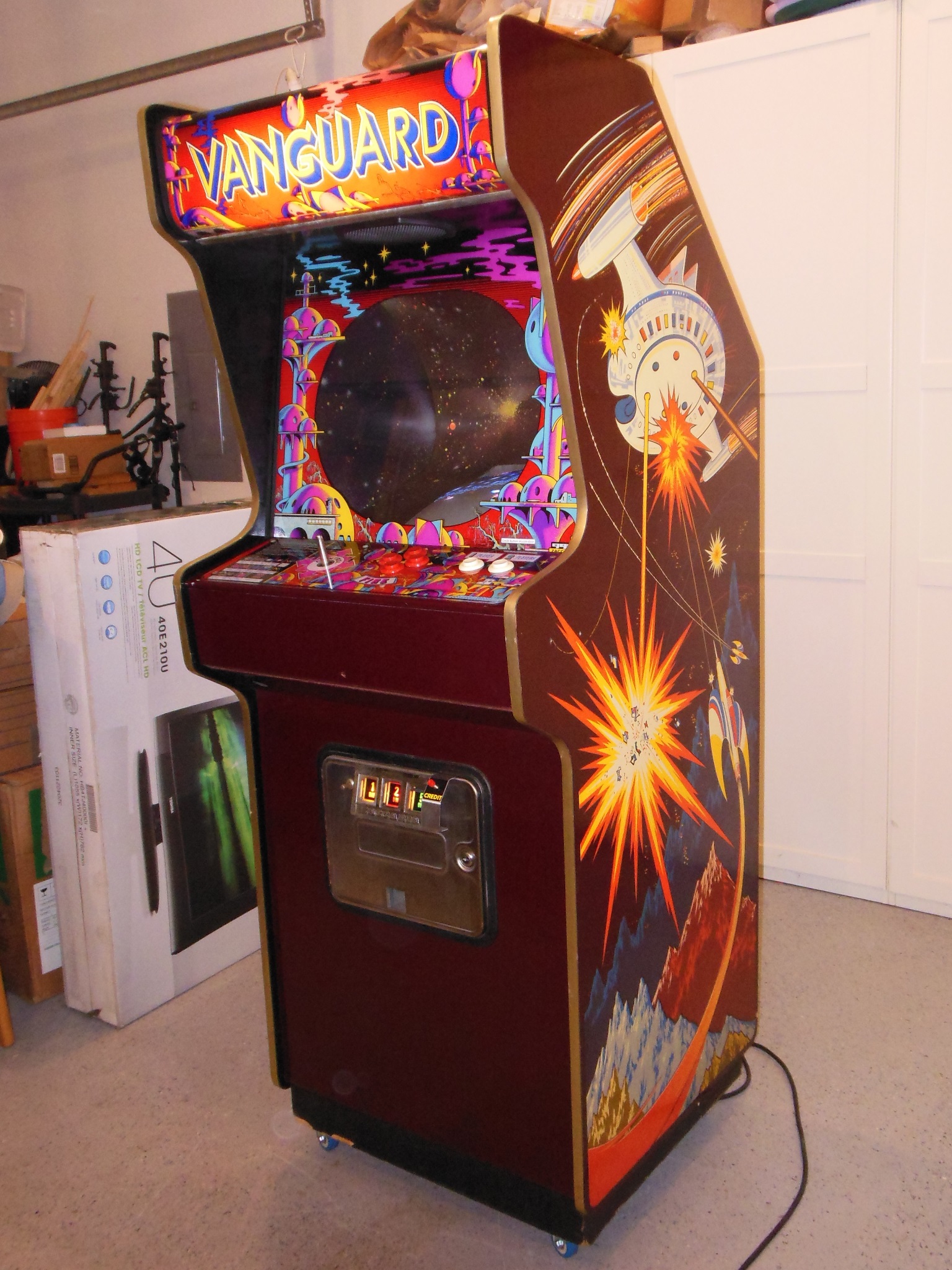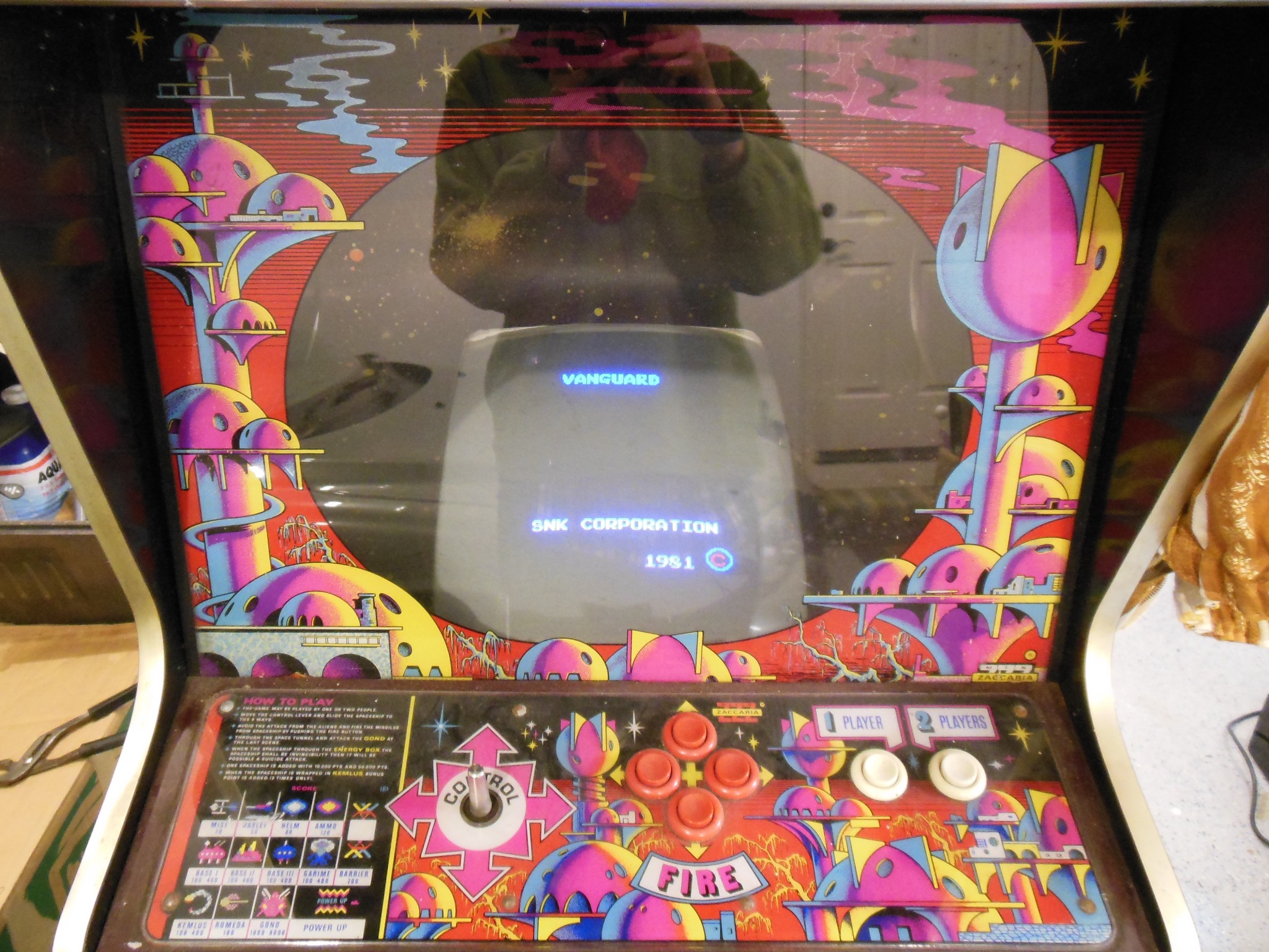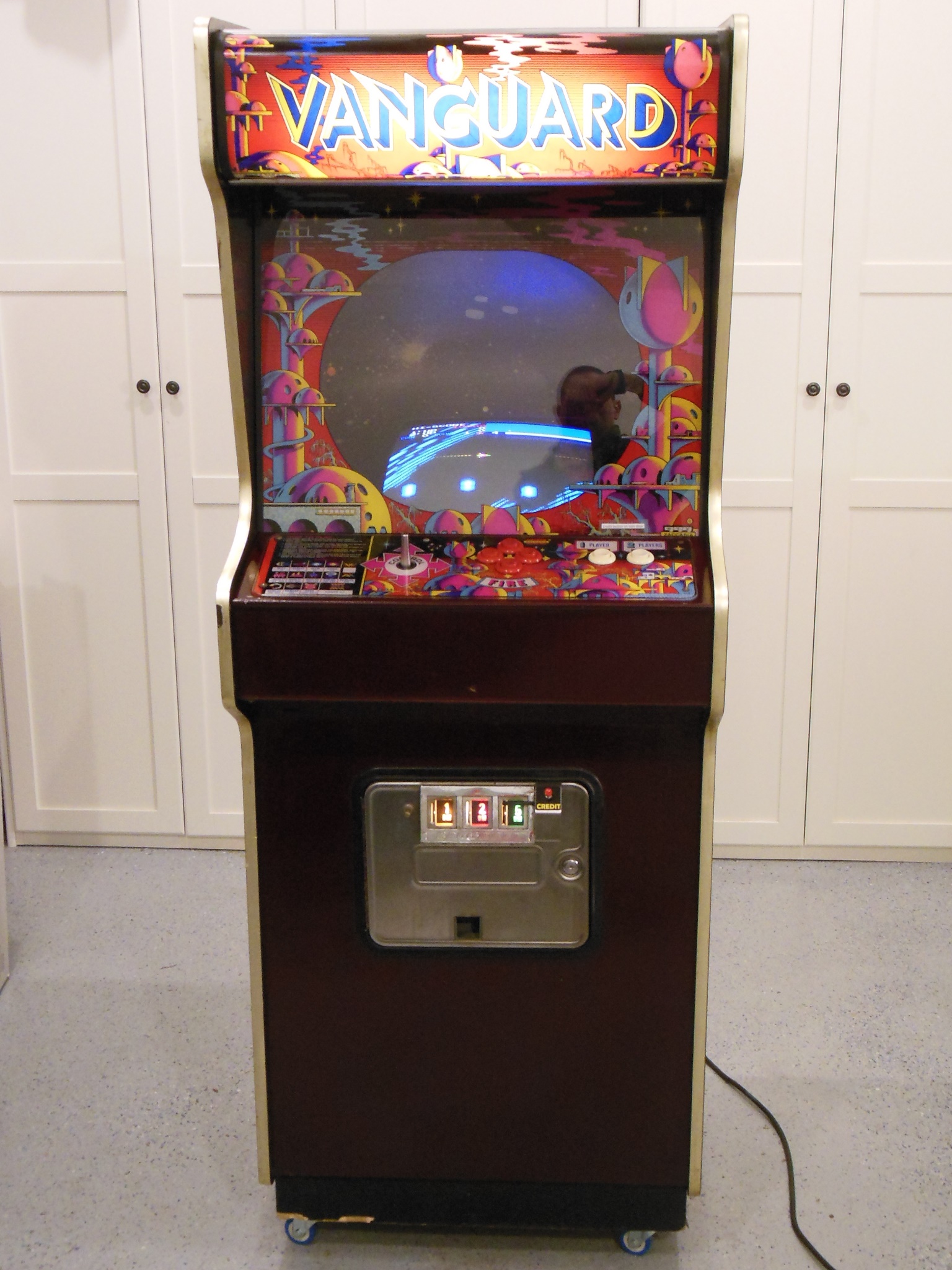 I had a few spare Vanguard game PCB sets in various incomplete states from which I selected the best of the bunch to repair as a spare set for the cabinet. On the bench the spare PCB booted up and played but with graphics problems - the background was corrupt and the colours off. Aside from that, the game played without issue and all the sounds were working.