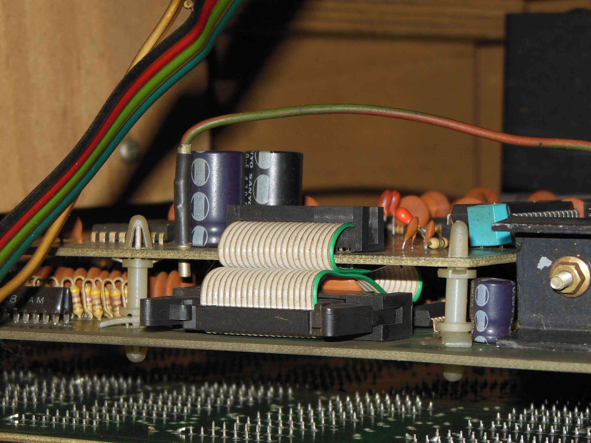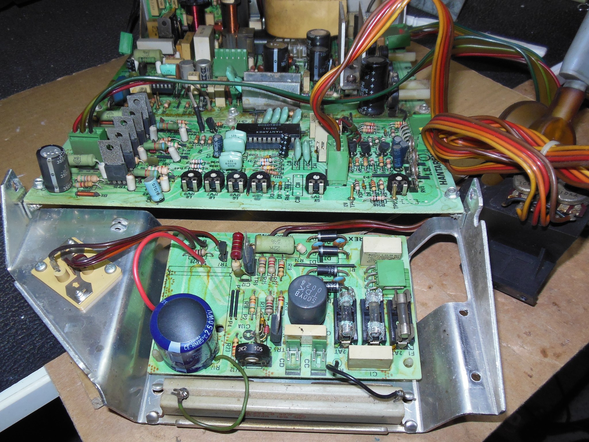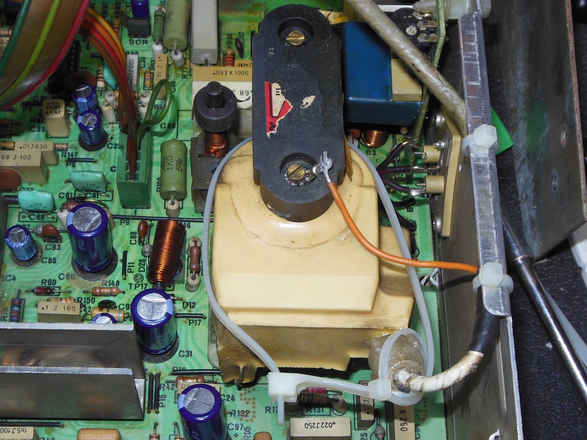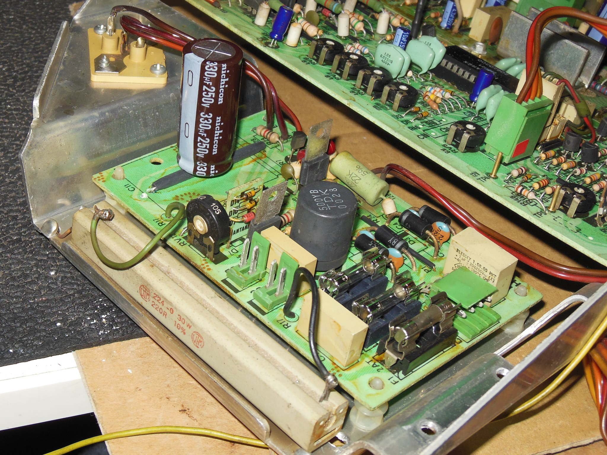 The large power regulation cap on the power PCB wasn't something I'd replaced previously and axials were not easily available so I'd had to order vertical replacements. The leads on the vertical replacements were slightly too short to reach the existing axial holes so a new hole and pad was made to fit.