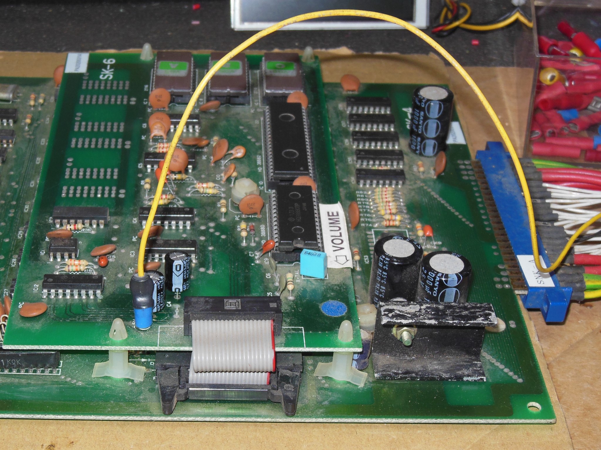 I'd noticed on coin up in the cabinet that the game had speech, something I'd not known before despite having owned and repaired several PCB sets in the past. Looking at the game PCB in the cabinet and the schematics in the manual confirmed that the top daughter PCB was a speech board and there was a -5V fly lead needed for it to work. I modified my SNK to JAMMA adaptor to add the -5V lead using a crimp spade connector "backwards" to make a socket for the PCB post plug.