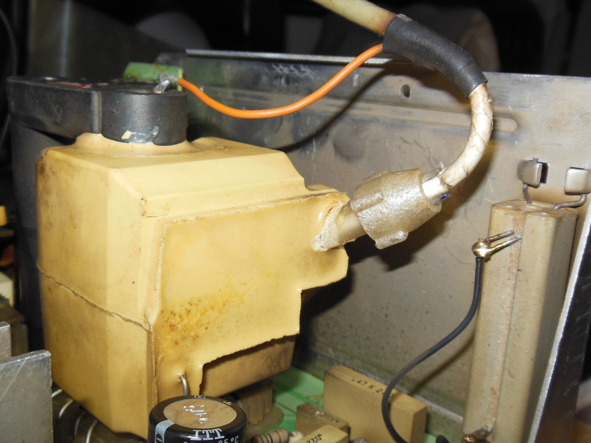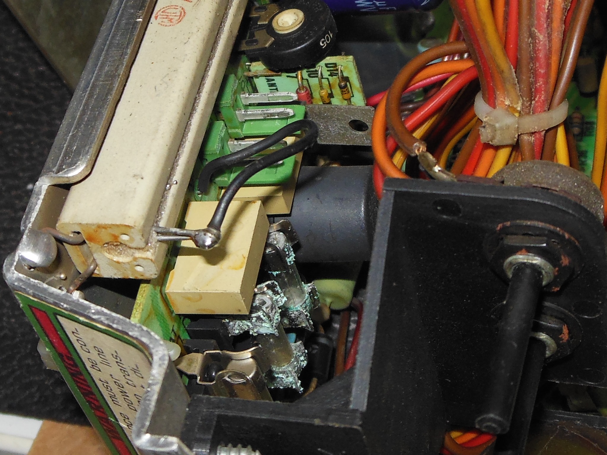 Visual inspection of the Hantarex MTC-900 monitor chassis found three problems to address. First, the HV lead socket on the LOPT was broken. I had very few spares of this LOPT so planned to try it and see if it worked then patch it as best I could. Secondly, the power PCB fuses and holders were corroded. The multimeter confirmed both measured open at the pins. Third, the DC regulation smoothing capacitor was bulging and looked to be a replacement.