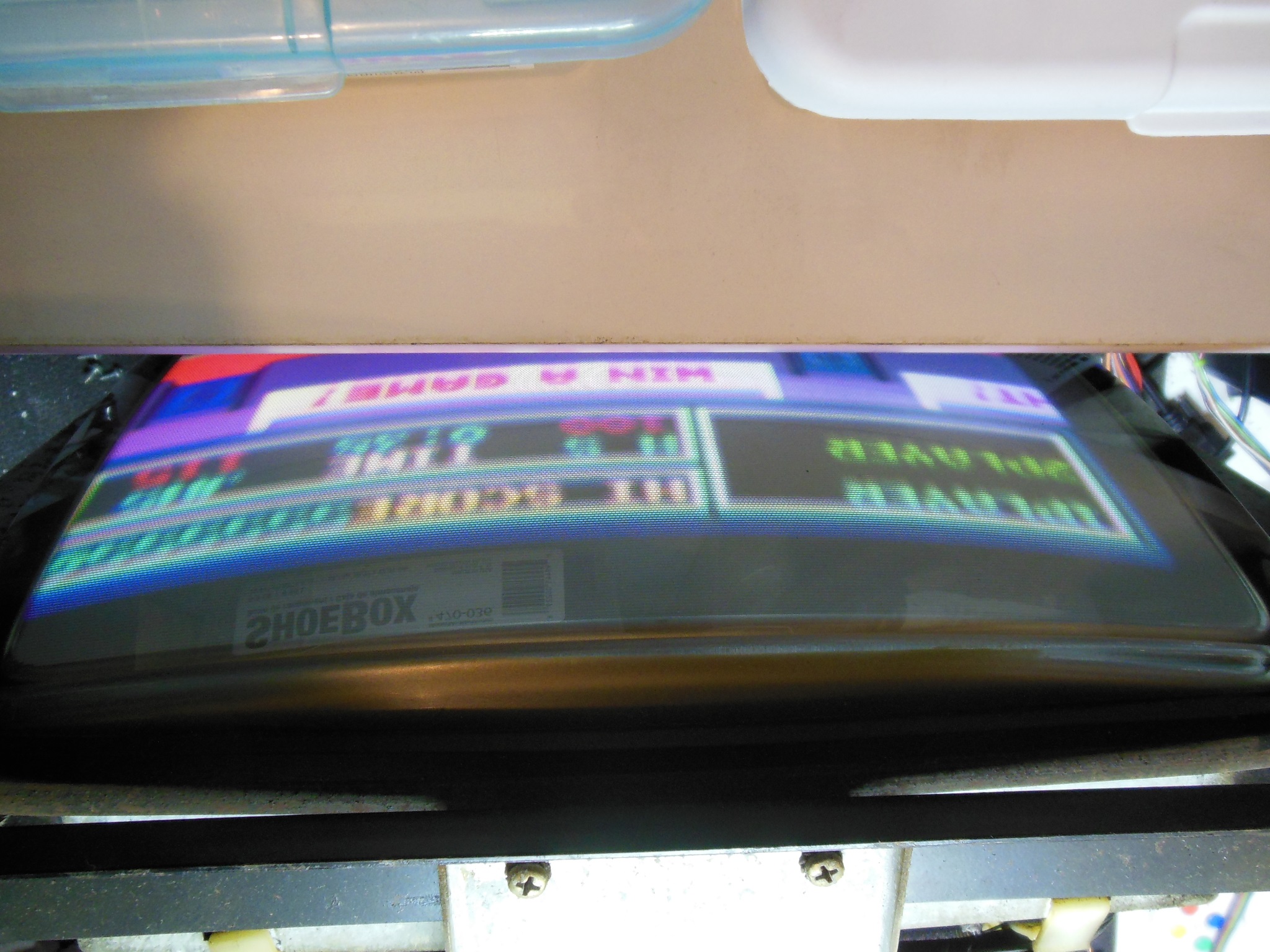 Though the cabinet was in excellent condition overall, it had seen substantial time in a smokey environment that had left the now familiar thick nicotine residue on the CRT. I still hadn't found any easy way to remove it - all the cleaning wipes, Goof Off, sticker remover, bleach or vinegar suggestions hadn't really had much of an effect on it. This time COVID-19 had brought Clorox Disinfecting Wipes into the house that unexpectedly made forward progress on the stains with elbow grease to at least get rid of the stains in the picture area of the CRT.