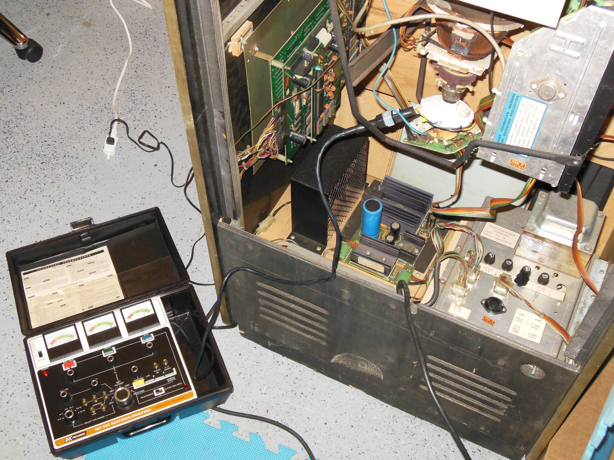 Back in the cabinet the monitor chassis powered on OK to reveal a seemingly working game PCB. The picture colours still seemed a bit off, however.