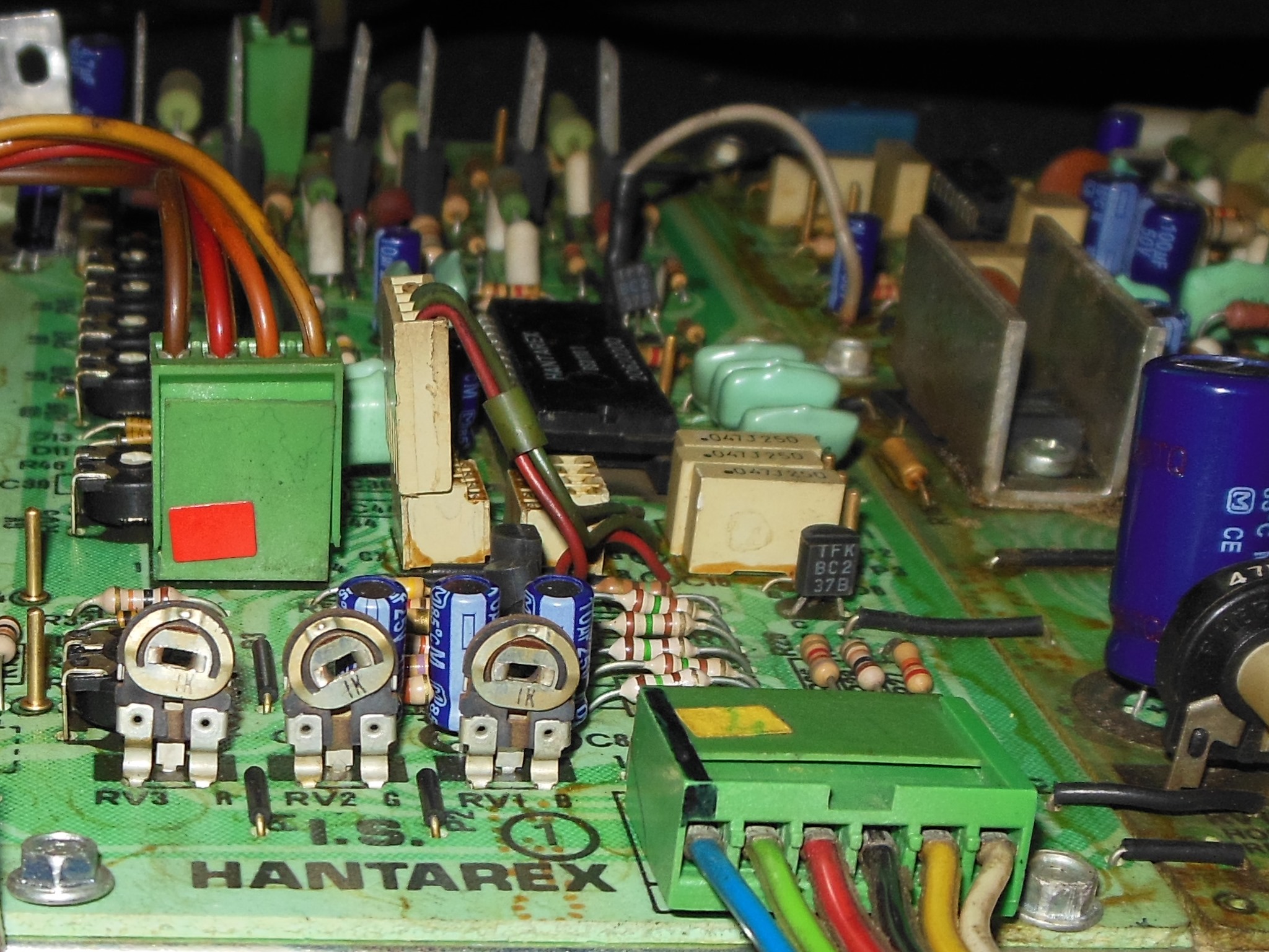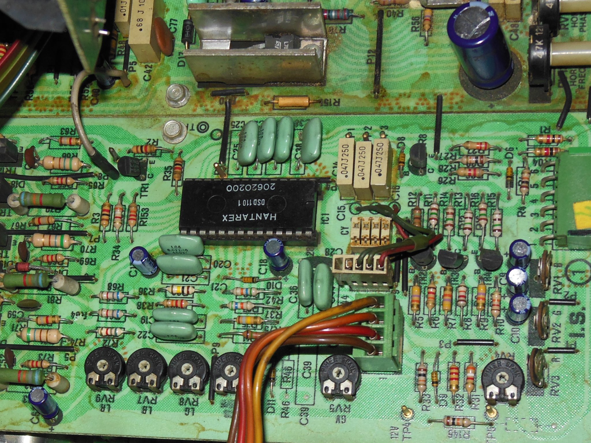 After the DIY cap kit was fitted, power on yielded a stable picture with colours a bit mushy. The damaged LOPT had a little hiss in it but was otherwise working OK.