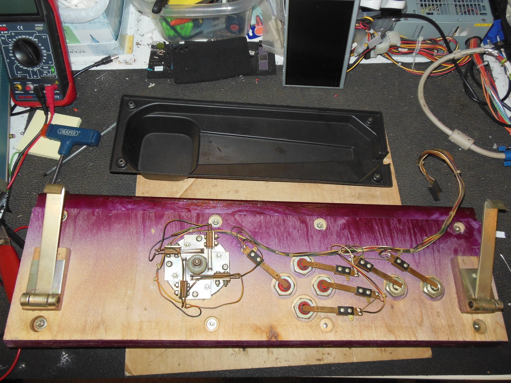 The burnt out coin door lights were replaced and a credit button assembled to go on the front. The credit PCB had a "wire strap" modification to add support for the third slot as 1 coin 1 play that I left as is to match the door configuration.