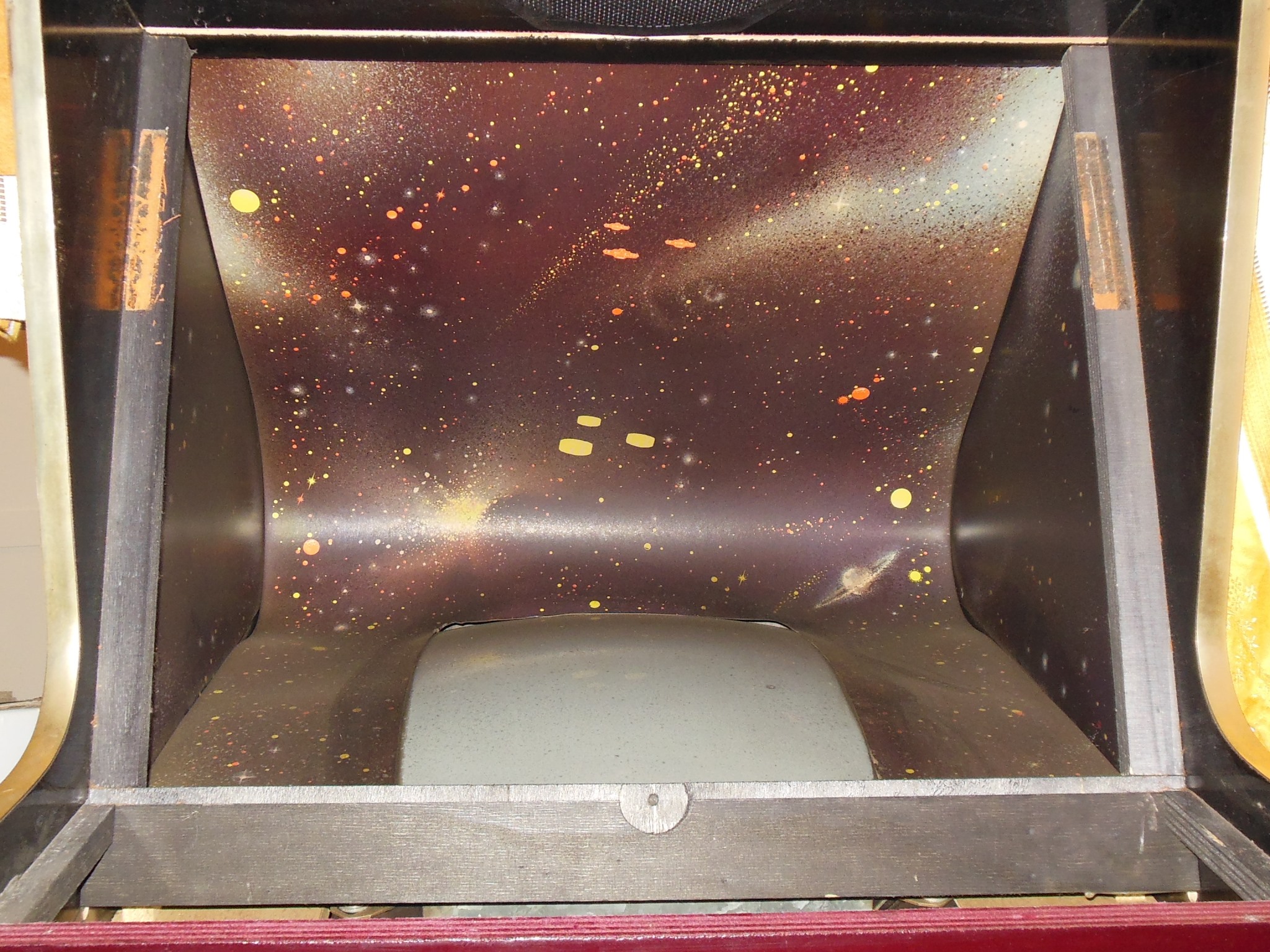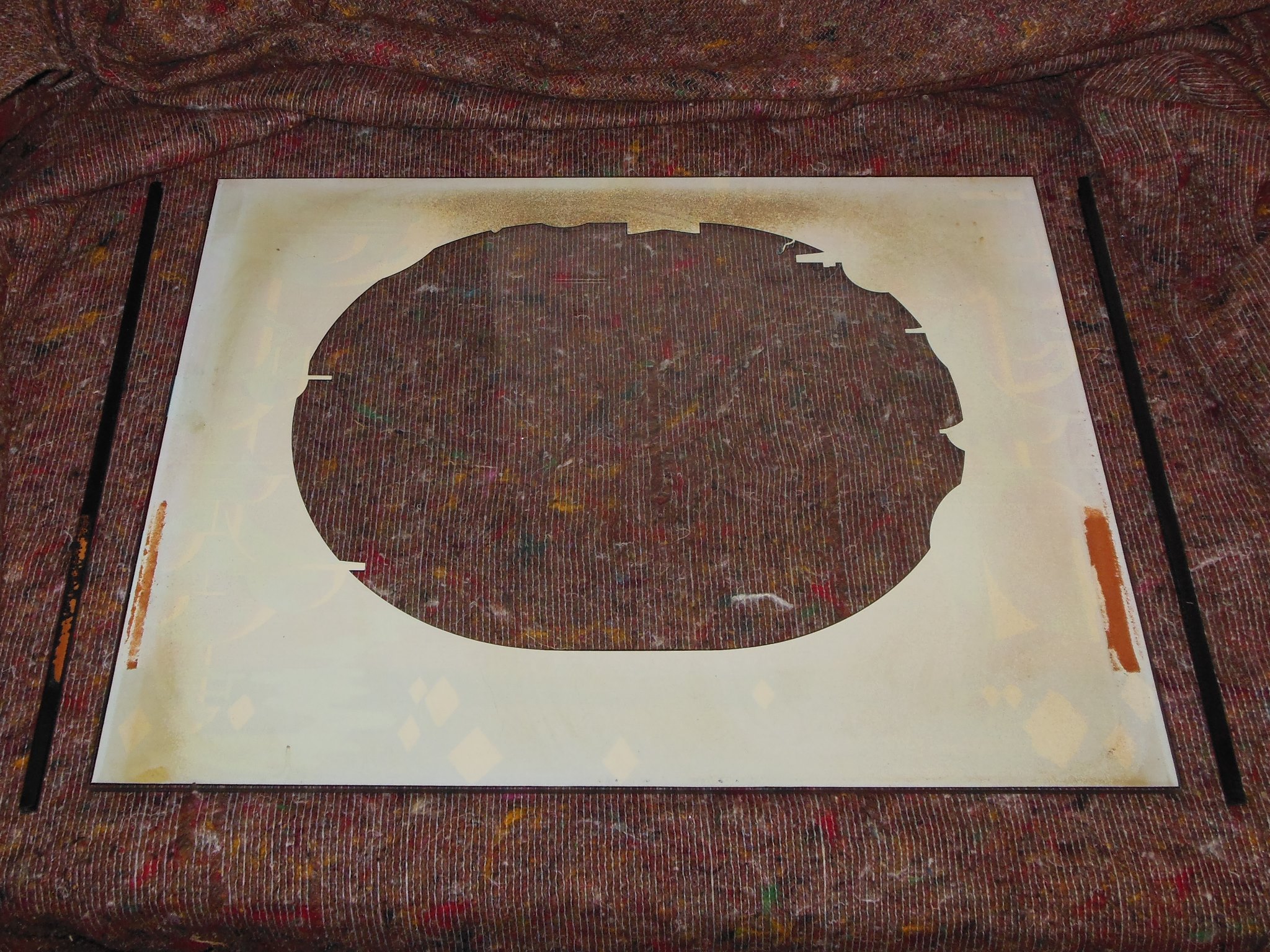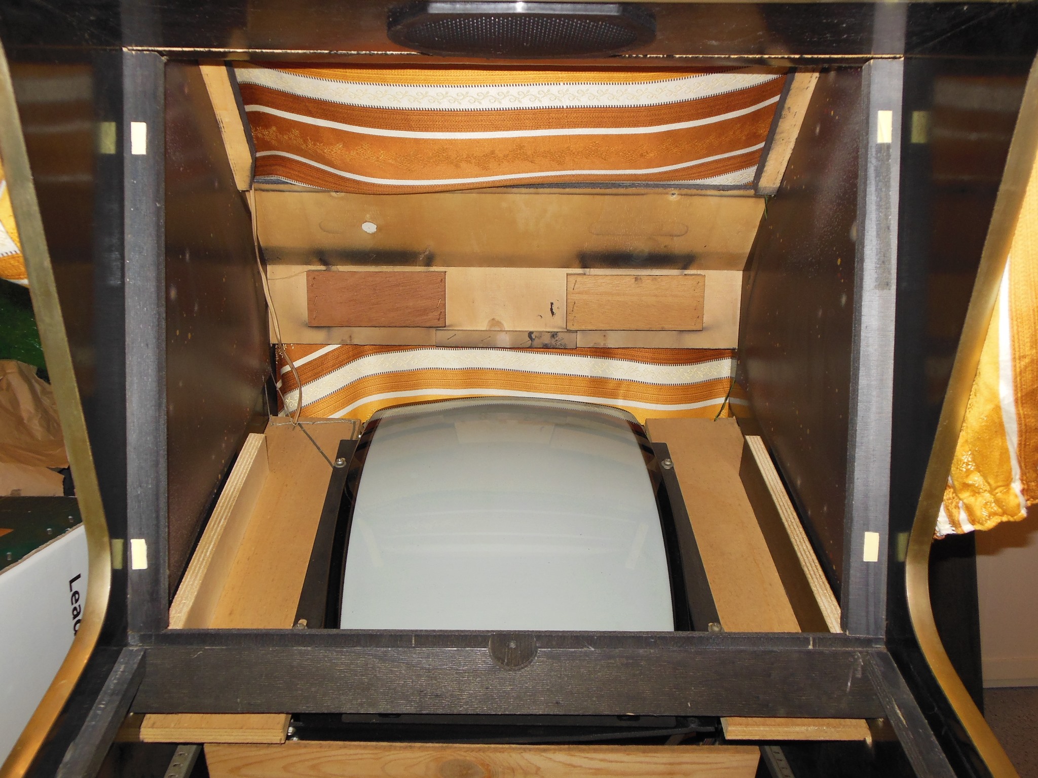 The monitor glass was removed for cleaning & scanning. The glass was in very good condition, no flaking and only nicotine, dust and foam residue on the paint. The monitor surround was also in good condition, no tears or creases and only dust, nicotine at the edges and sagging in the cavity.