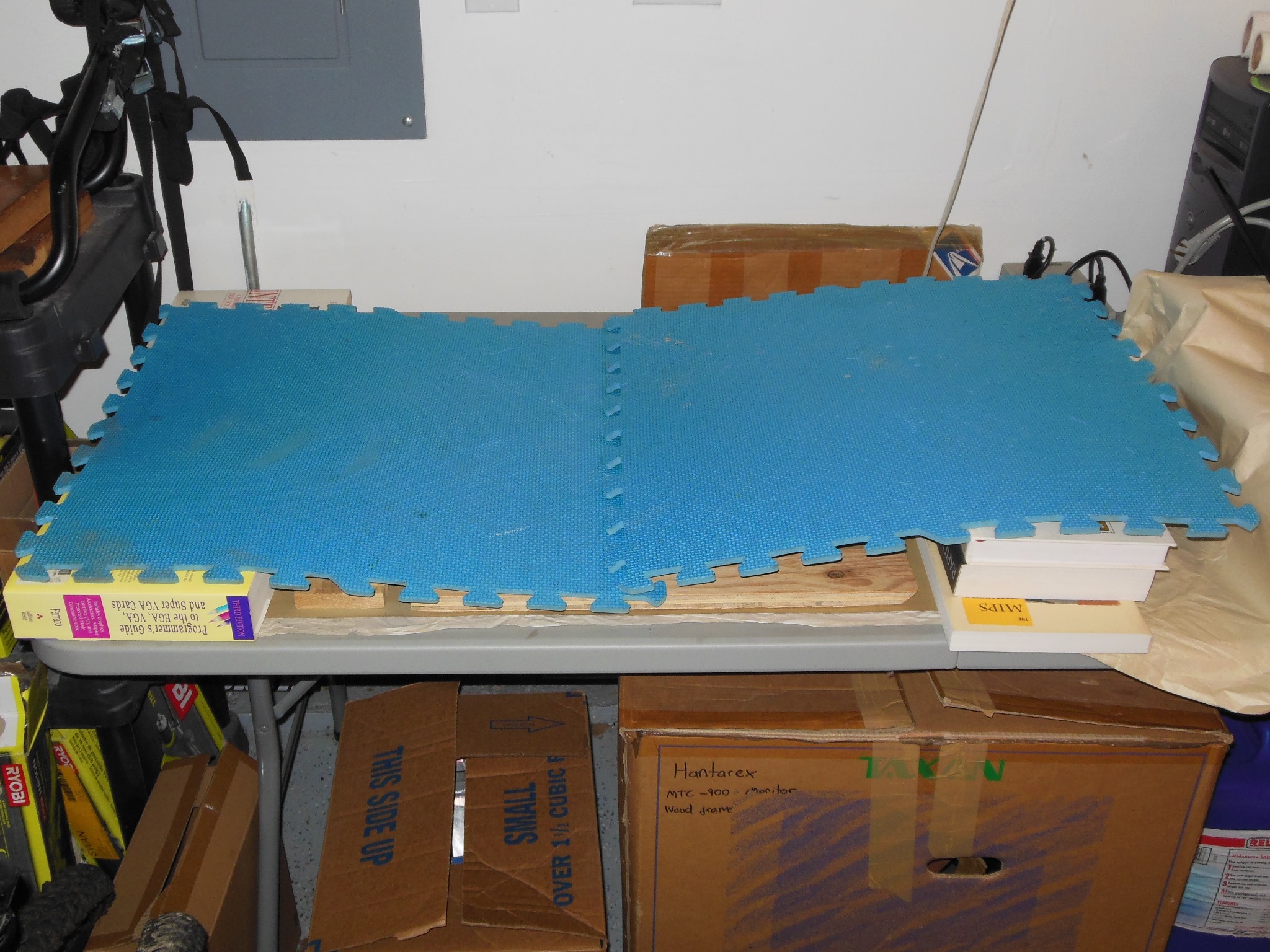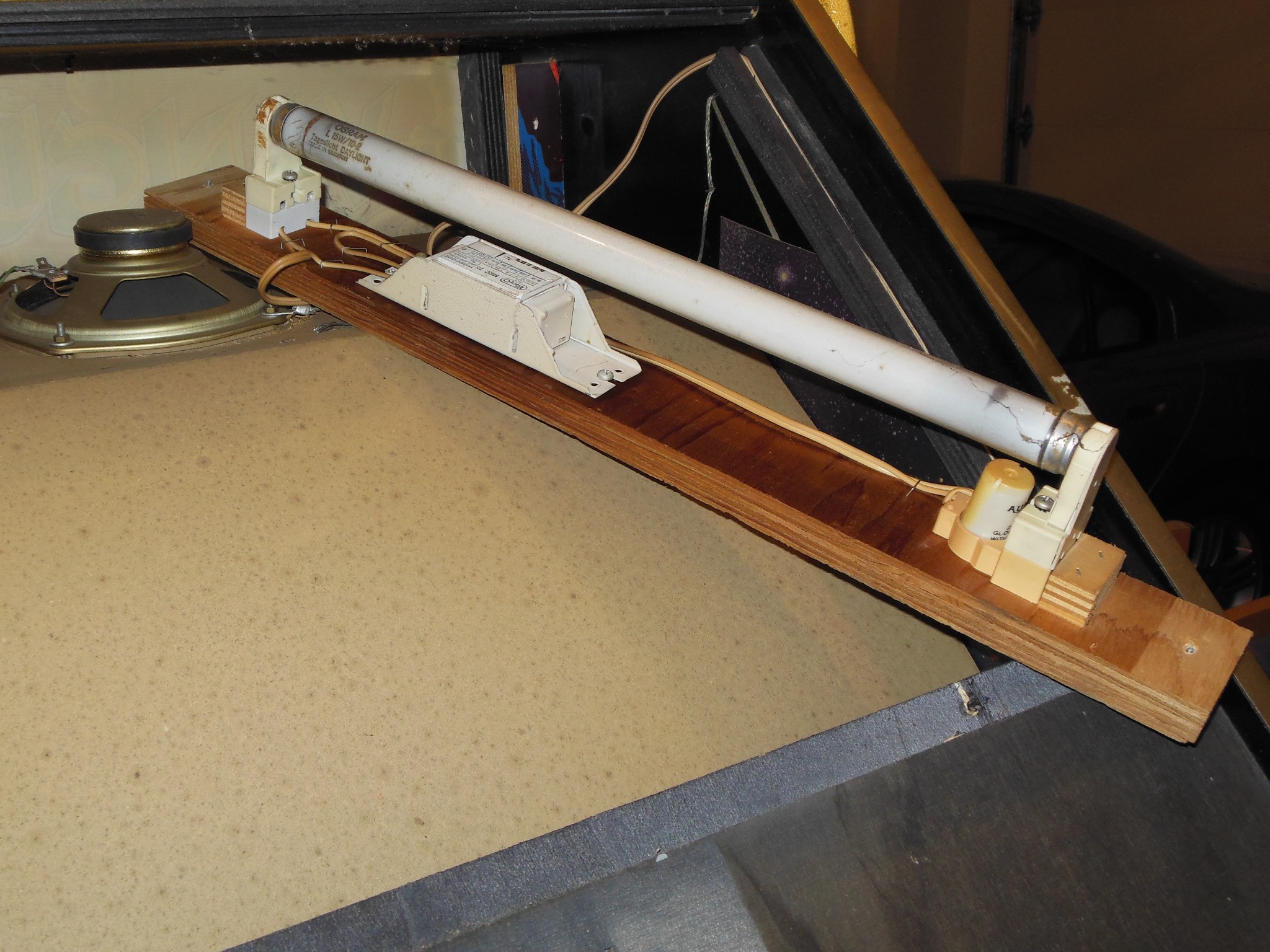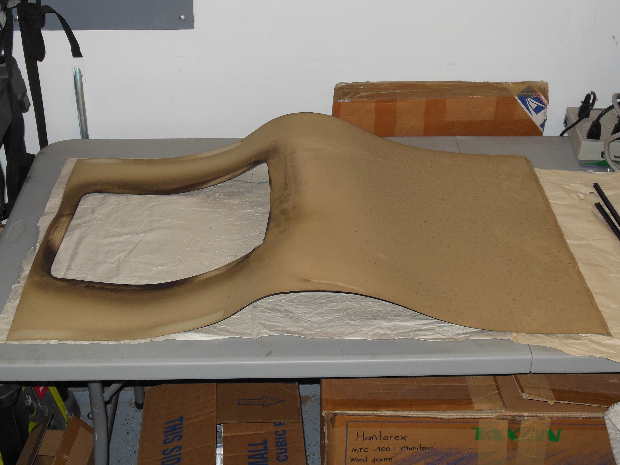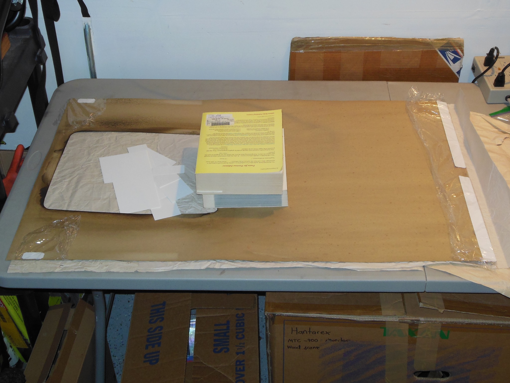 Only minor repairs were needed on the monitor surround - a cracked crease along the top (causing sag) and a couple of patches for the side staples. The surround was set for the repairs to dry.