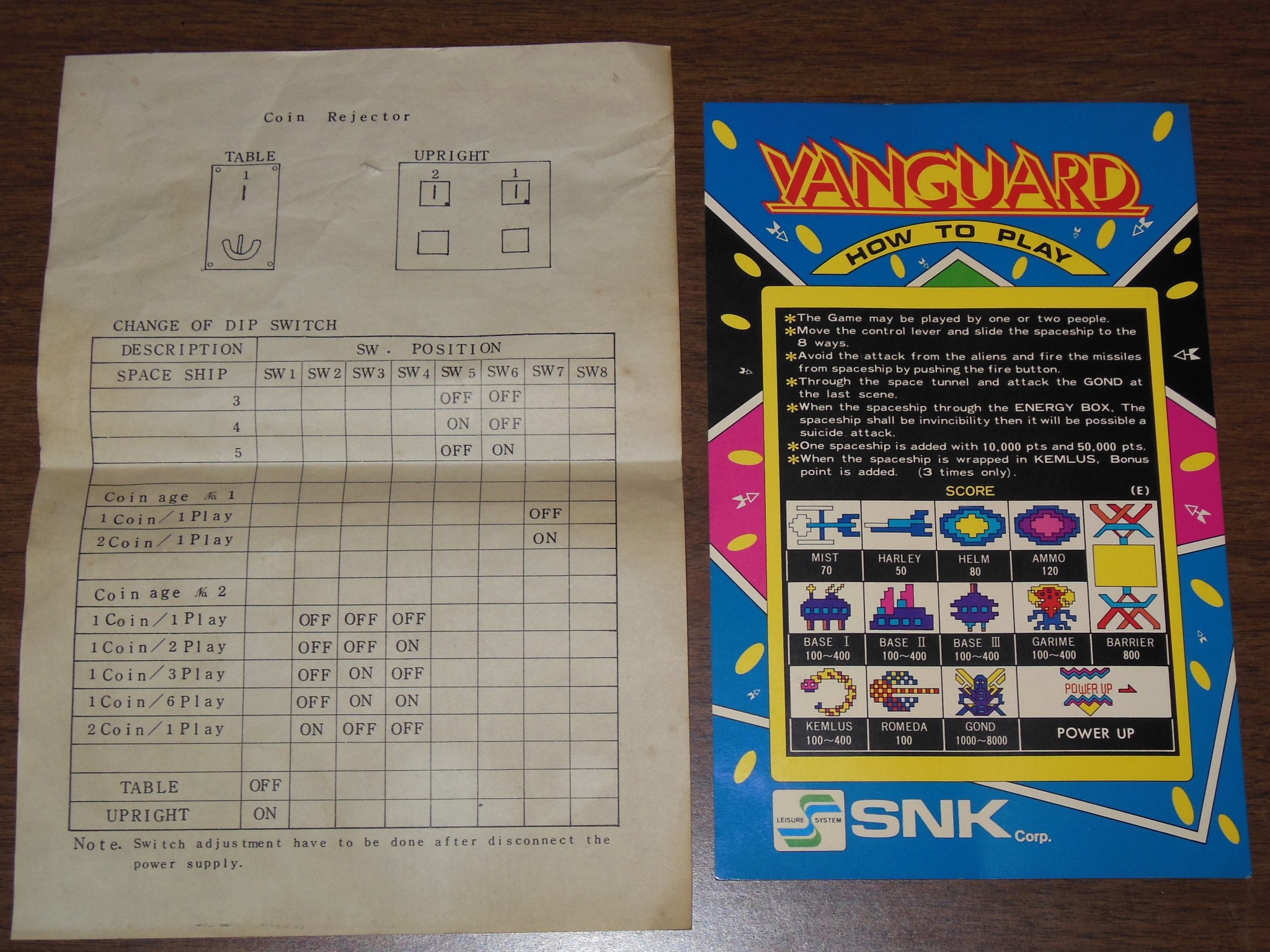 The game PCB and power supply components were removed in preparation for vacuuming the inside. In the base of the cabinet I found the game PCB DIP switch sheet and instruction card, presumably originally supplied with the machine.