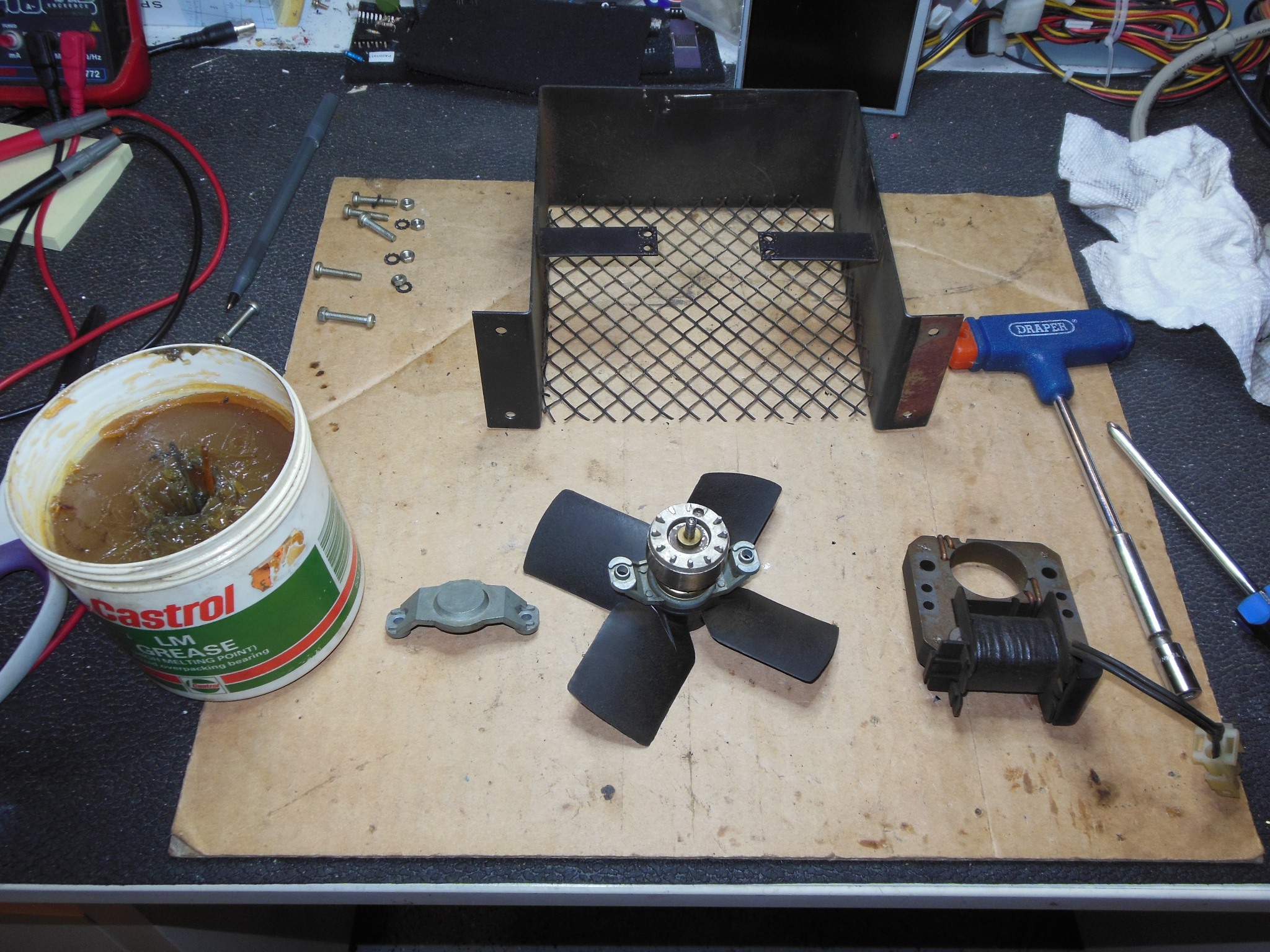 The power supply fan was disassembled, cleaned and the bearings greased. It was one of the best condition fans I'd seen - surface dirt but almost none of the rust usually prevalent on the grill.