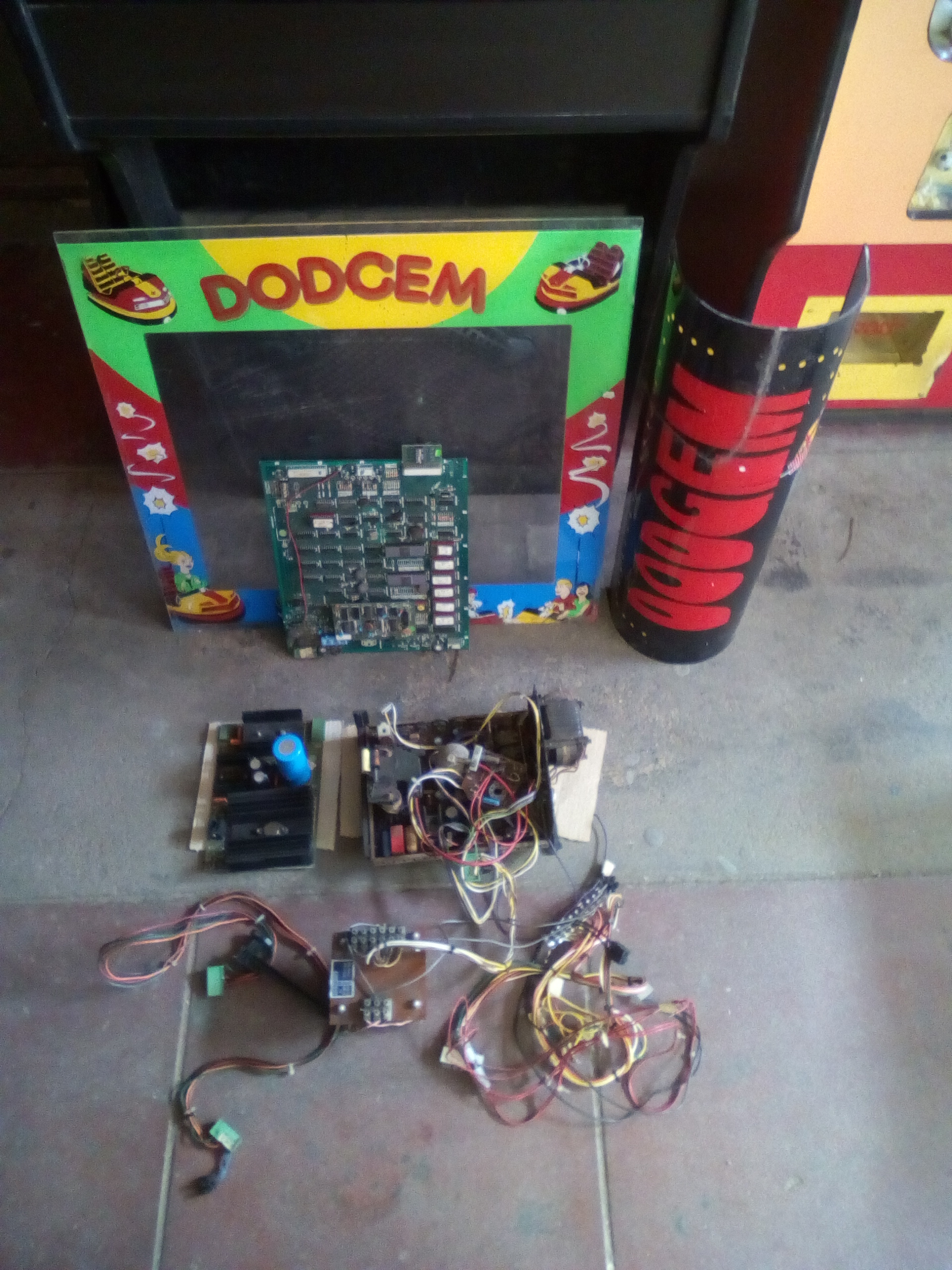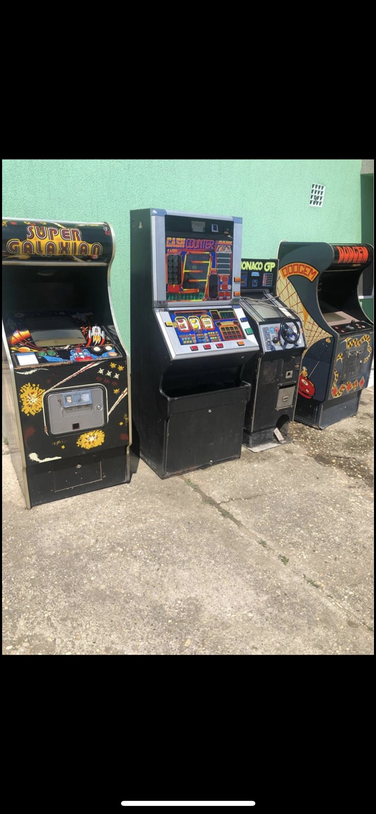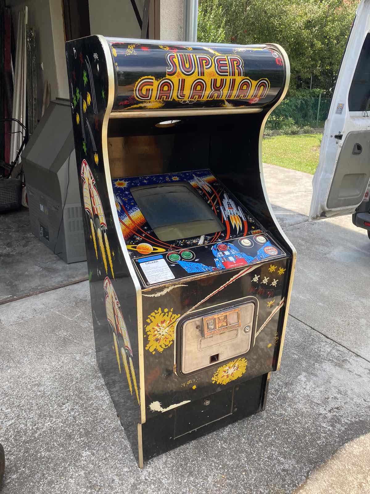 Email from Bela H. about Zaccaria Dodgem and Super Galaxian uprights found in pub storage. Note that the Super Galaxian has a black and white monitor.