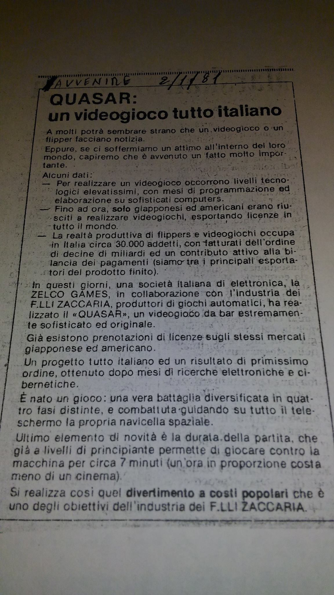 Post by SpazioTilt on Facebook about a Zaccaria Quasar magazine article.