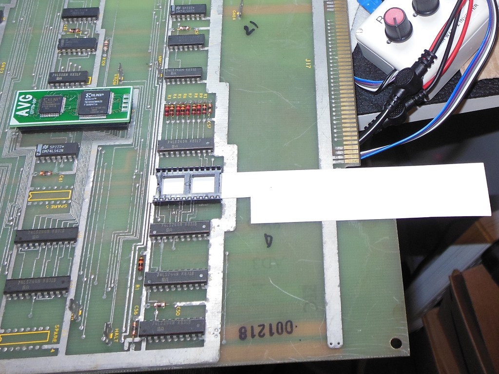 The AVG ROM socket was removed and replaced with a new socket. Since Atari didn't use a top solder mask, the first attempt to replace the socket failed due to solder bridges on the top side of the board. For the second attempt I made a cardboard spacer to keep the socket slightly higher than the PCB to prevent solder from overflowing the bare pads. The second attempt was successful. After cleaning the ROM pins, reinstalling and retesting I was rewarded with the vector output of a running board that appeared to play through OK on the bench :)