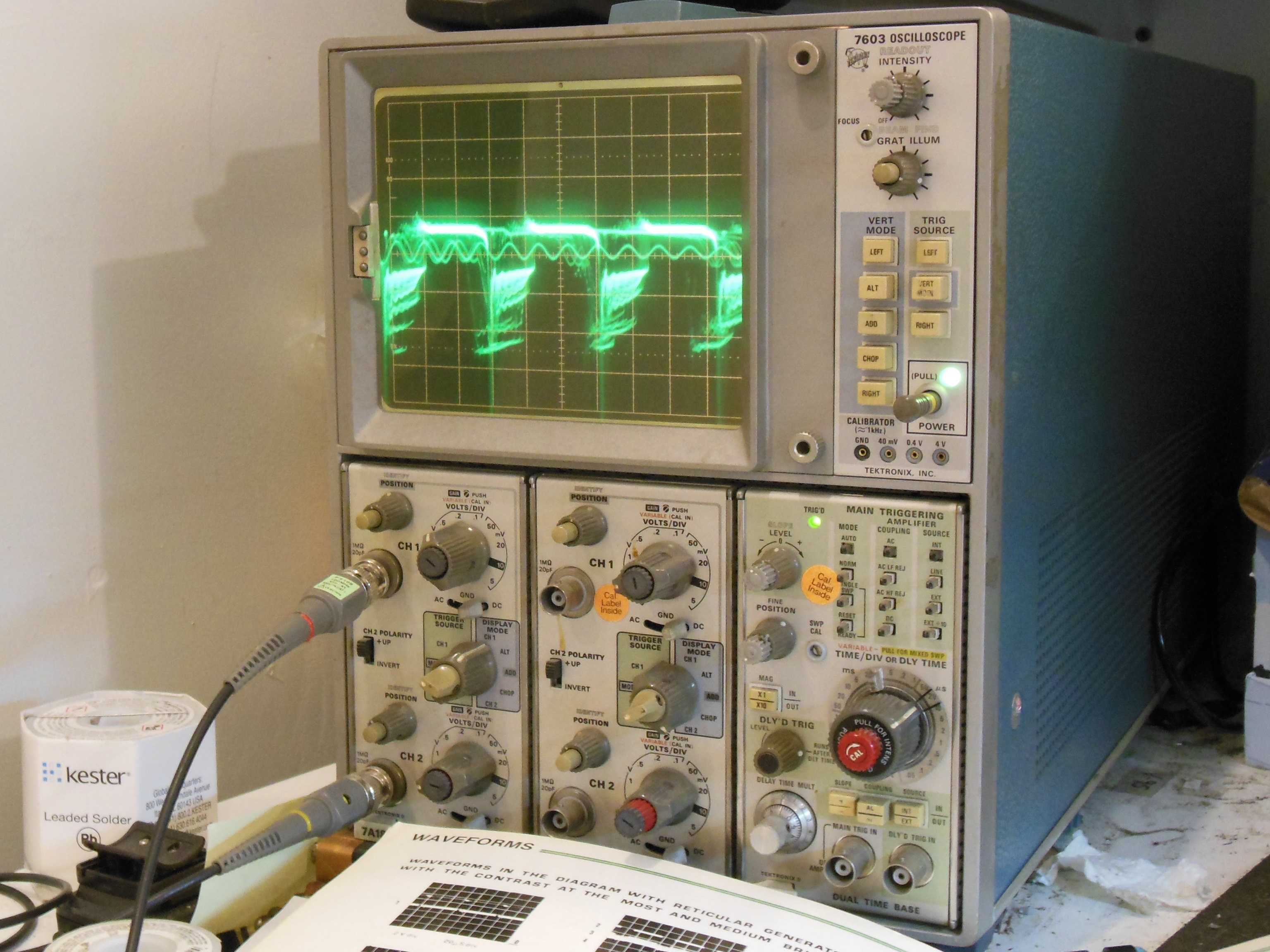 Checking the base drive TP12 of TR17 (BU208A) the Horizontal Output Transistor (HOT) on the scope found a horrible mess. Removing and checking TR17 using a back-to-back diode test found no issue. TR17 was fitted back into its socket but leaving the can (collector) isolated to allow the base drive at TP12 to be checked without the LOPT connected. The signal looked clean and similar to the reference diagram in the manual. I suspected the LOPT was bad.