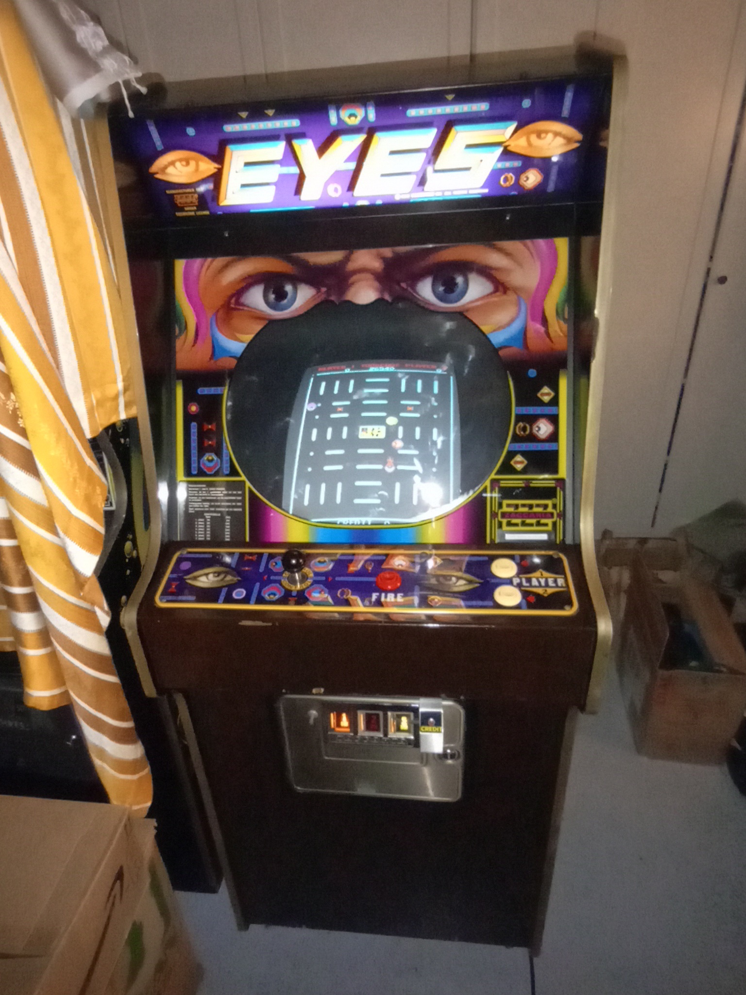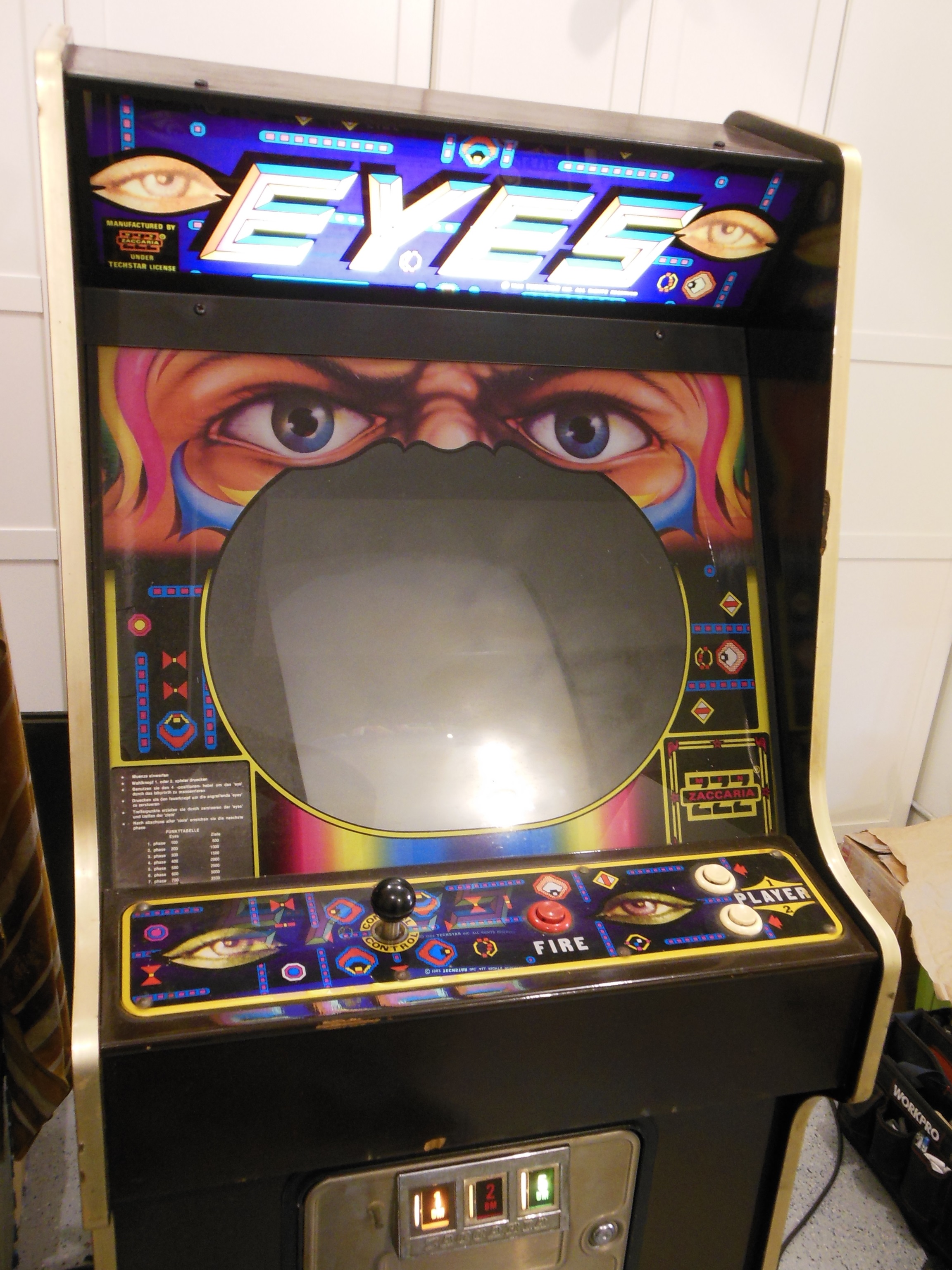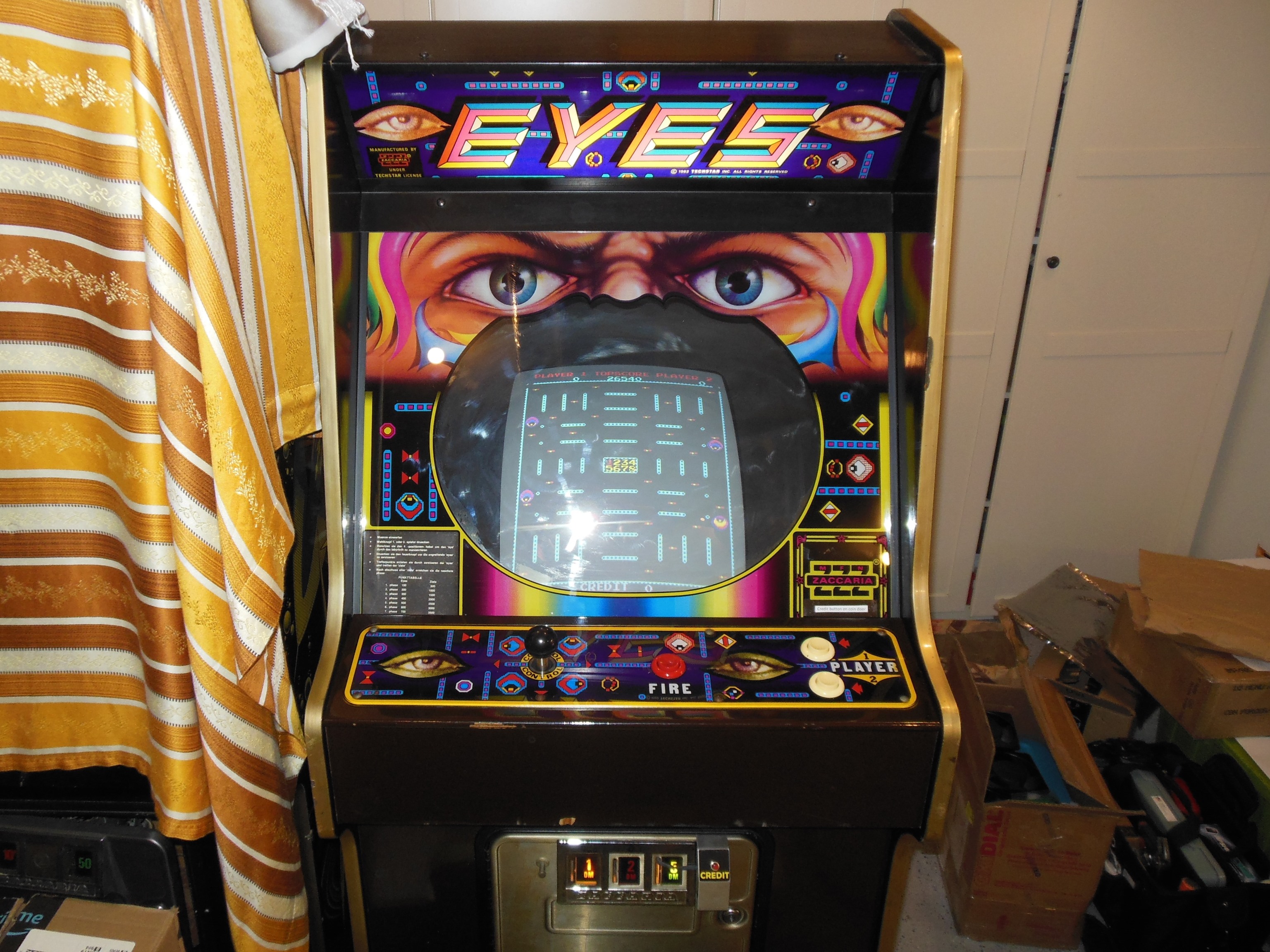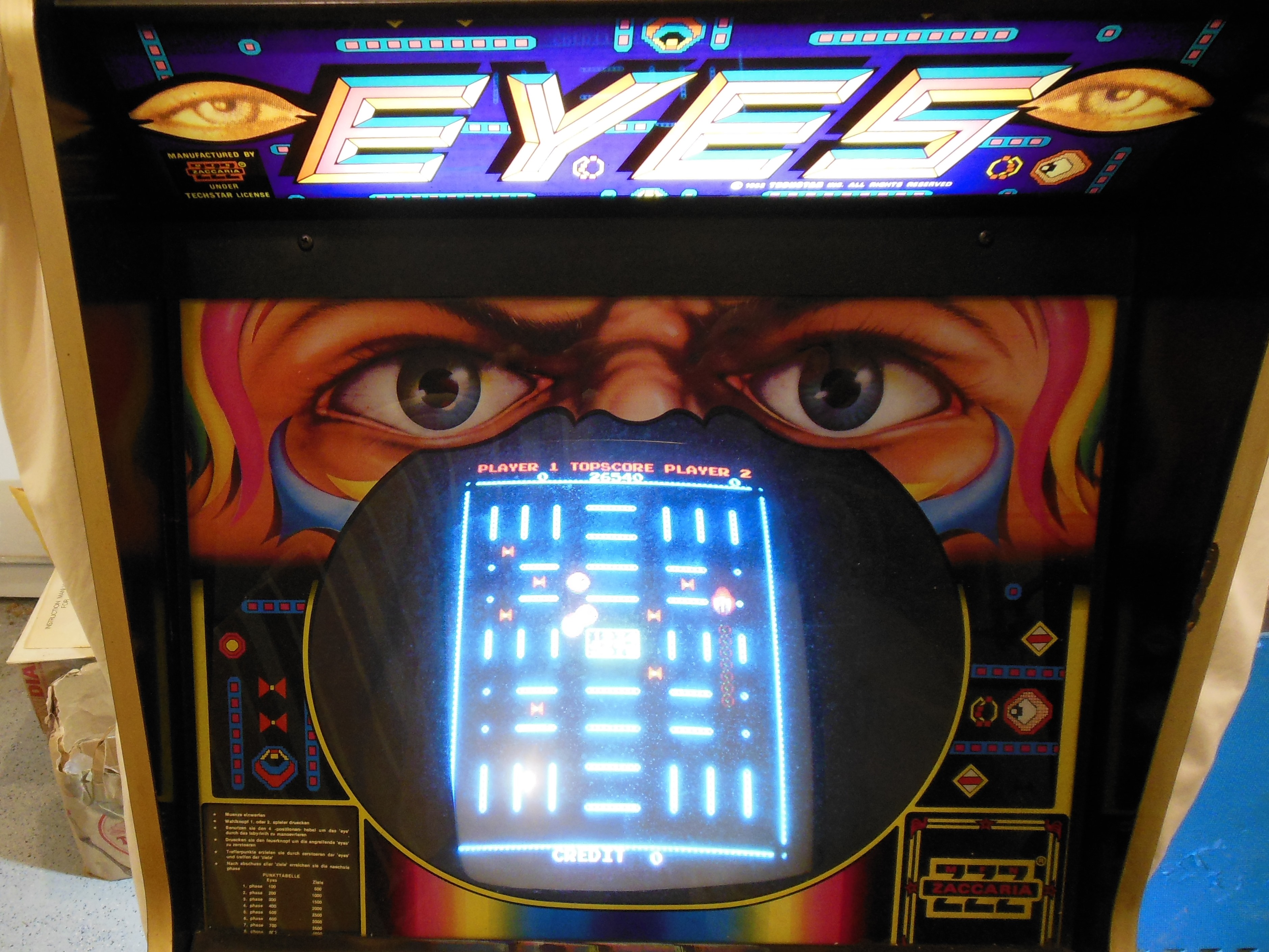 I had independently acquired some Eyes game PCBs that included one Zaccaria produced board. The serial number on that PCB was V137835, one before the cabinet V137836. It's the closest randomly acquired combination I'd seen. On the bench the game booted, coined and started but joystick 'up' was stuck. Visual inspection identified a broken resistor pack, RA9 (1K, 9-pin) that I ordered.