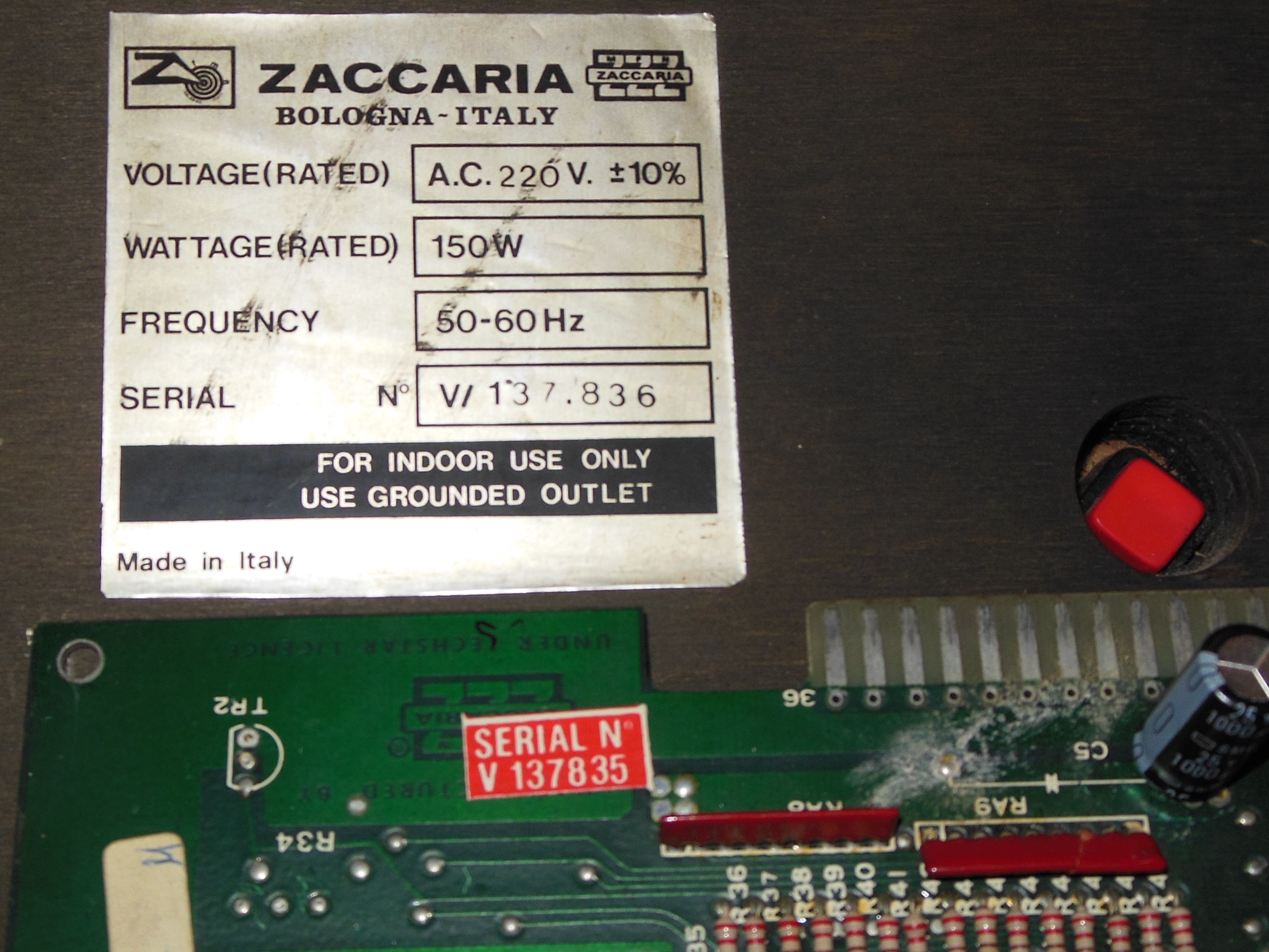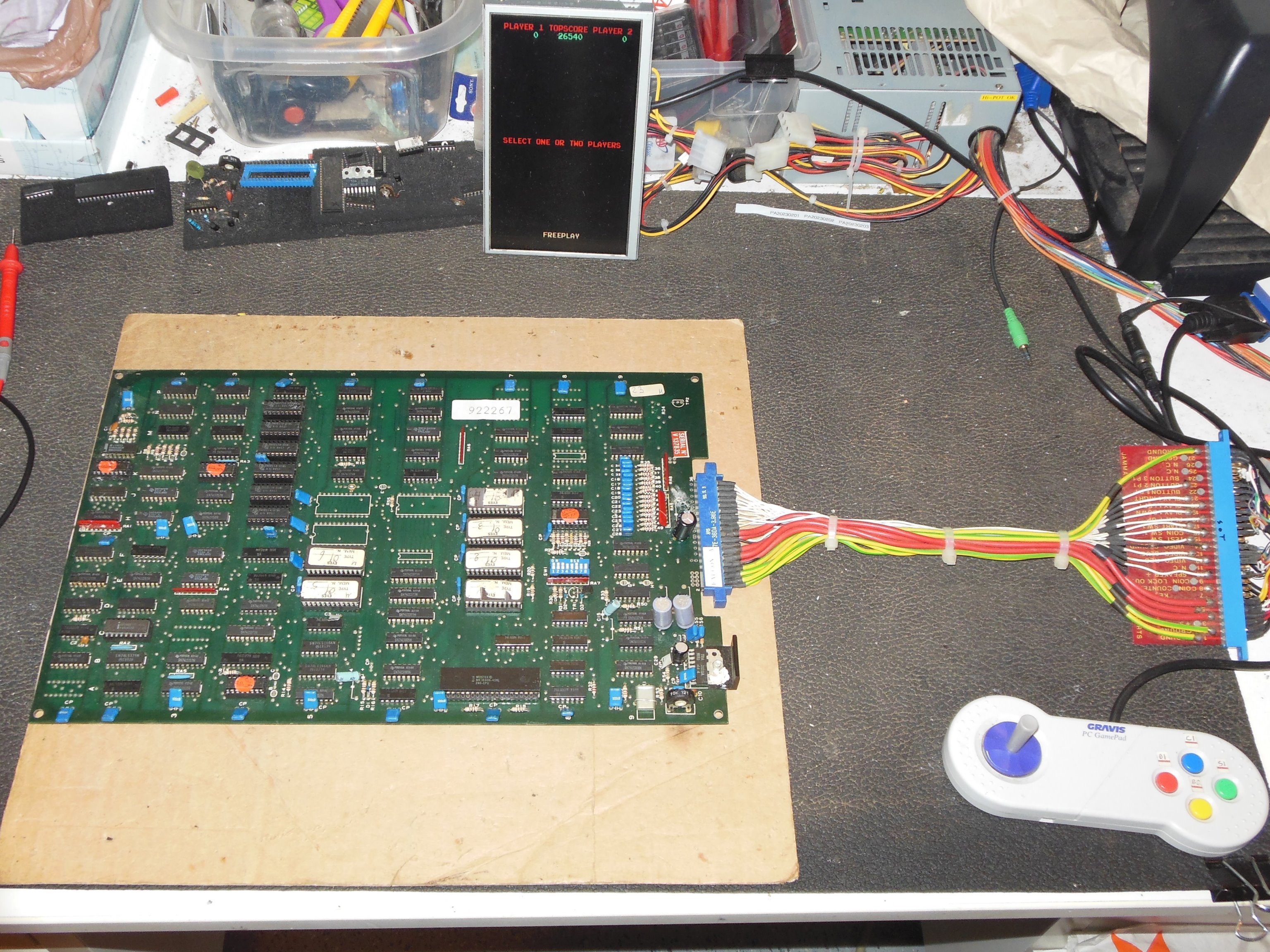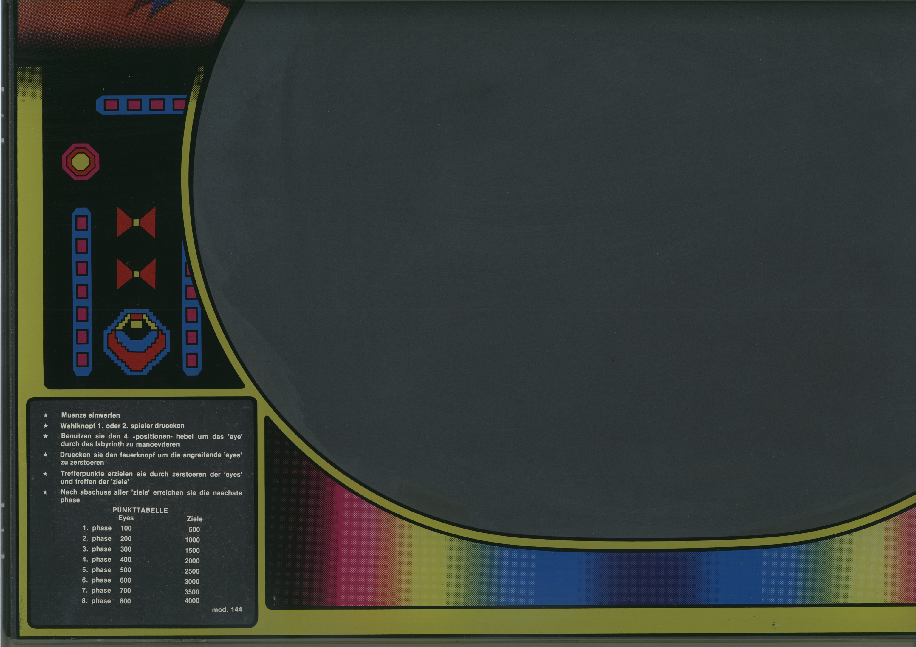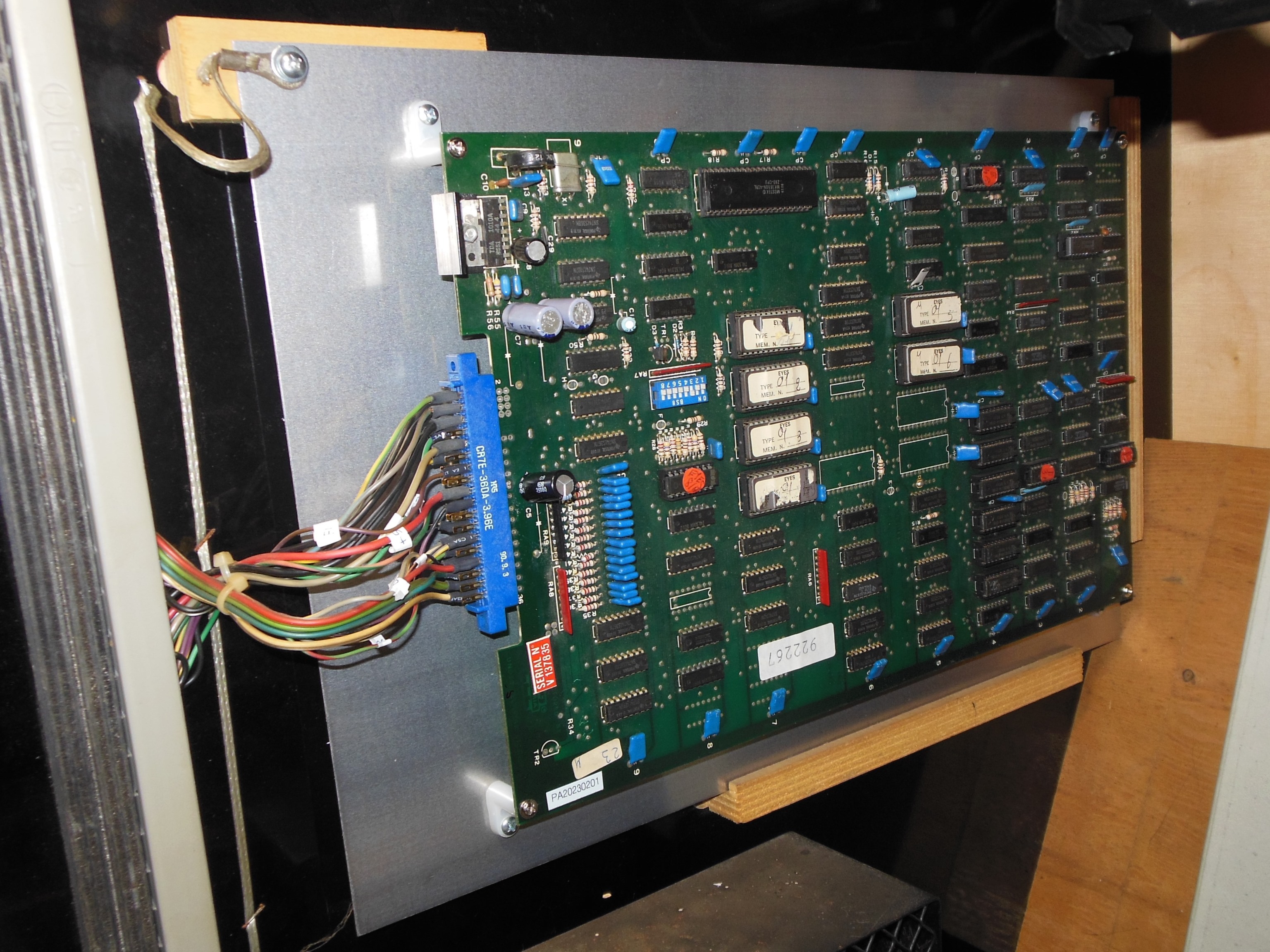 I had independently acquired some Eyes game PCBs that included one Zaccaria produced board. The serial number on that PCB was V137835, one before the cabinet V137836. It's the closest randomly acquired combination I'd seen. On the bench the game booted, coined and started but joystick 'up' was stuck. Visual inspection identified a broken resistor pack, RA9 (1K, 9-pin) that I ordered.
