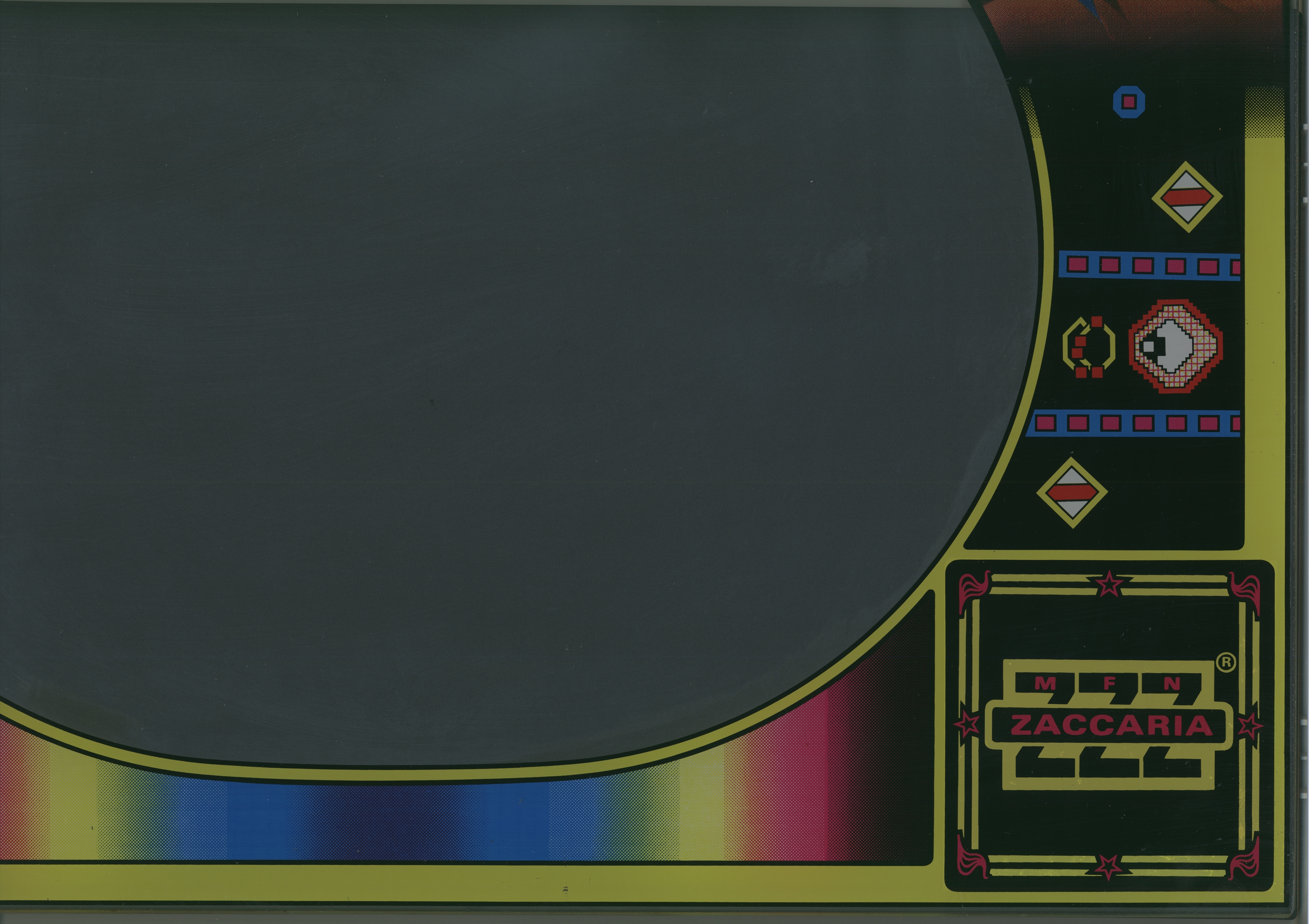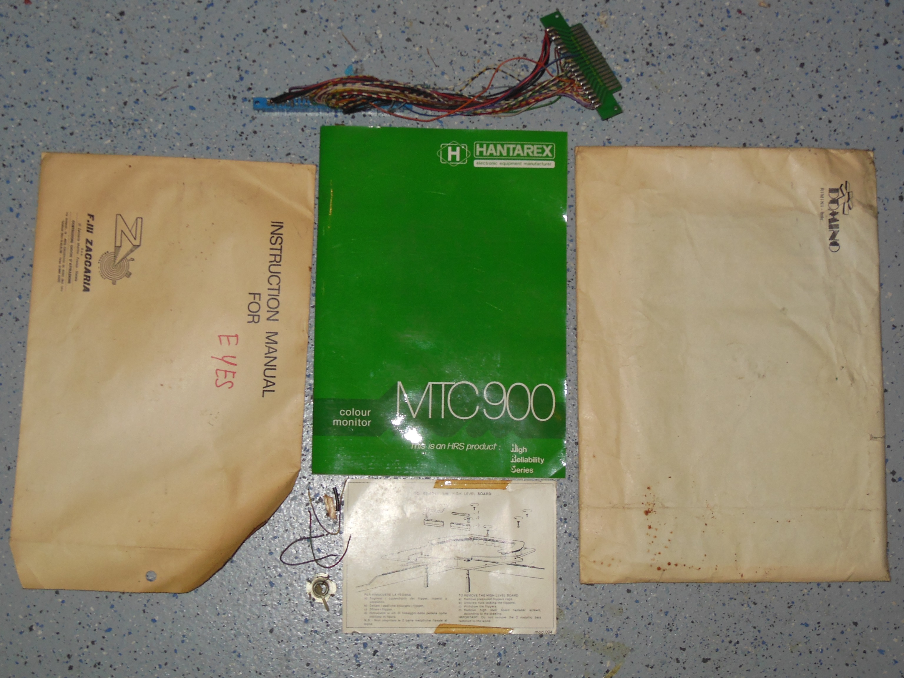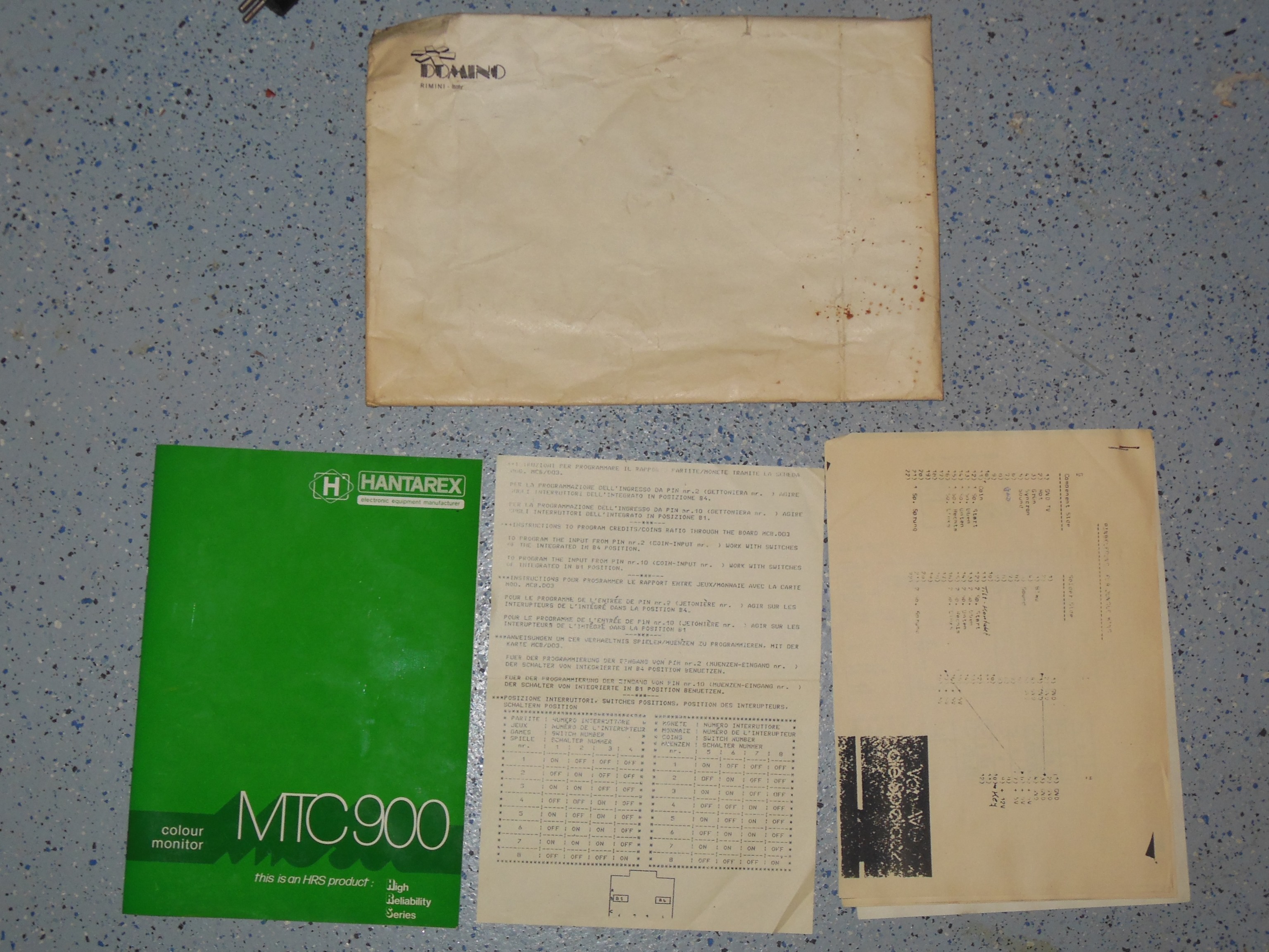 In the bottom of the cabinet there were several items. Loose was a wiring adaptor that looked Konami to JAMMA and a Zaccaria Devil Riders(?) pinball upper playfield assembly card MOD 094. There were also two envelopes, a Zaccaria Eyes Instruction Manual envelope containing only a Hantarex MTC-900 manual but no game manual, and a Domino Rimini envelope containing a settings sheet for an MCB/003 credit PCB and Jungle King pamphlet.