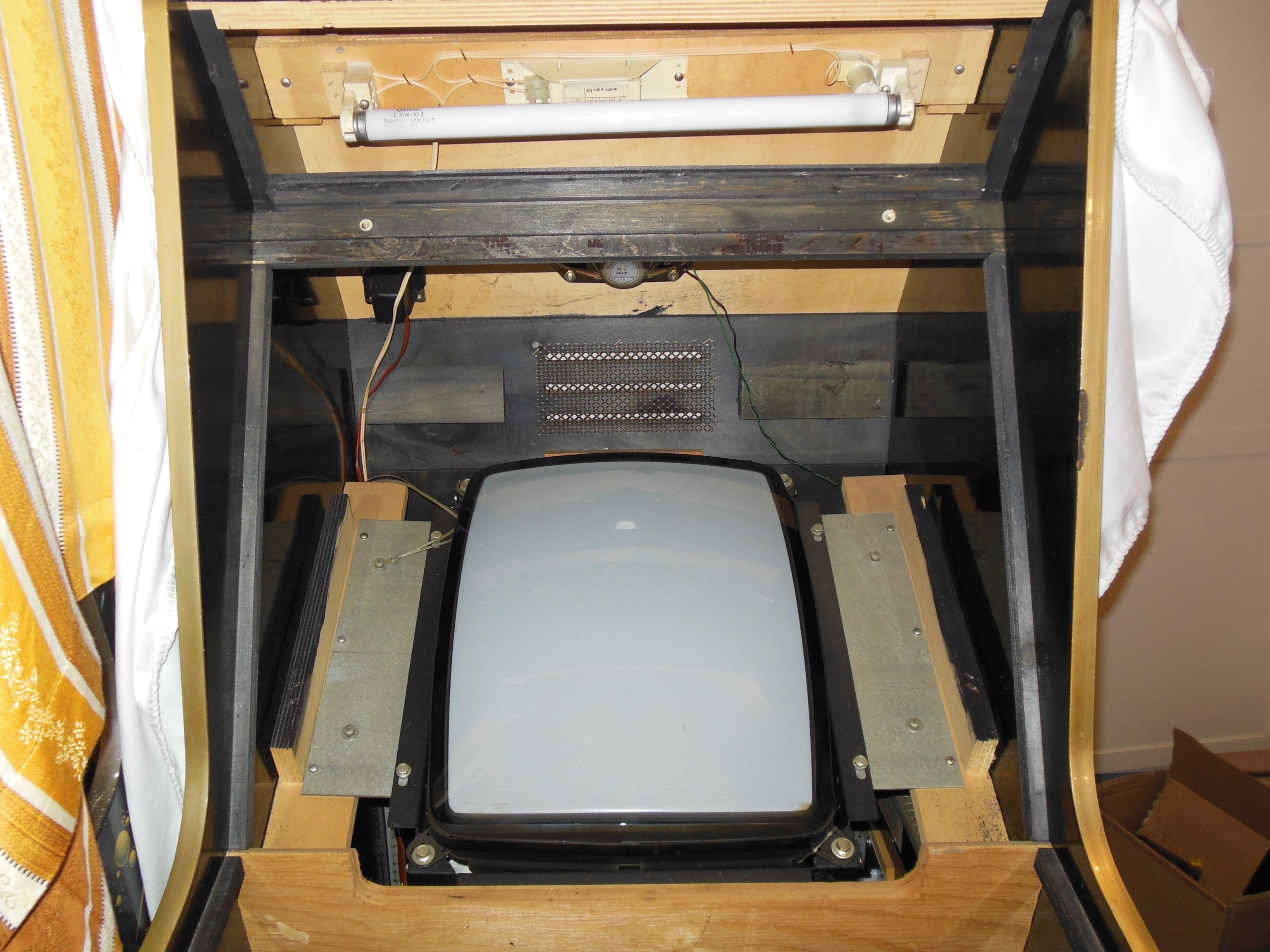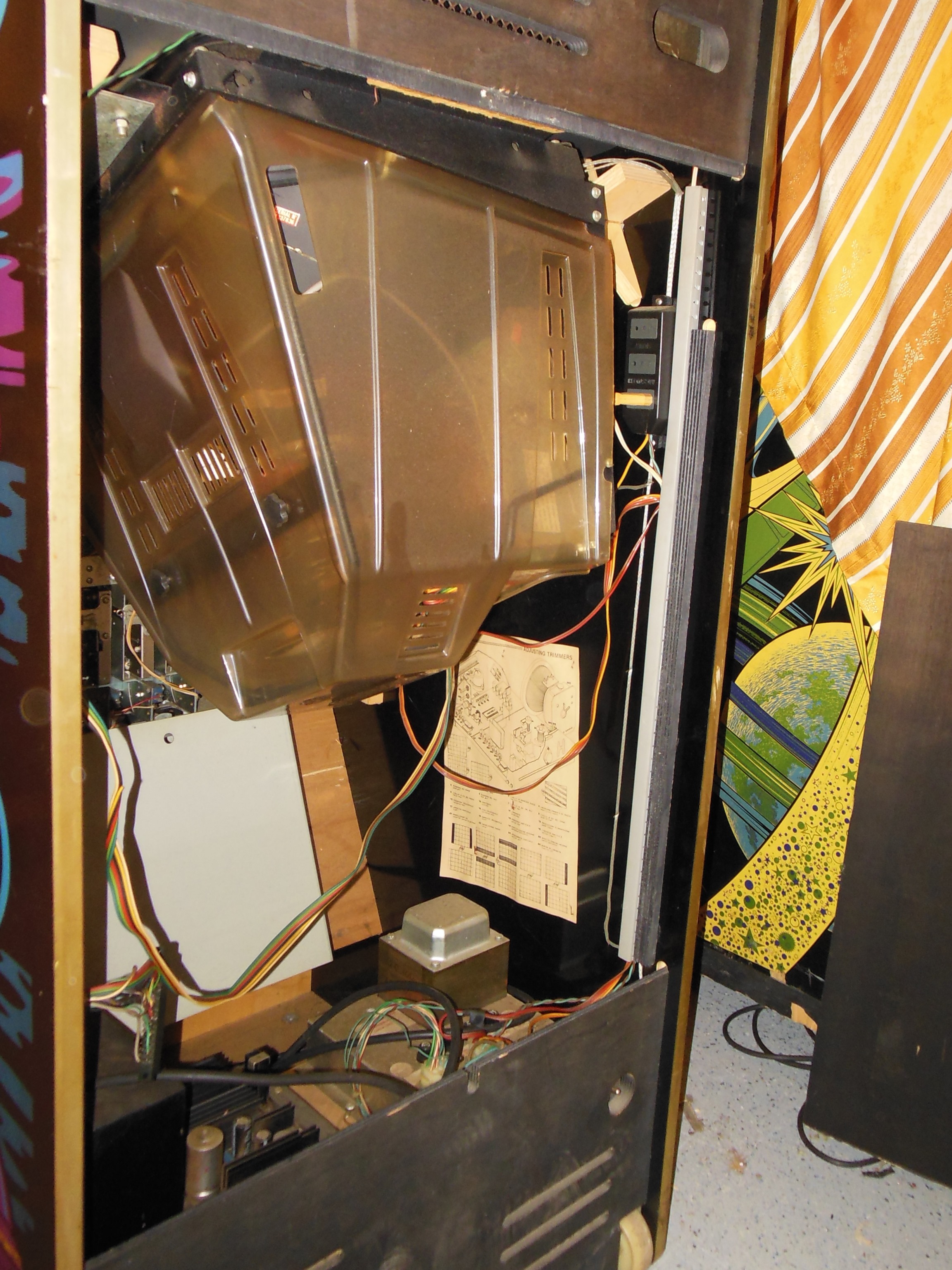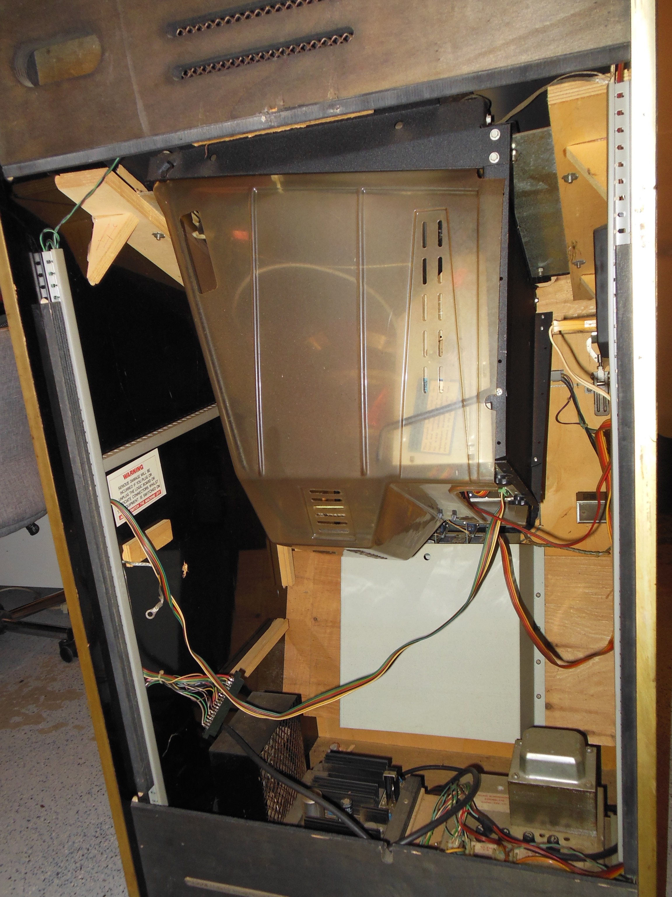 The inside of the cabinet was consistent with the outside, also in good condition. I didn't recall ever seeing a monitor cover in any other cabinet so I don't know if all cabinets had them but they were all removed for convenience or just this run of cabinets had them. There was also no game PCB fitted and the game PCB edge connector looked like it had been rewired.