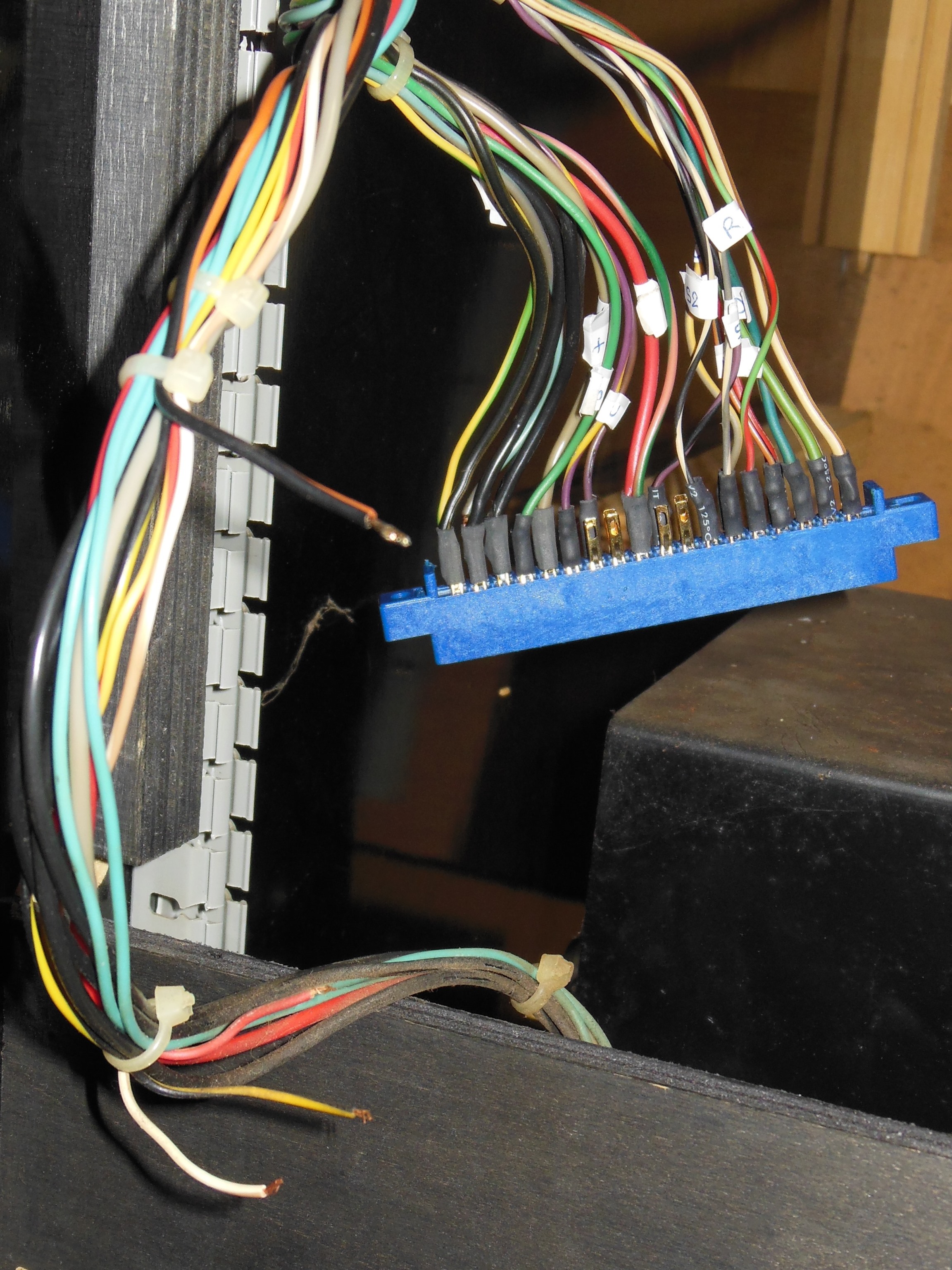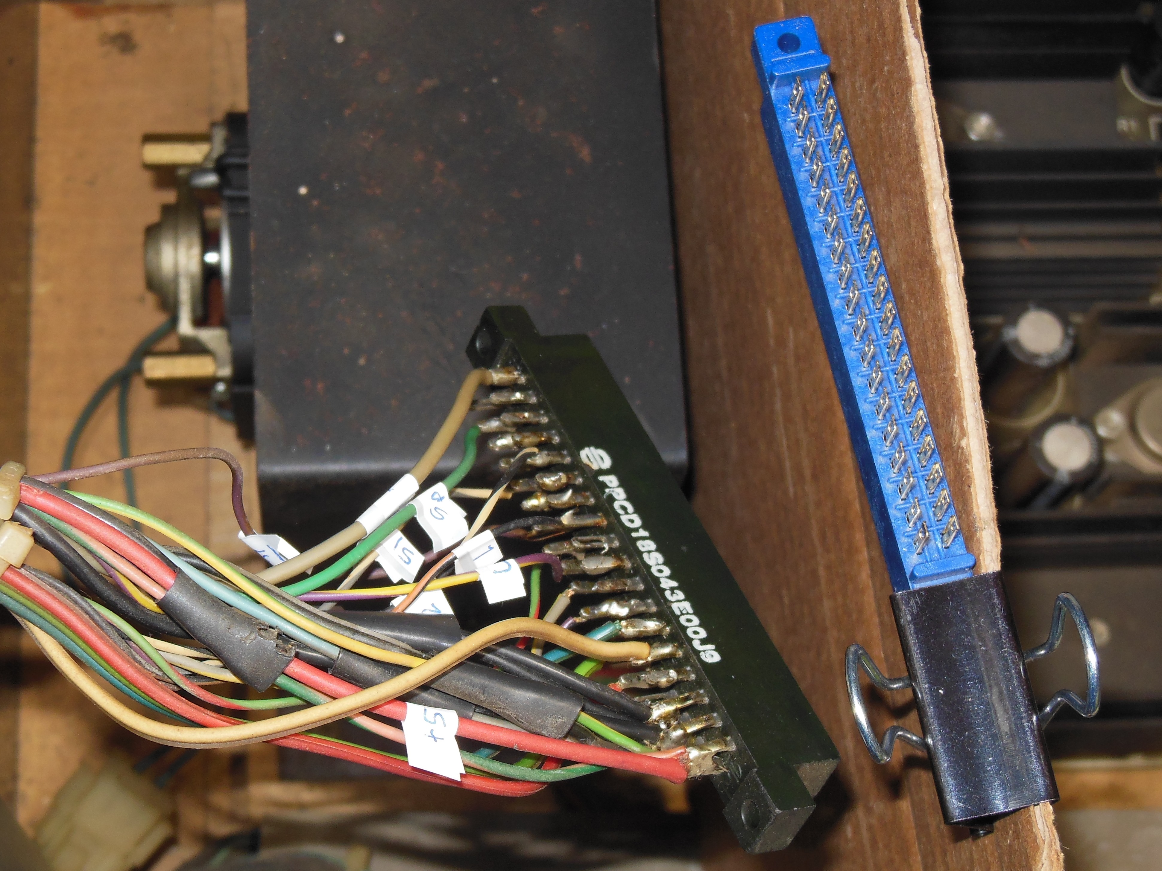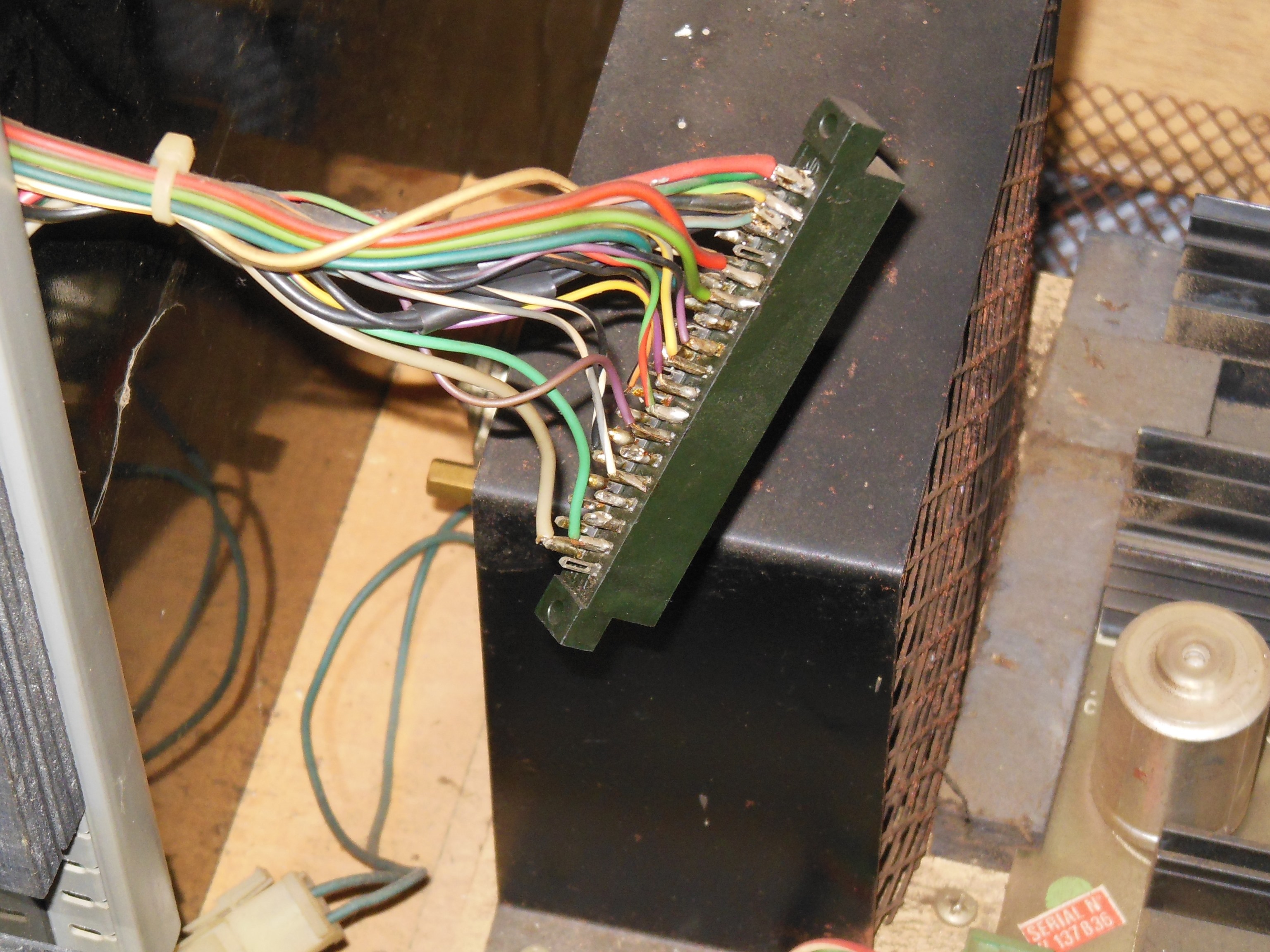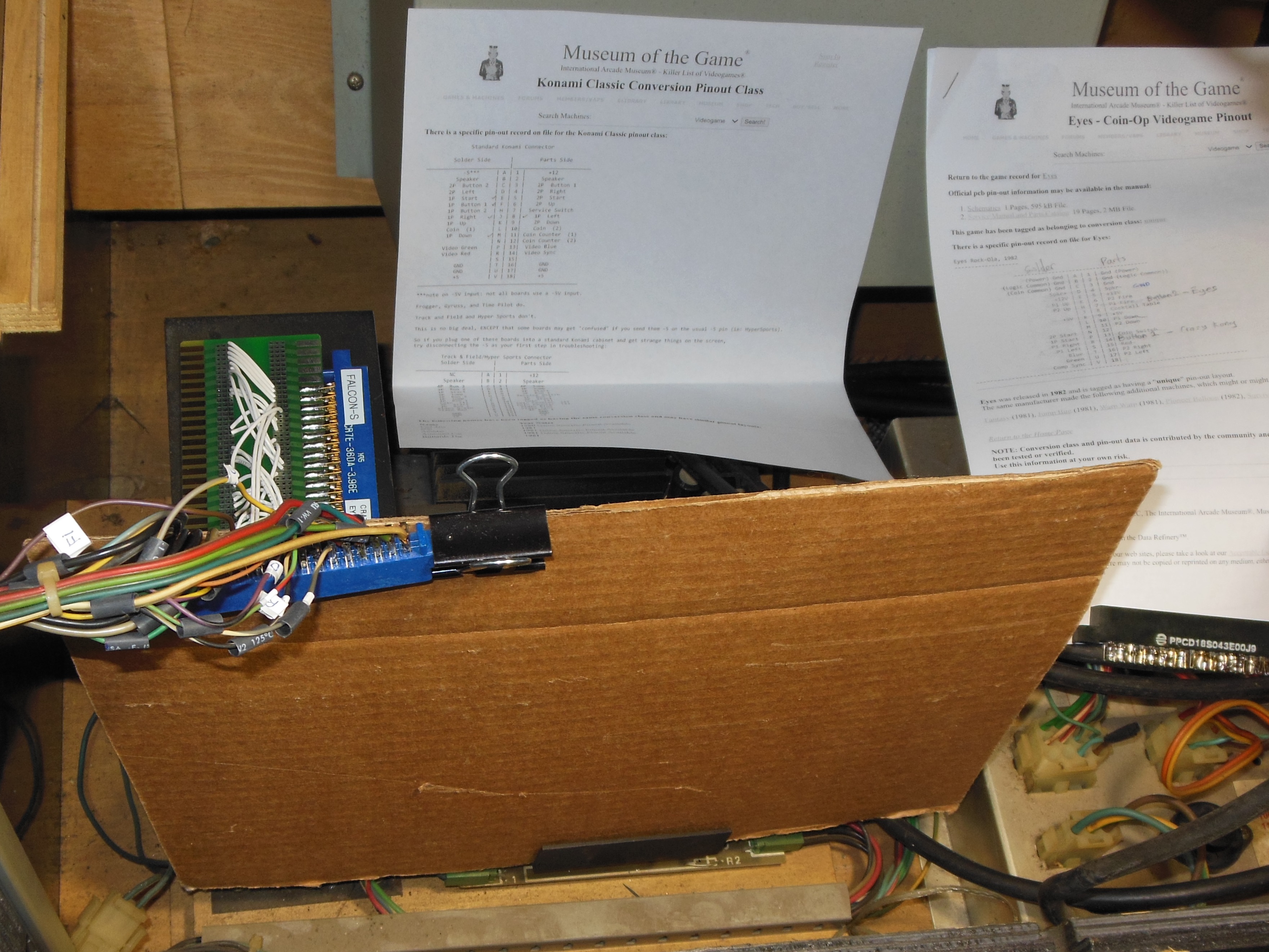 Using the Konami pinout, Eyes pinout, reference JAMMA adaptor and a meter to confirm the cabinet wiring, a new game PCB edge connector was wired in.