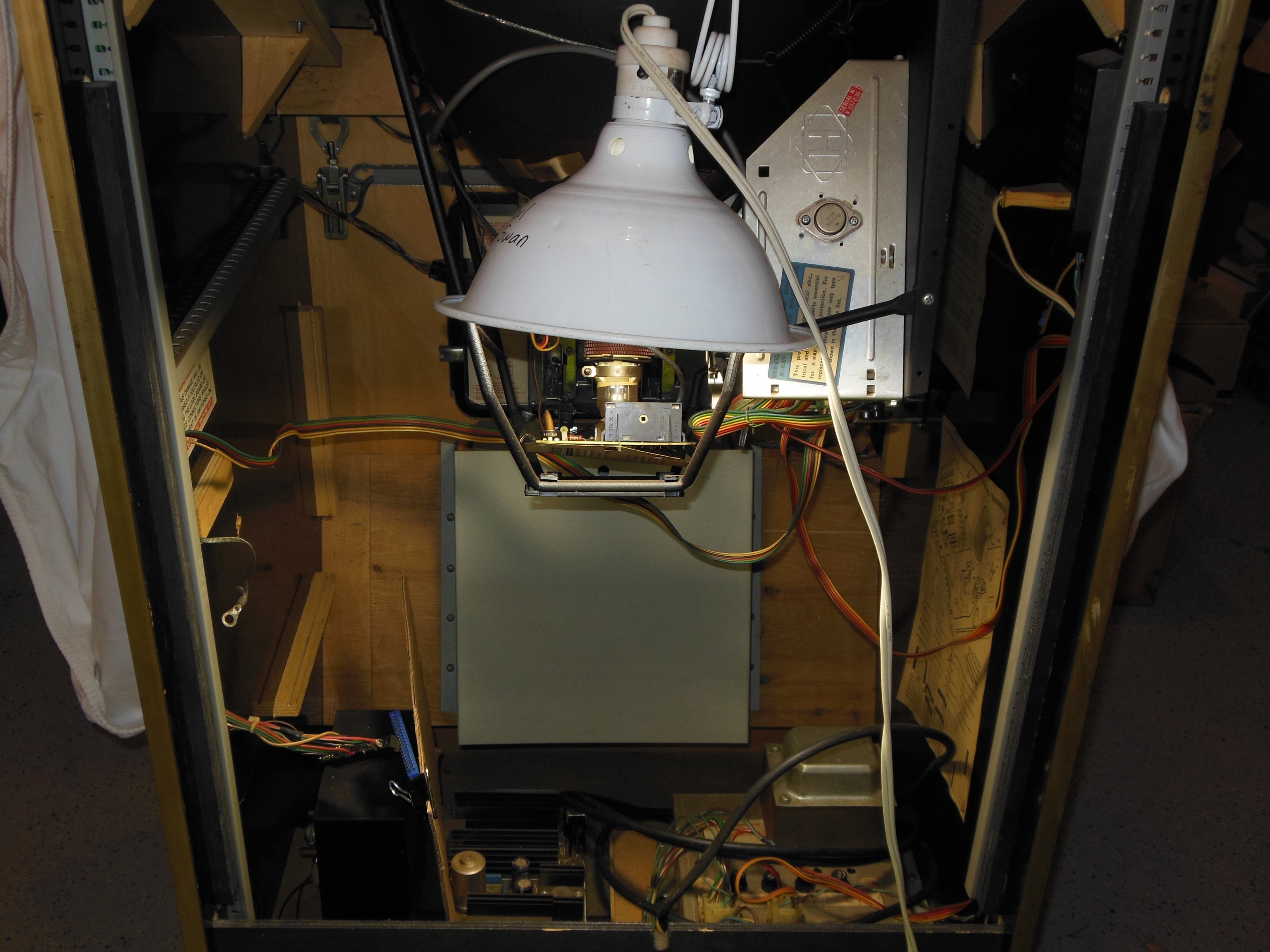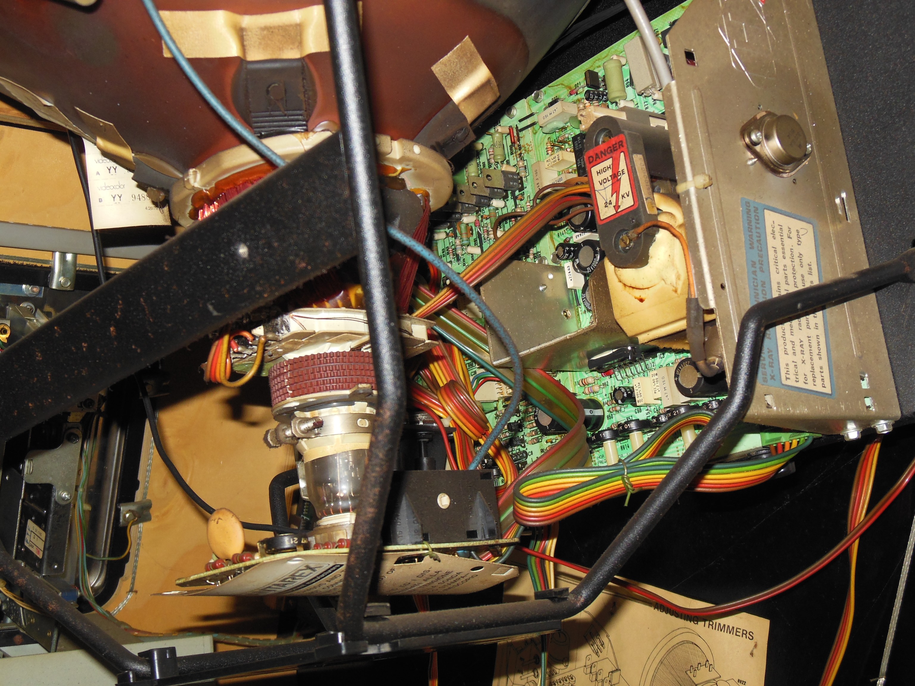 For maximum airflow circulation, and to see what smokes, the monitor shroud was removed revealing a very clean Hantarex MTC-900 monitor chassis. The shroud seems to have prevented a lot of dust build up but these cabinets need all the air flow they can get.