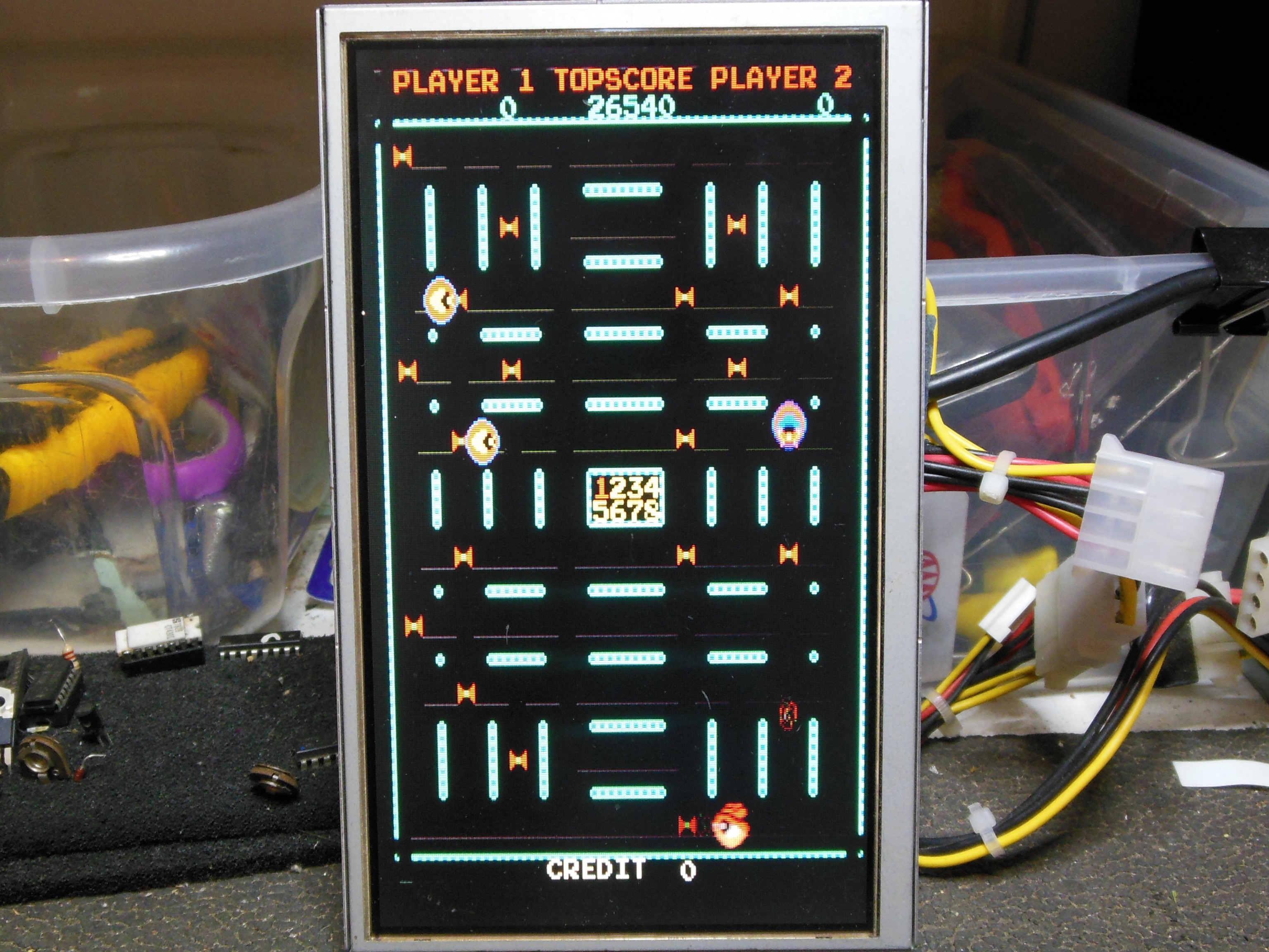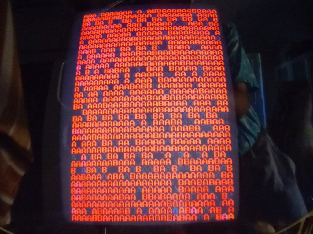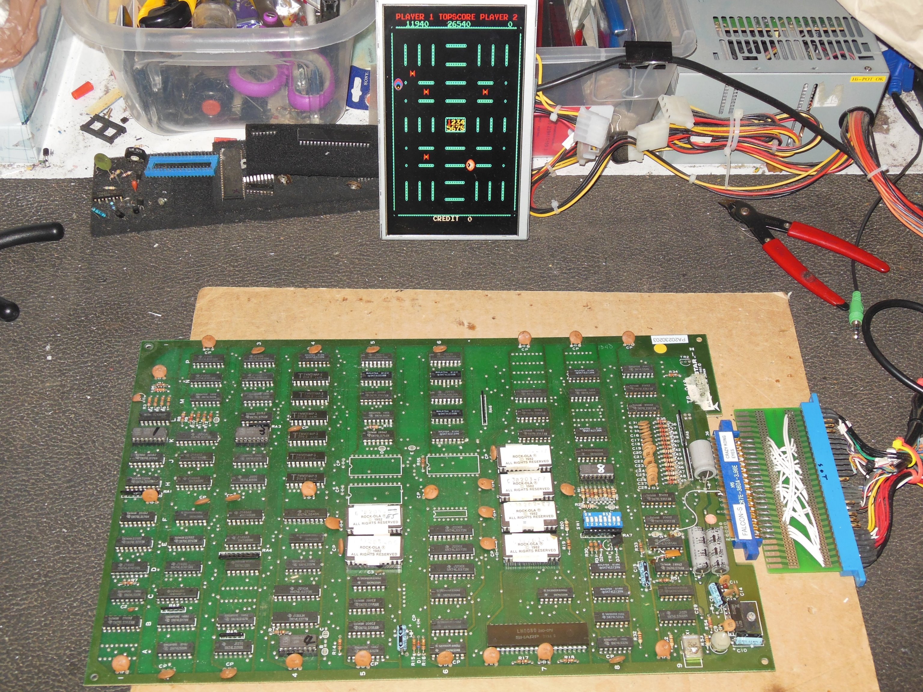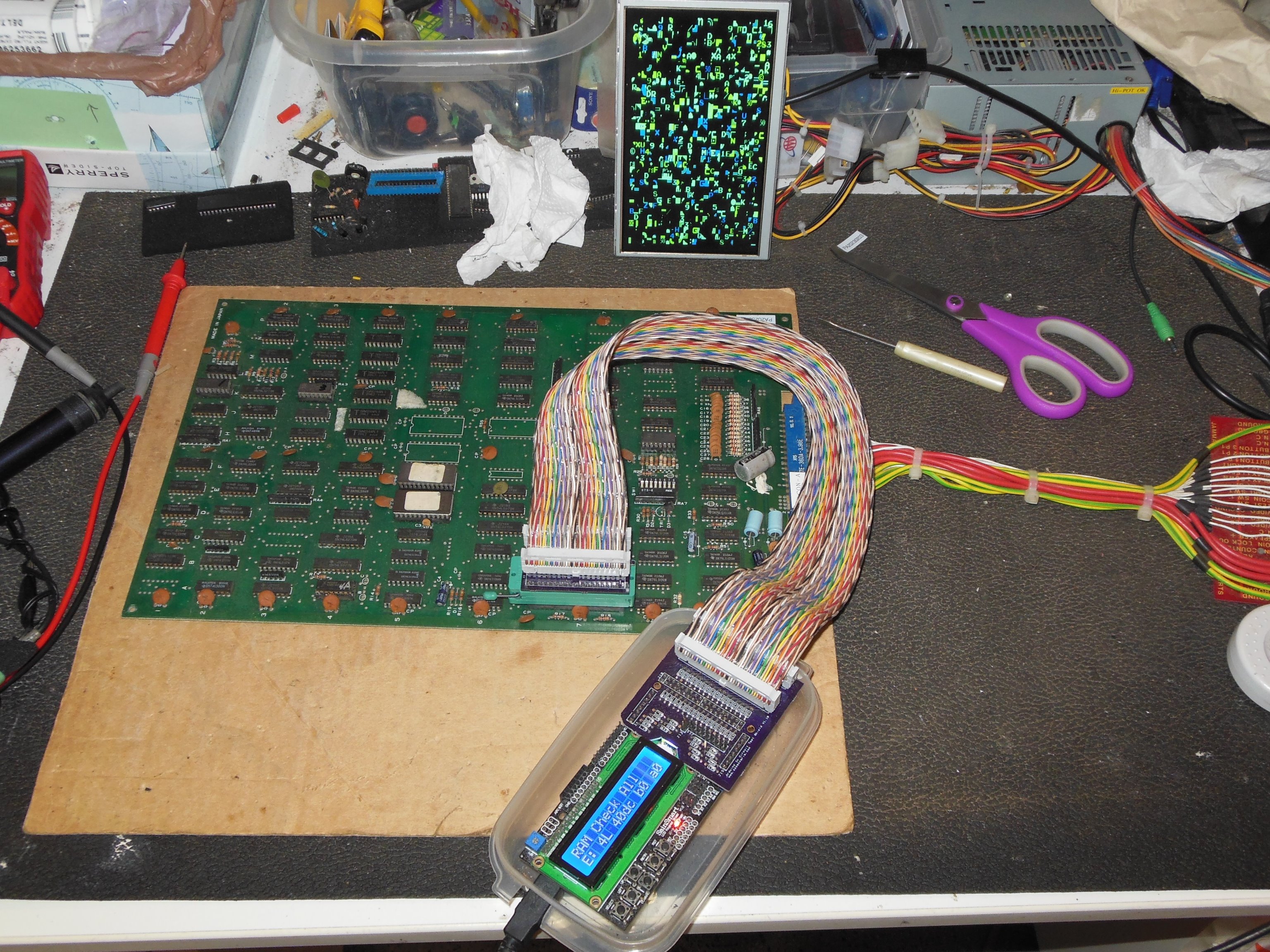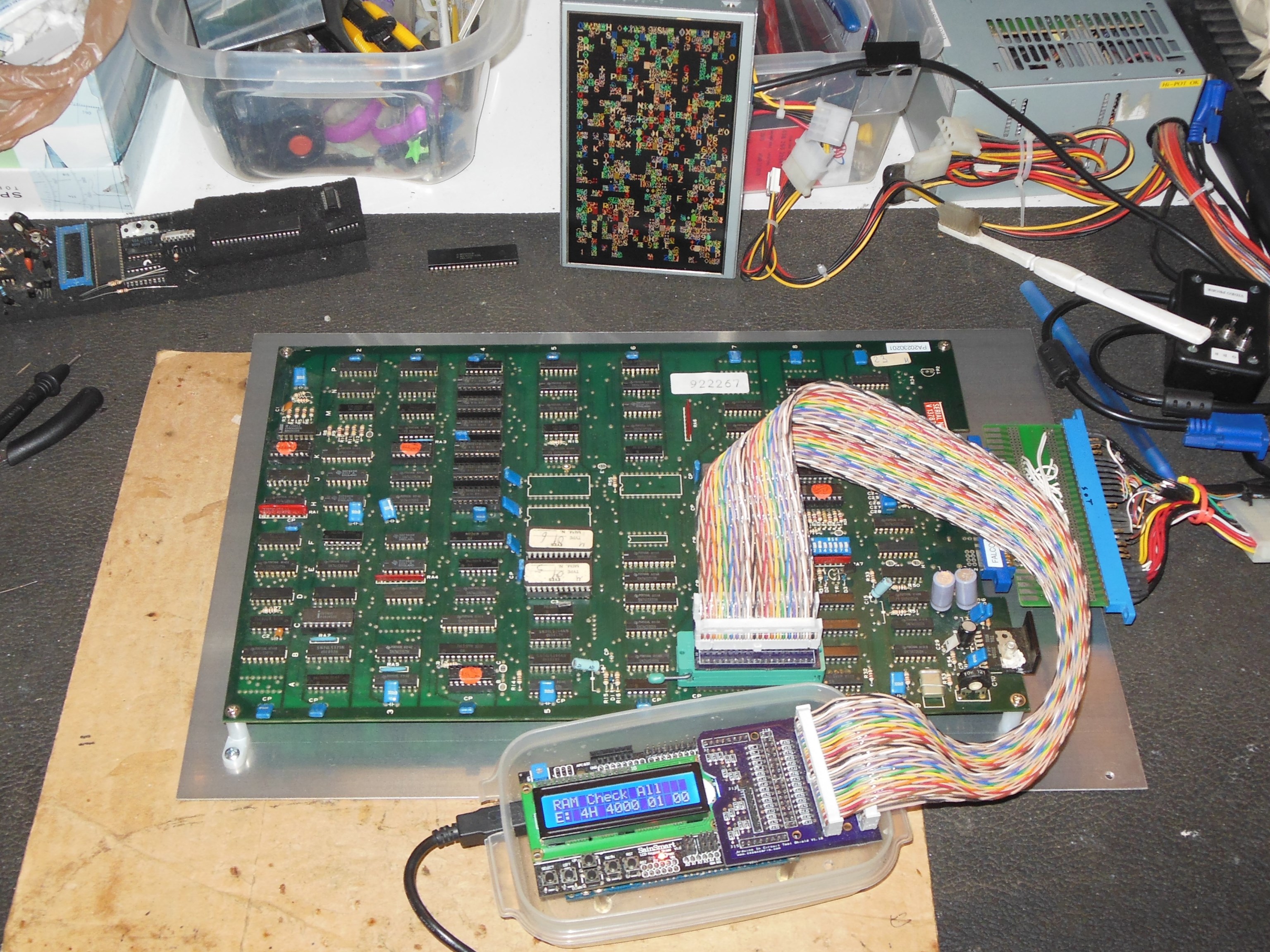 The second PCB was a Techstar version that was missing the program ROMs and CPU. Using the Arduino ICT to pattern the video RAM revealed graphics characters that didn't look like they were from Eyes. The Arduino flagged several bad RAMs with bit 0x10 bad across all banks. To try to identify the game I put the graphics ROMs in the program ROM sockets to get a quick CRC to look up but neither ROM read consistently. Inspecting the CPU socket found all the pins sprained, consistent with header pins, and I suspected that the board was converted to another game with a daughter PCB plugged into the CPU socket with the program ROMs on it, now missing. The PCB was set aside for the time being.