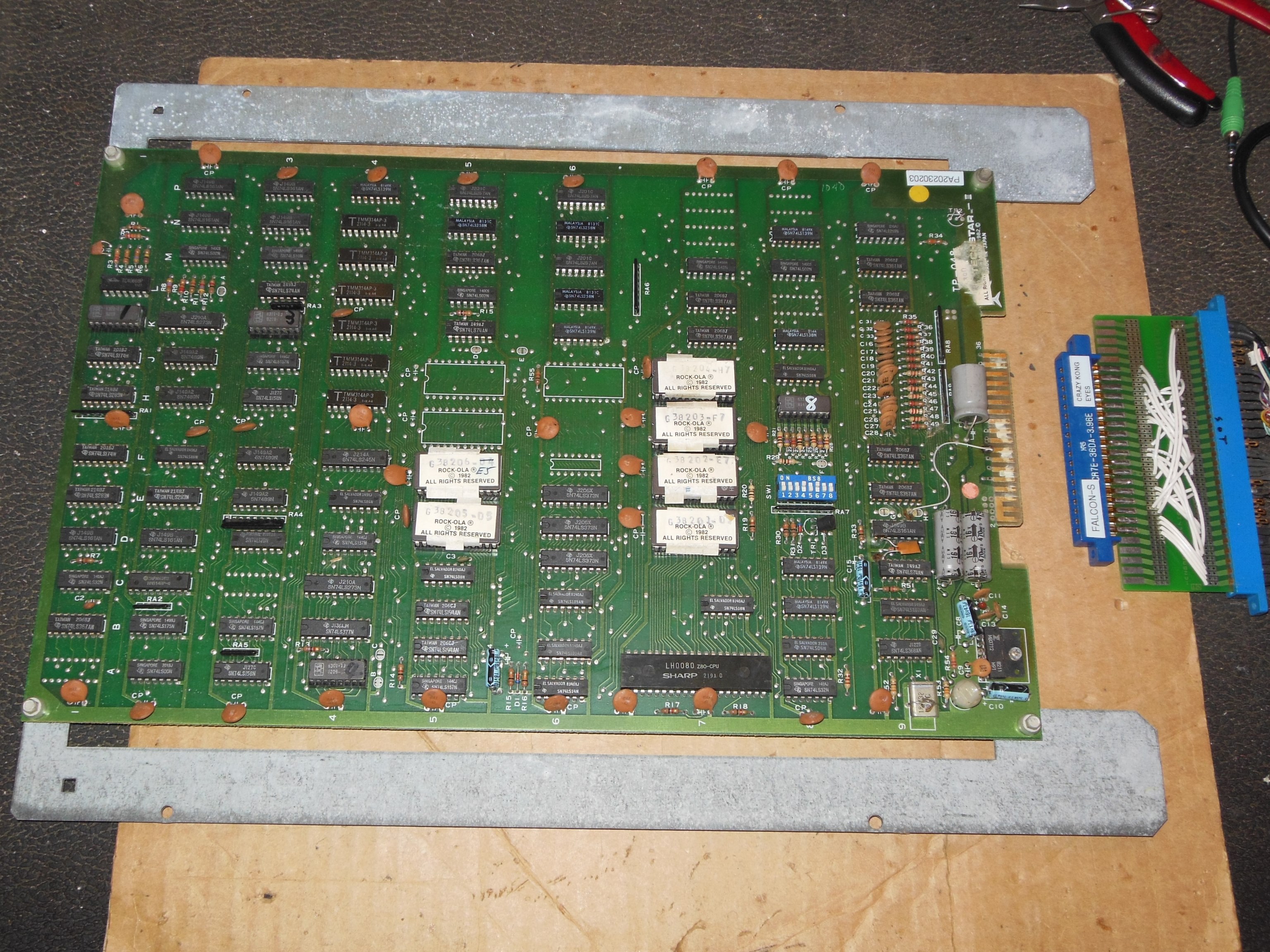 The third Eyes PCB was a Rock-Ola version that ran OK on the bench. I noticed that there were at least two differences between the Rock-Ola & Zaccaria versions. The Zaccaria version displayed "Zaccaria" in attract mode and deleted the coinage text (since Zaccaria used an external credit PCB to set coinage).