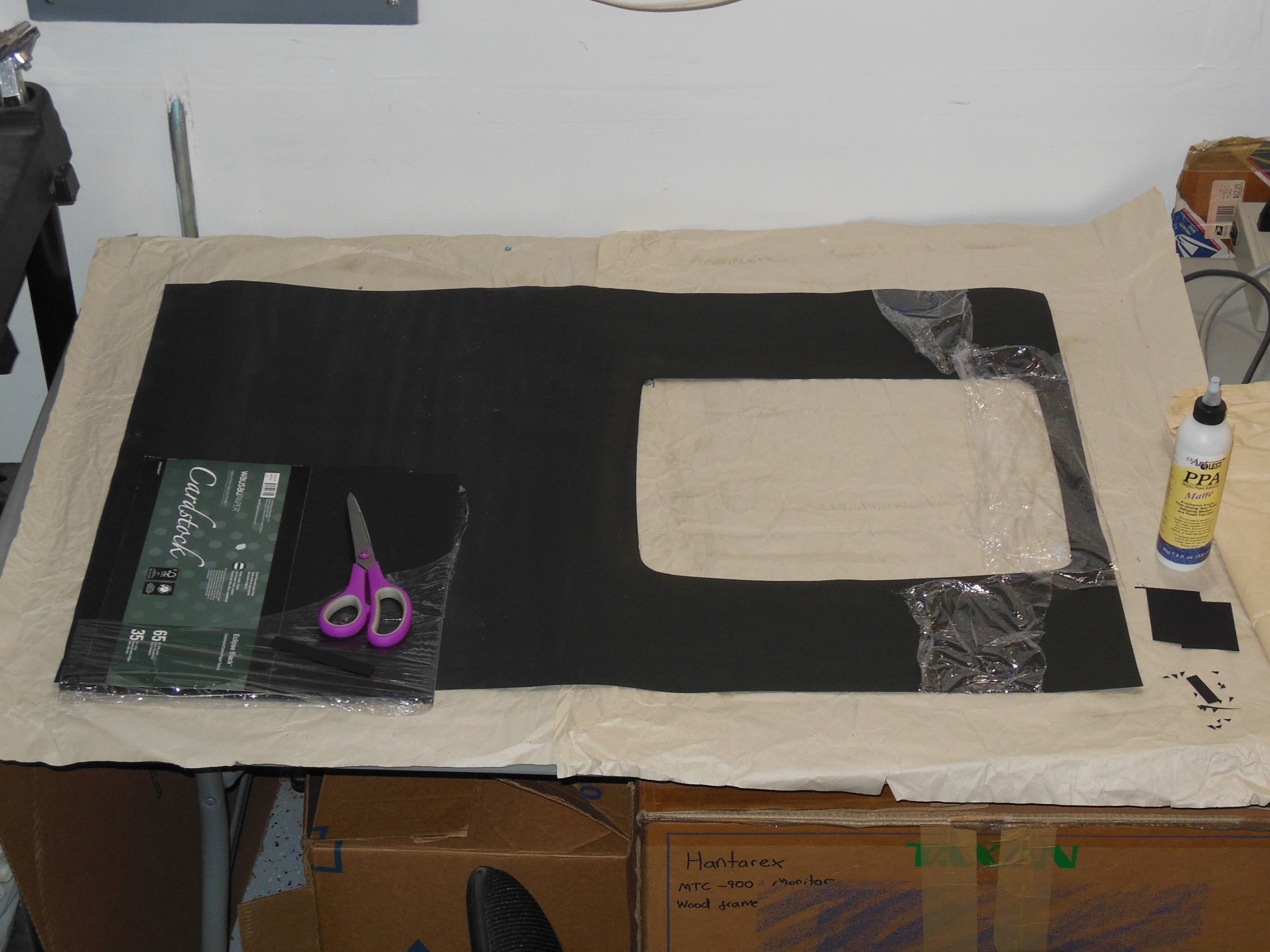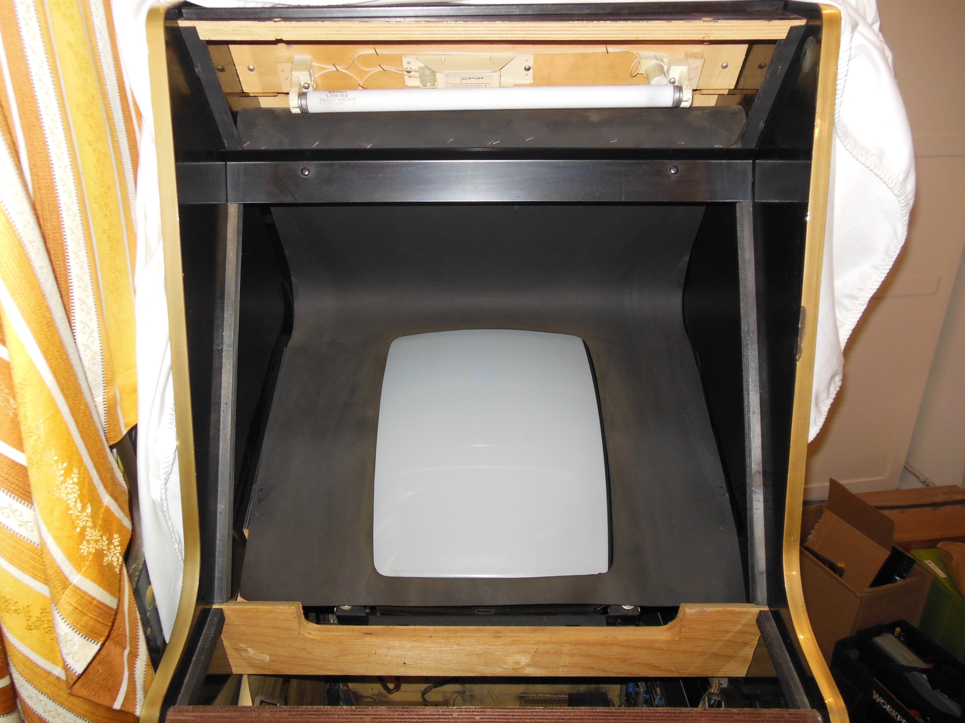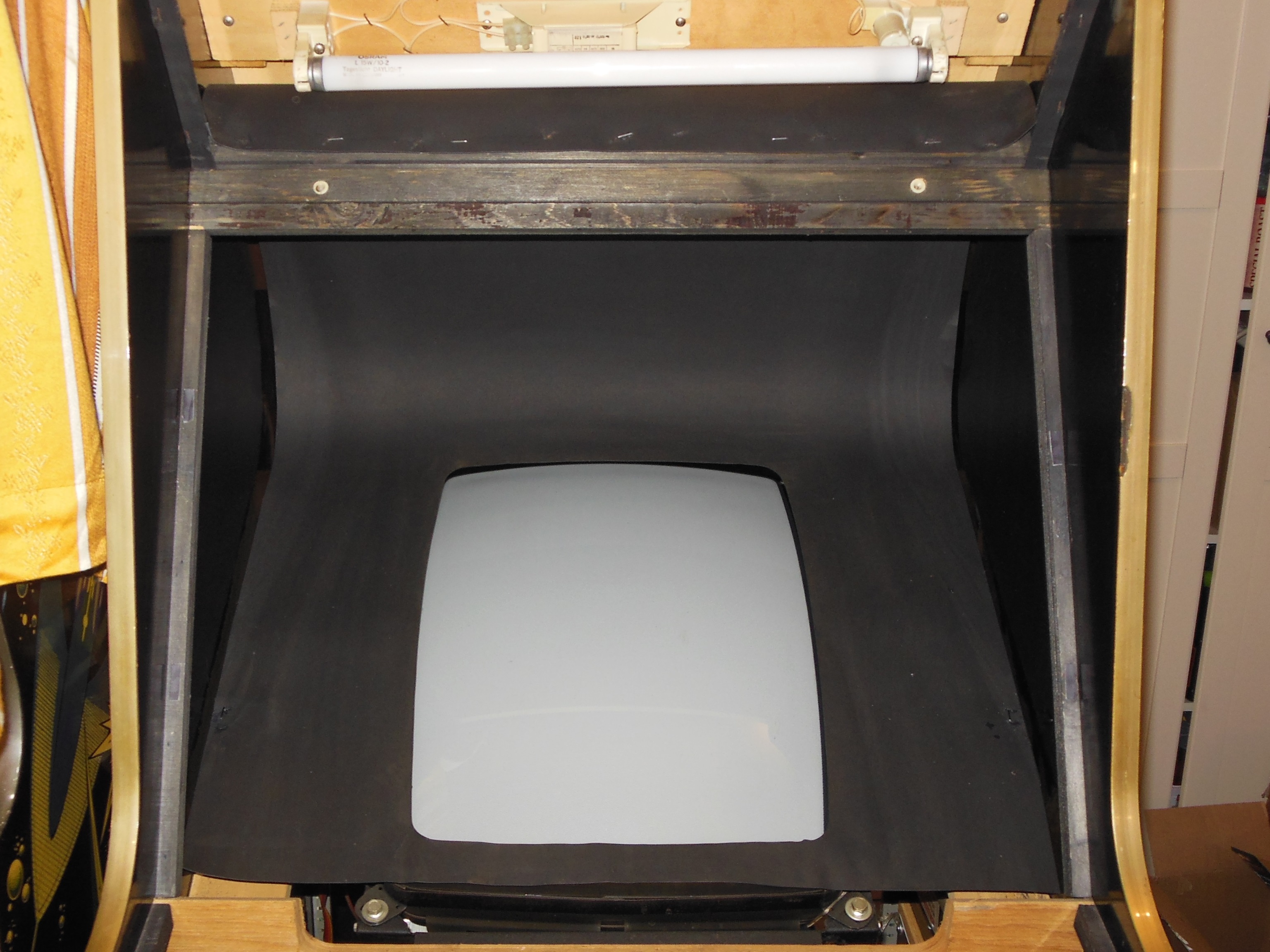 The control panel, monitor glass and marque were removed to allow the surround staples to be pulled out and the surround removed. After a wiped down cleaning with a damp cloth, the surround was set to flatten out.