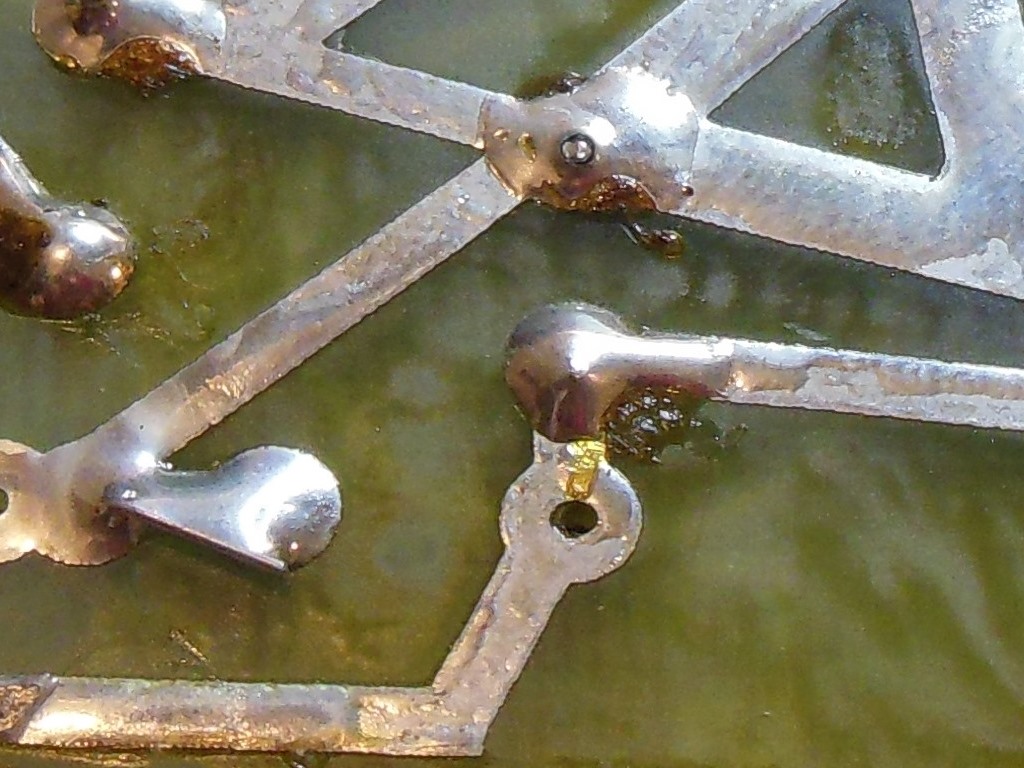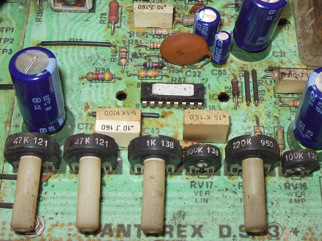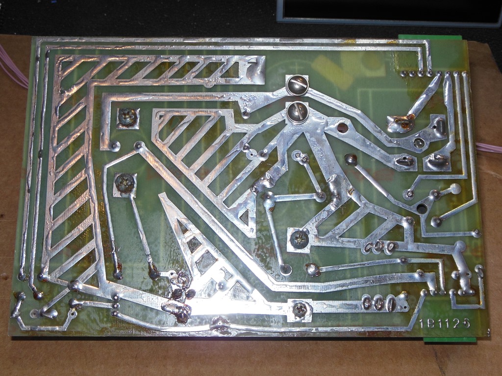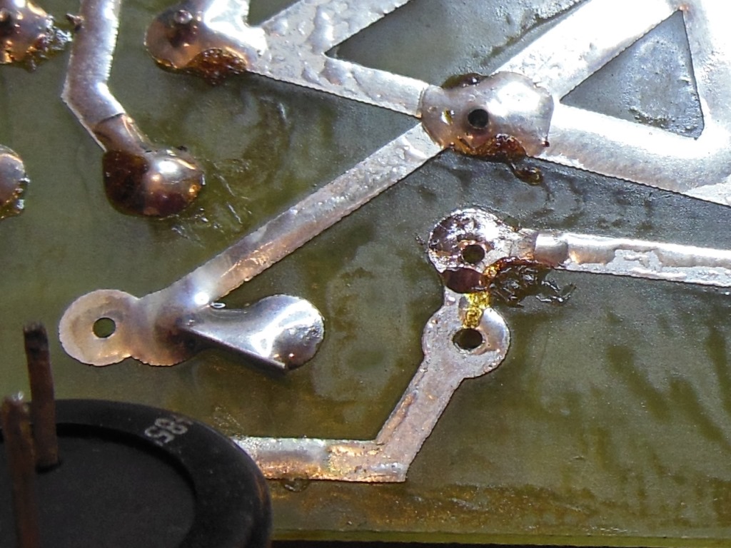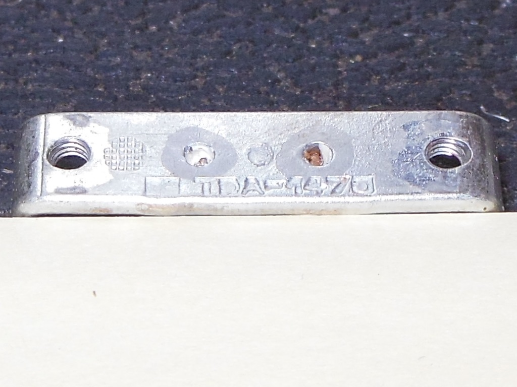 In order to remove the TDA1470, the large "U" heatsink must first be unscrewed followed by the desoldering of the heat sink mounting bracket over the top of the IC. I needed to use a large tip iron and maximum heat to be able to remove the heat sink bracket (hence the charred flux). With the heat sink bracket removed the IC could be de-soldered normally.