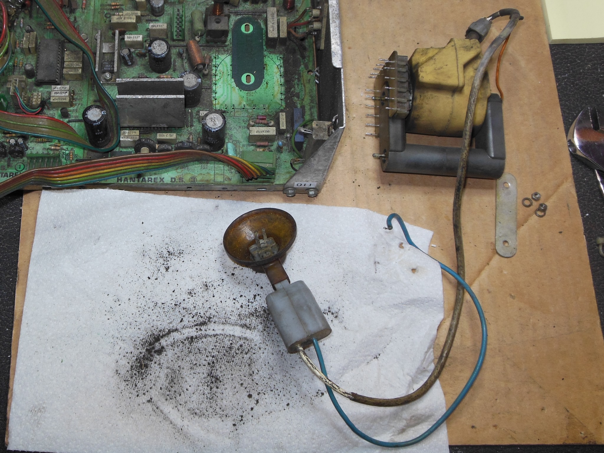 The CRT had already been tested with the rejuvenator and I'd already measured the focus voltage and seen it gradually climb so I suspected that the LOPT or focus bleeder was bad. The LOPT was hissing constantly so I decided to recover a replacement LOPT & bleeder assembly from a spare chassis to go into this one.