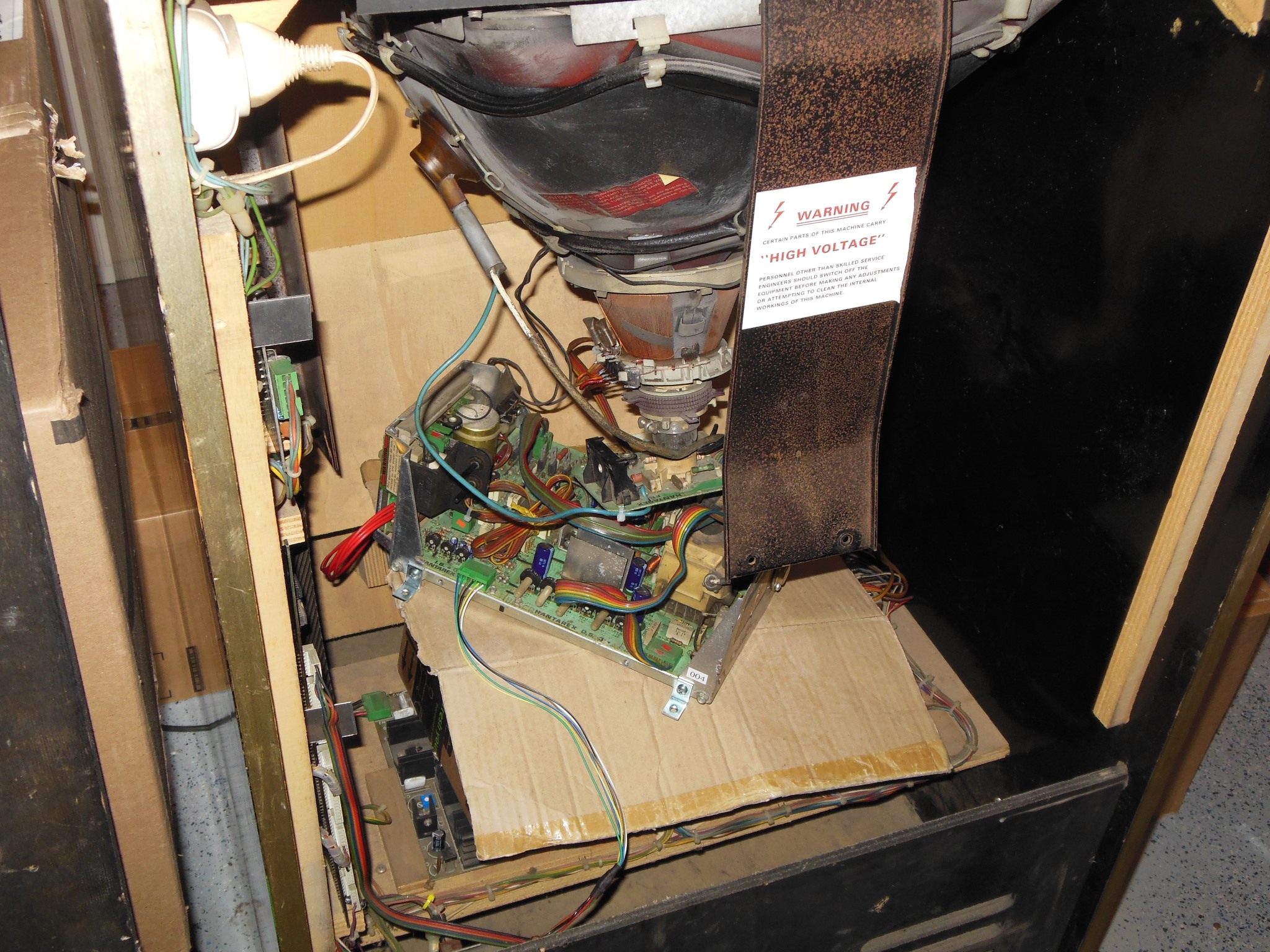 The HT cup on the reclaimed LOPT & bleeder assembly had a broken clasp necessitating a MacGyver repair using a clip from a failed LOPT. After several more hours in the closed cabinet there was still no sign of any focus drift and the game was pronounced fixed ready for show.