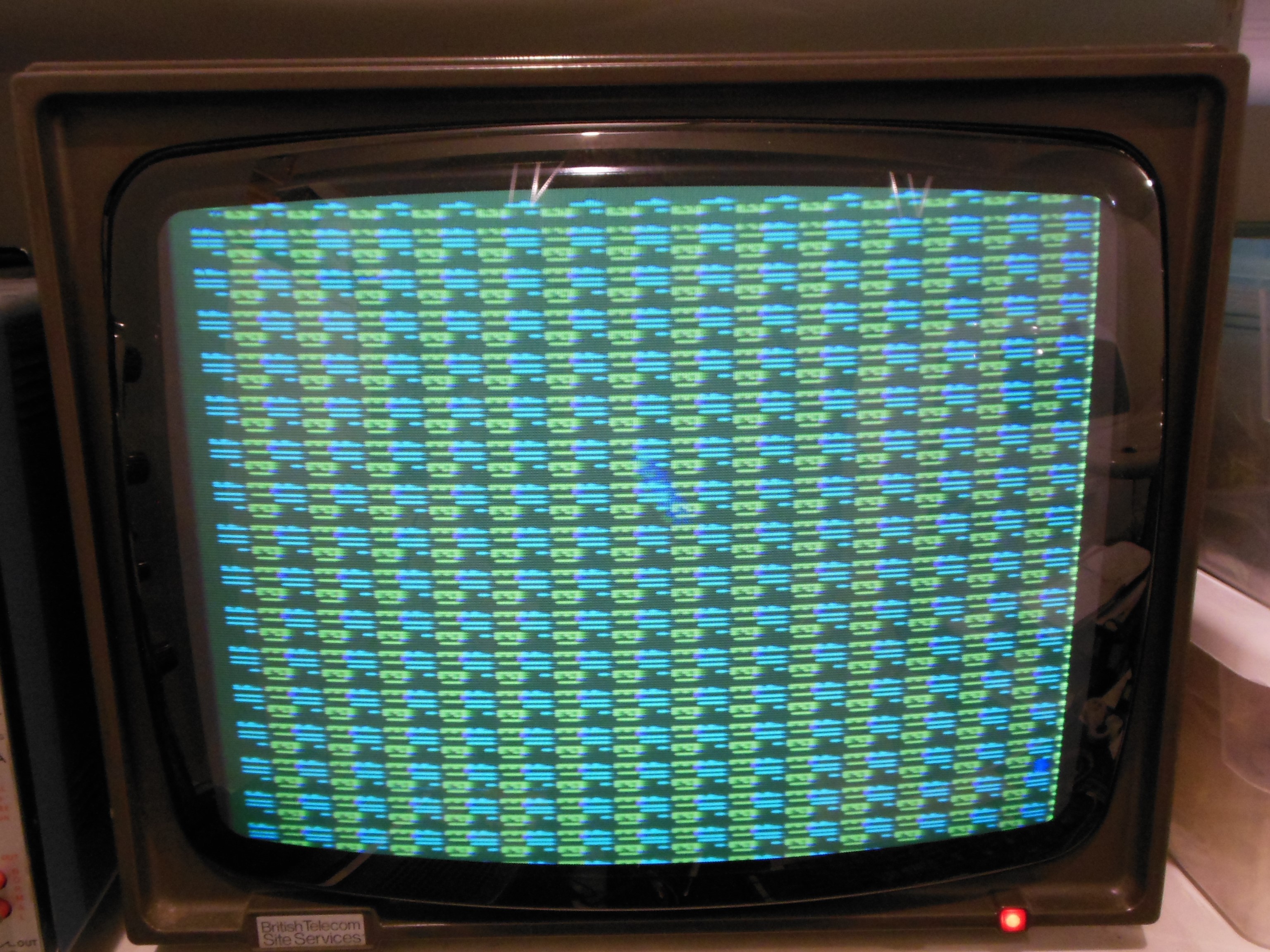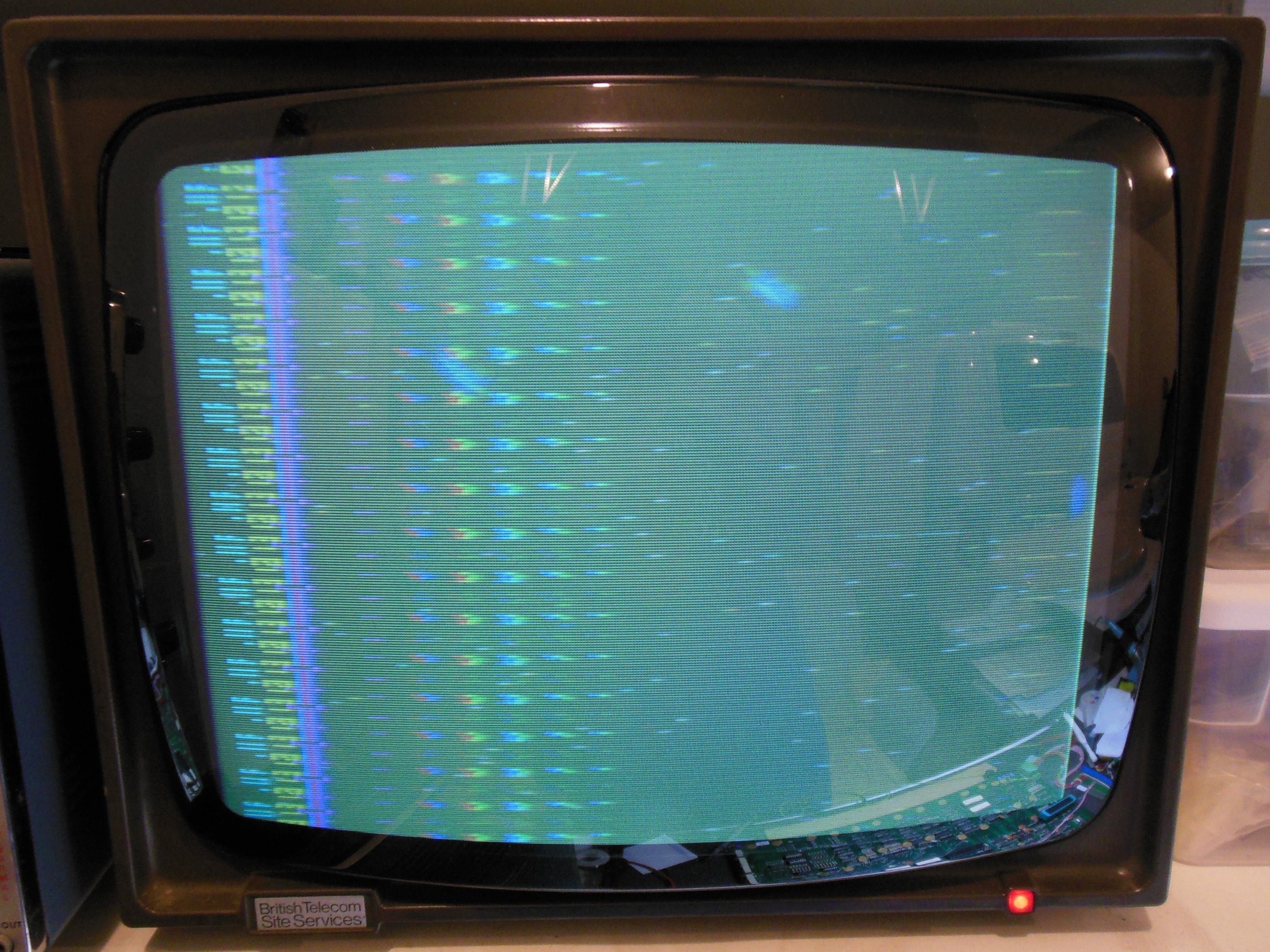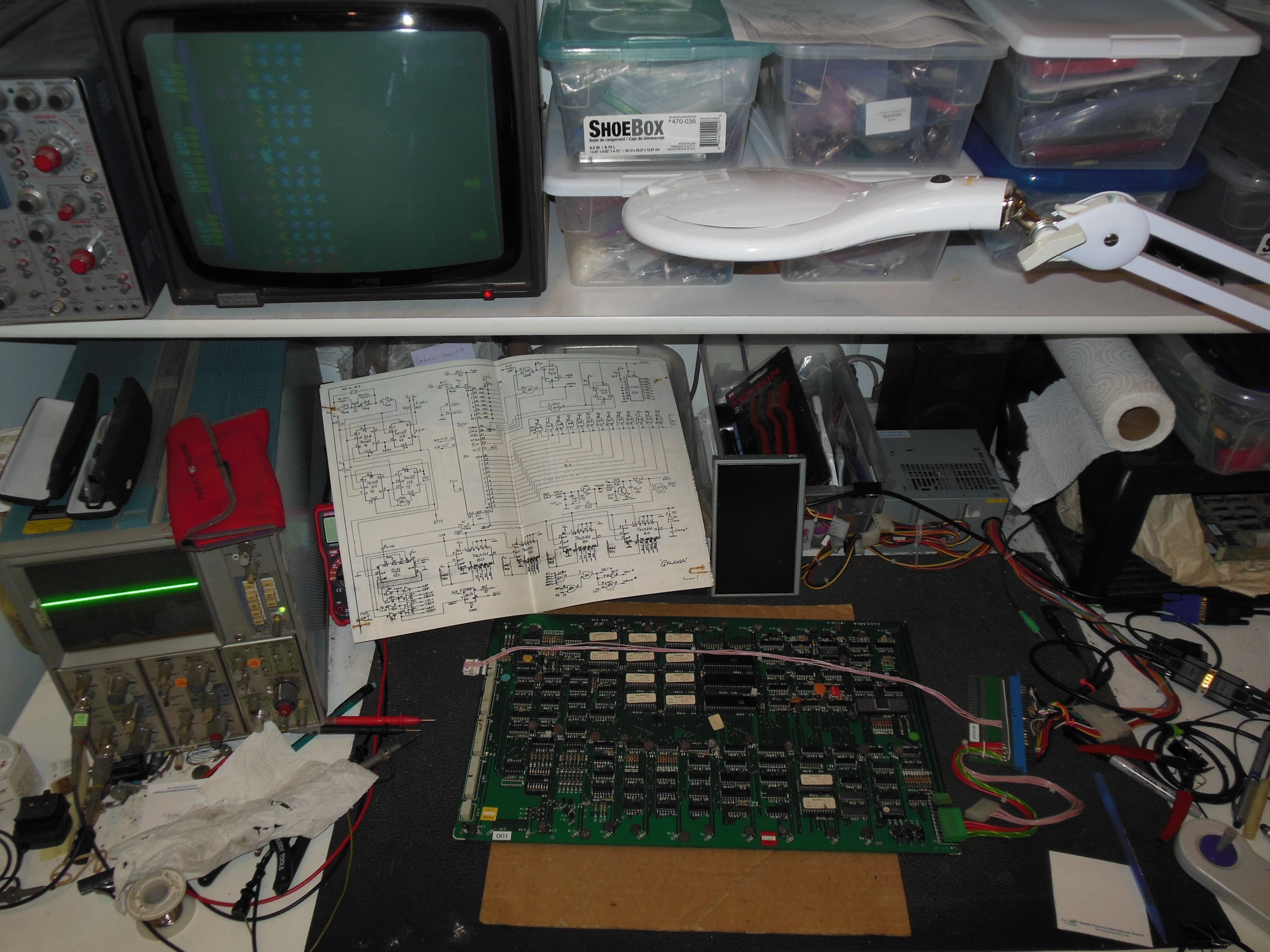 On the bench the game PCB displayed repeated characters across the whole screen.