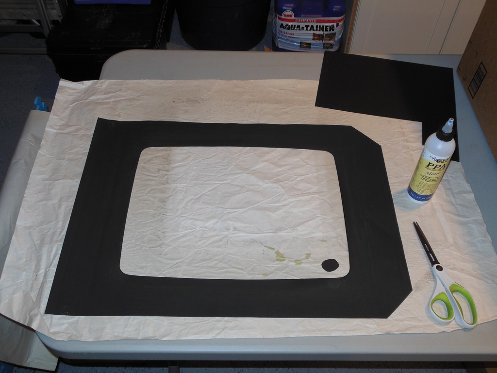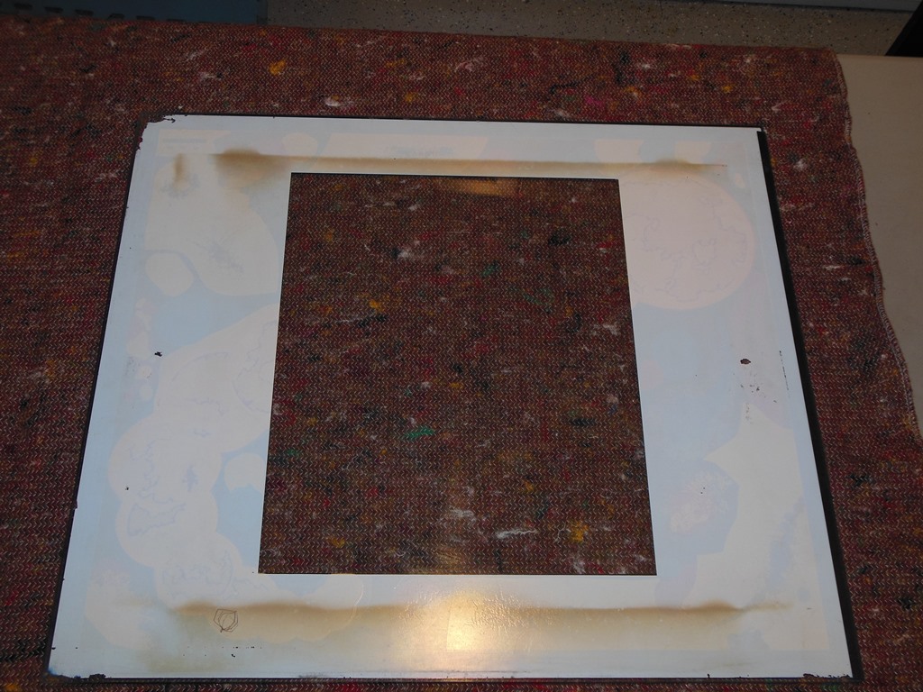 The monitor surround was in pretty good condition and came up looking OK after being cleaned and flattened out. The only repairs needed were over a small tear in the corner and the several generations of staple holes.