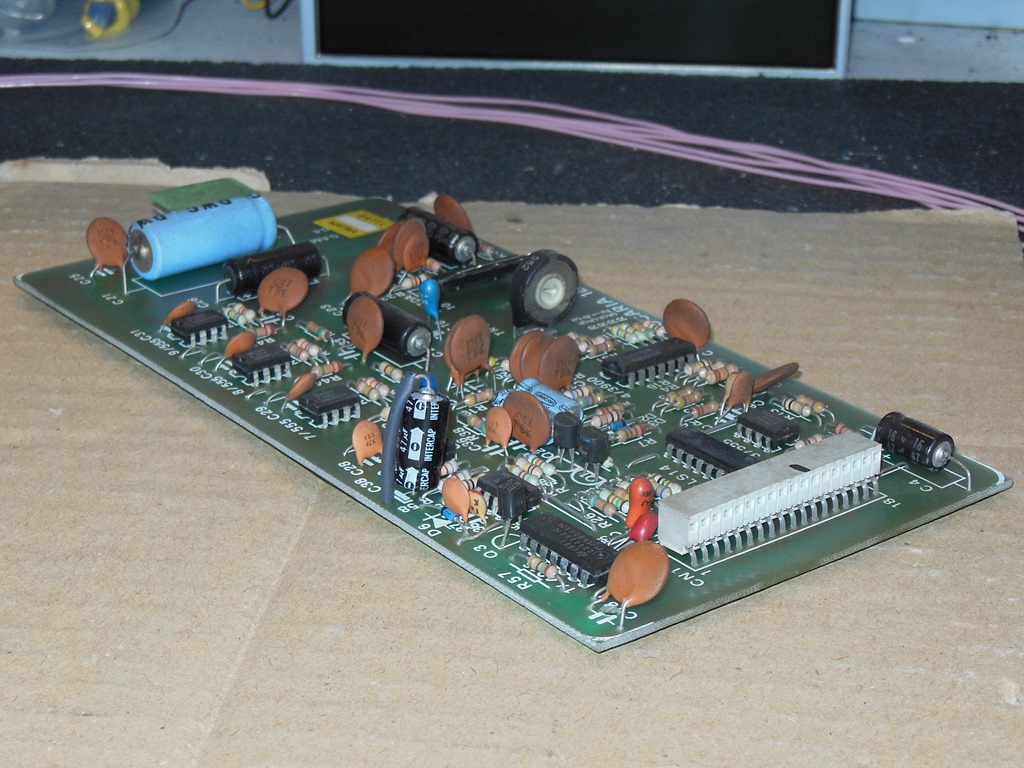 The game played with a number of missing sounds - no invader dive or hit/explosion and the ship fire sound was a bit off. A physical inspection found a broken capacitor at C38 that I replaced with the exact same one from a bag of Radio Shack various. There is a slight design error that allows one pin from this cap to catch on the board guide in the cab. I added a shrink tube sheath around it for additional protection from that.